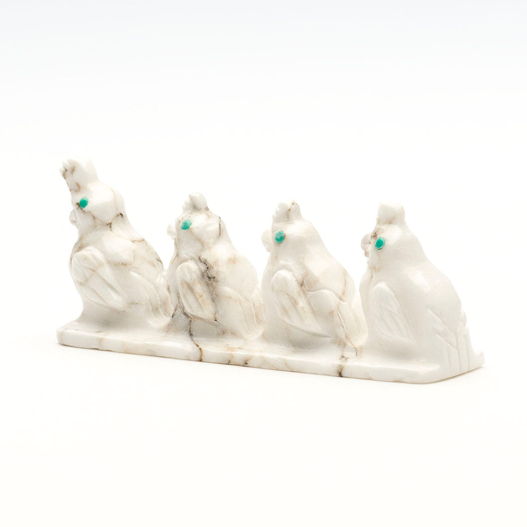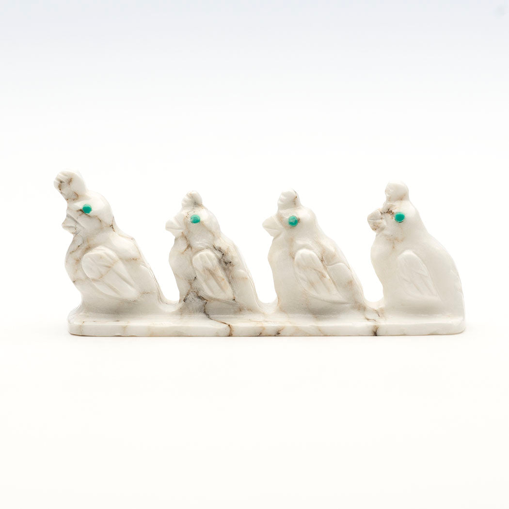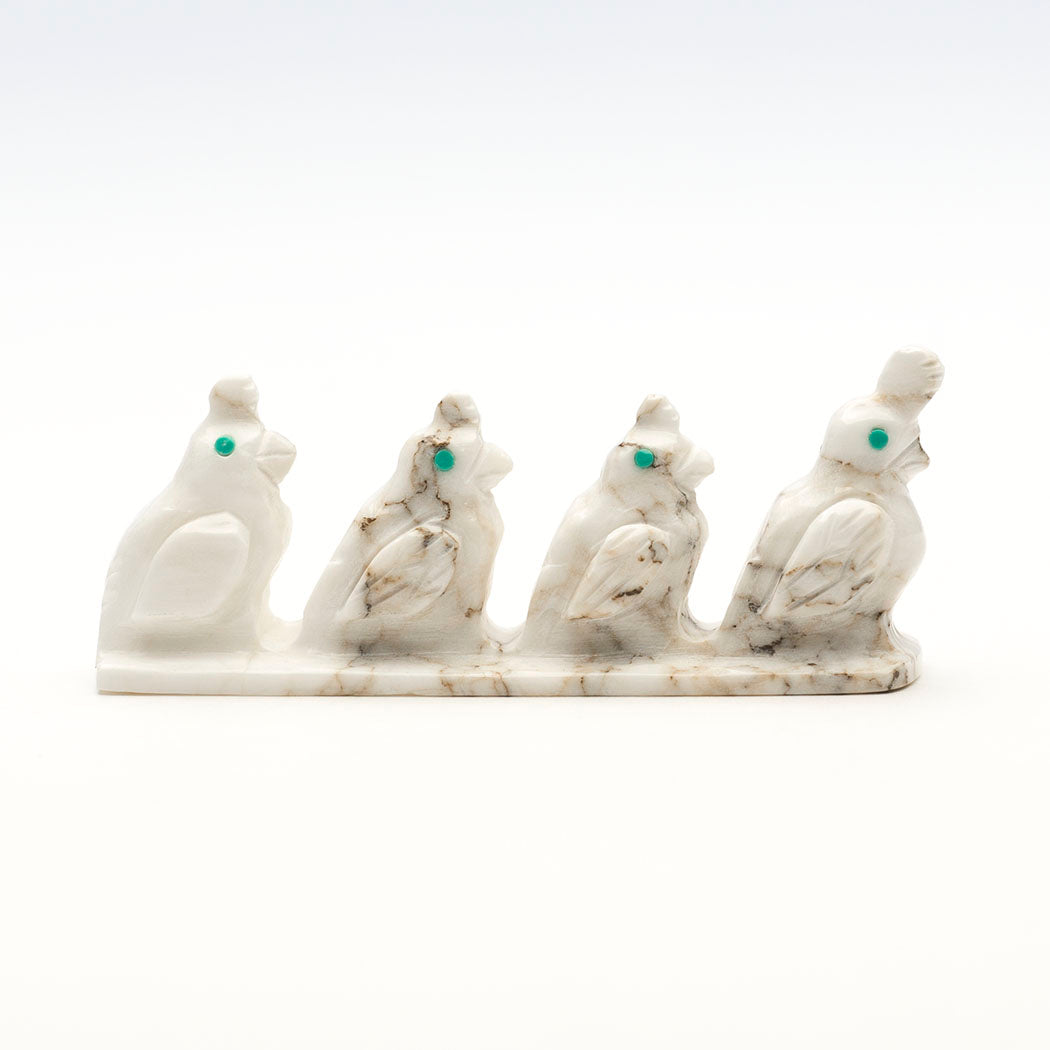 We can help wild quail thrive by encouraging natural plant growth and keeping shrubby and woody edges, places where they like to retreat to when foraging in open areas. Quail enjoy feeding on insects like beetles and aphids which helps control pests naturally. Fabian Tsethlikai's quiet quail family has been sculpted from one marble specimen. They each have adorable top knots and eyes from turquoise inlays. About 2 5/8" long, 5/8" wide and 1" tall.