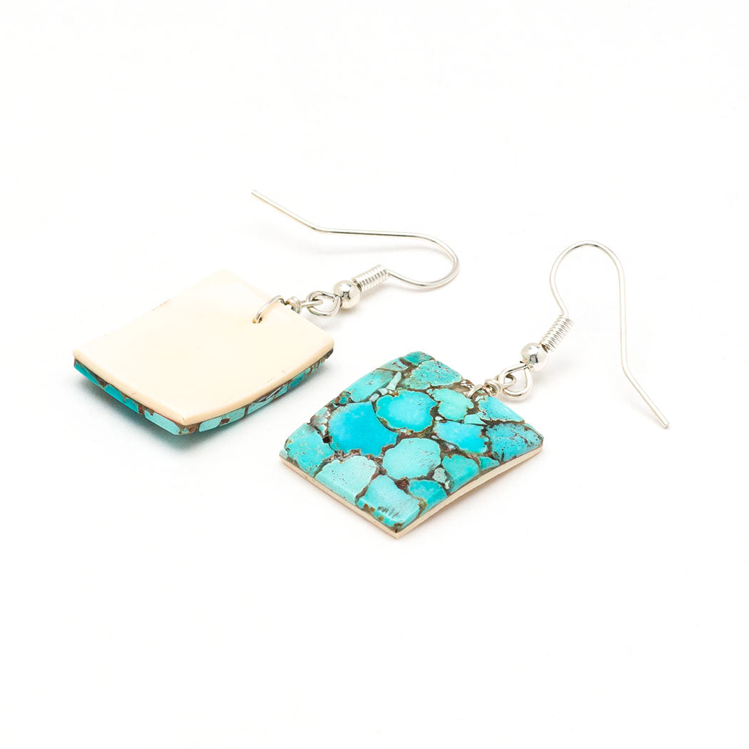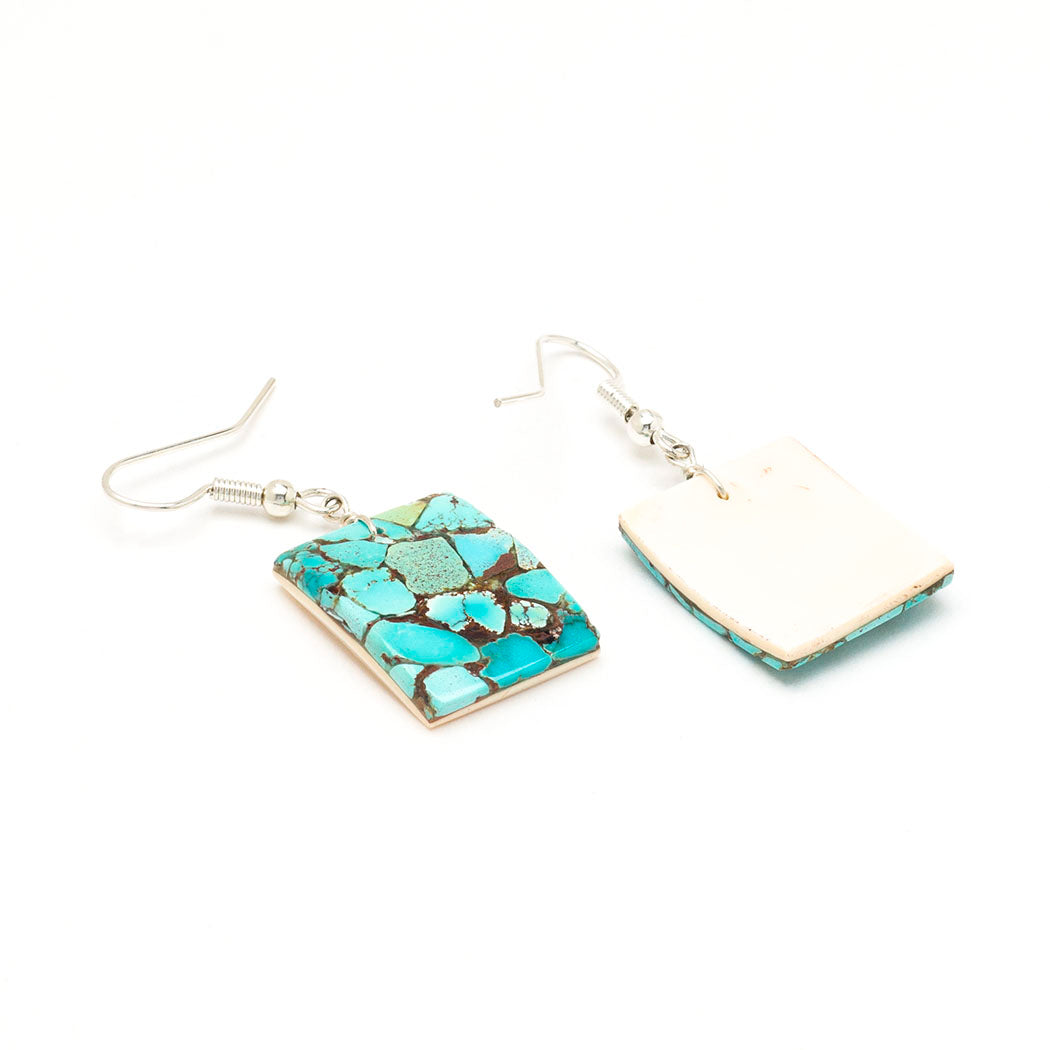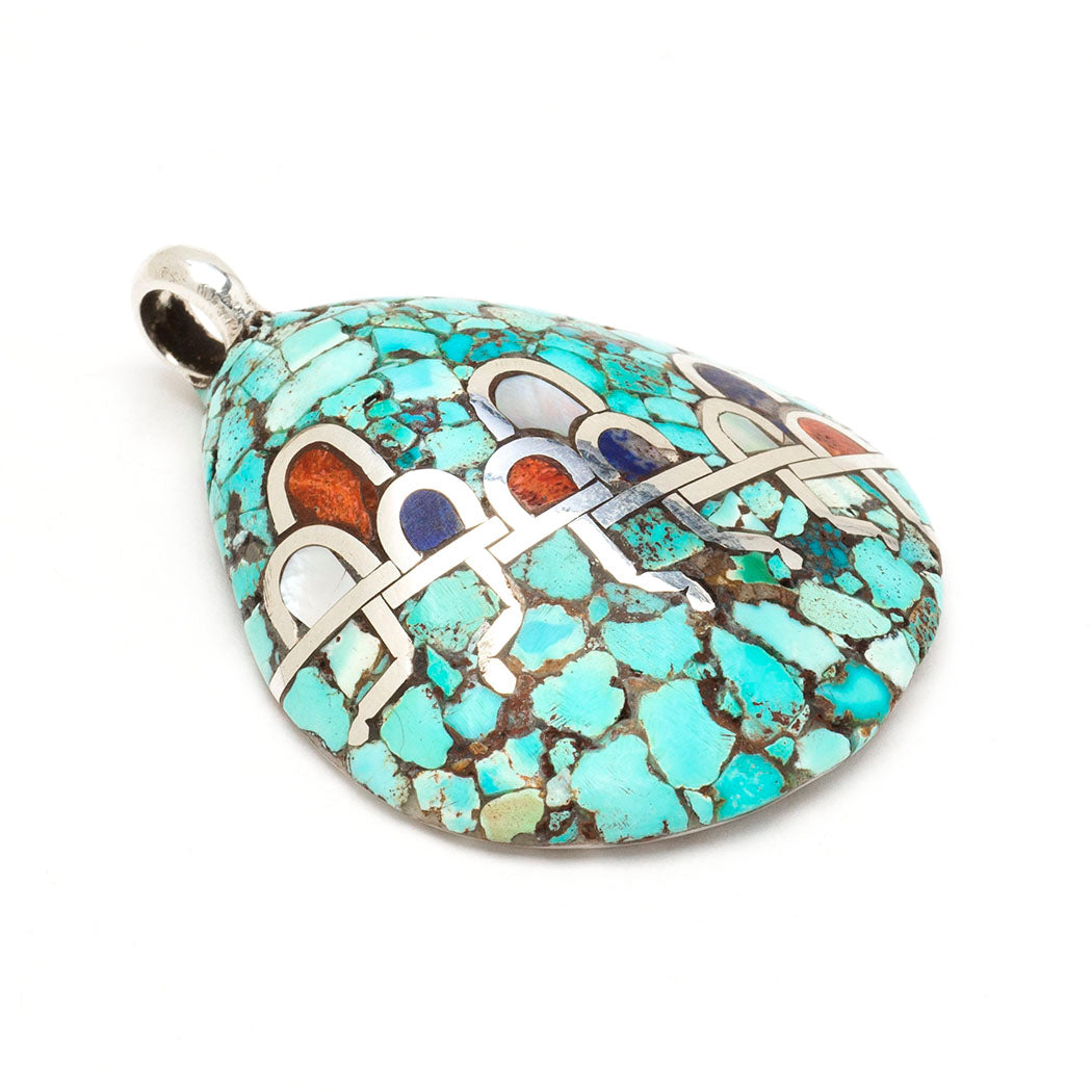 Allison Melton is a wonderful mosaic artist whose creations are of exceptional quality. Traditional Kewa mosaic work is a two-dimensional art form that involves covering a surface with small pieces of materials, like stones and shell. The pattern in this colorful pendant forms a trio of stunning rainclouds from sterling silver, lapis lazuli, coral and mother-of-pearl. Surrounding pieces are from rich Sleeping Beauty turquoise. Everything is skillfully overlaid on a lovely bivalve shell. Including the silver bale, measurements of this pendant are approximately 2 1/4" long, roughly 1 3/4" wide and 1/2" deep. The complimenting and slightly convex dangle earrings are also from Sleeping Beauty turquoise pieces overlaid on a bed of shell. Including the hooks, they grace the face at a lightweight 1 5/8" long, 5/8" wide and 1/8" deep, dimensions are approximate. Don't miss this 3-piece set exquisitely hand-crafted.