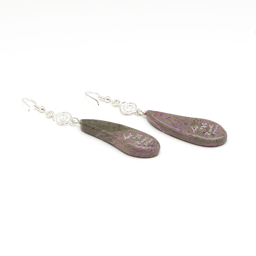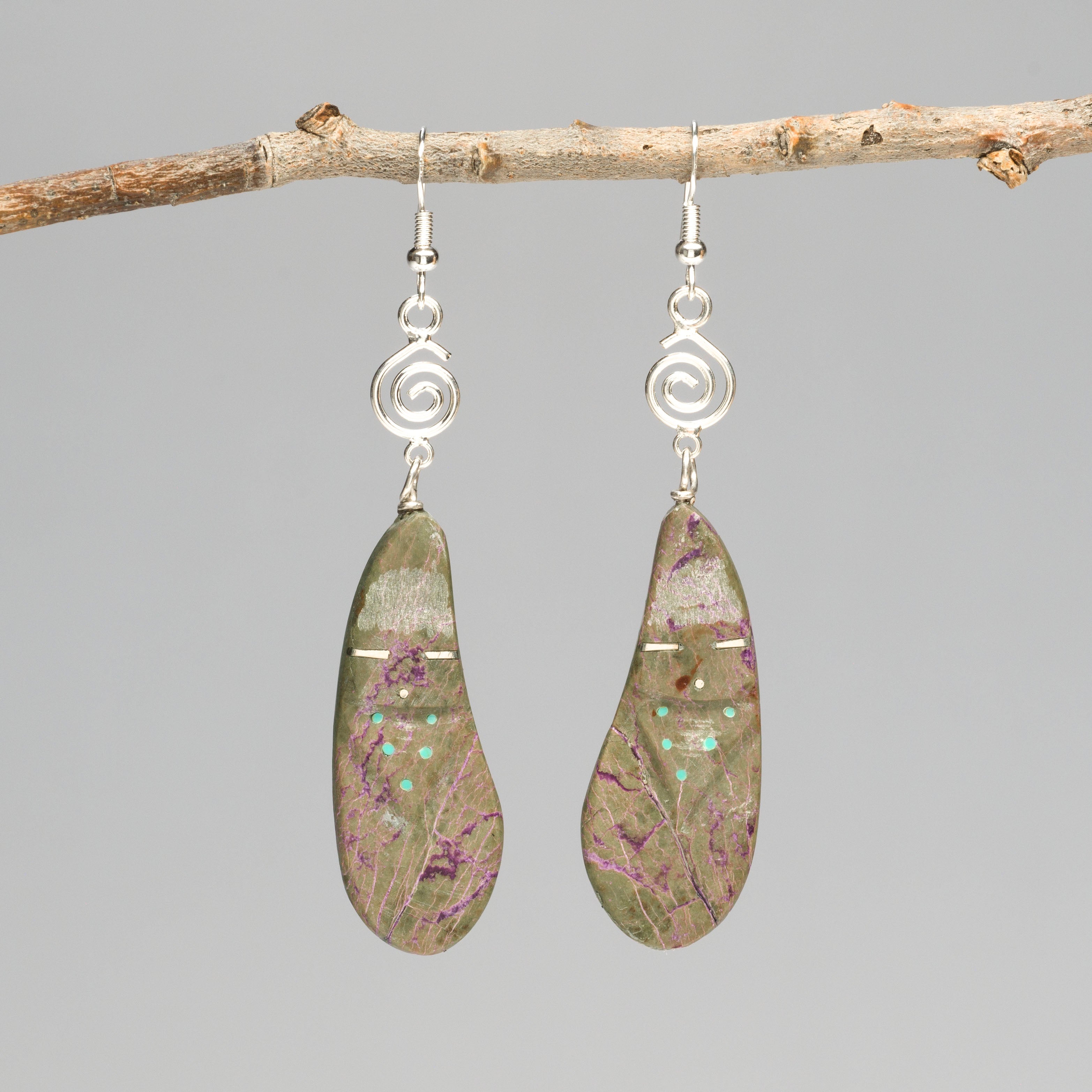 Carved from gorgeous stichtite and inlaid with turquoise, Todd Westika's Maiden dangle earrings are about 3 1/4" long, 5/8" wide and 1/8" deep, measurements include the hooks. Stichtite is said to help in letting go of negative experiences and making pathways in forgiveness. Lovely sterling silver spiral elements adorn these lightweight earrings, perhaps representative of migration or life's journey. Facial features are from sterling silver inlays. Signed by the artist.