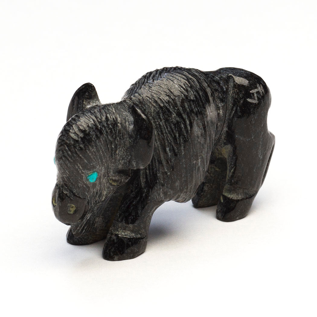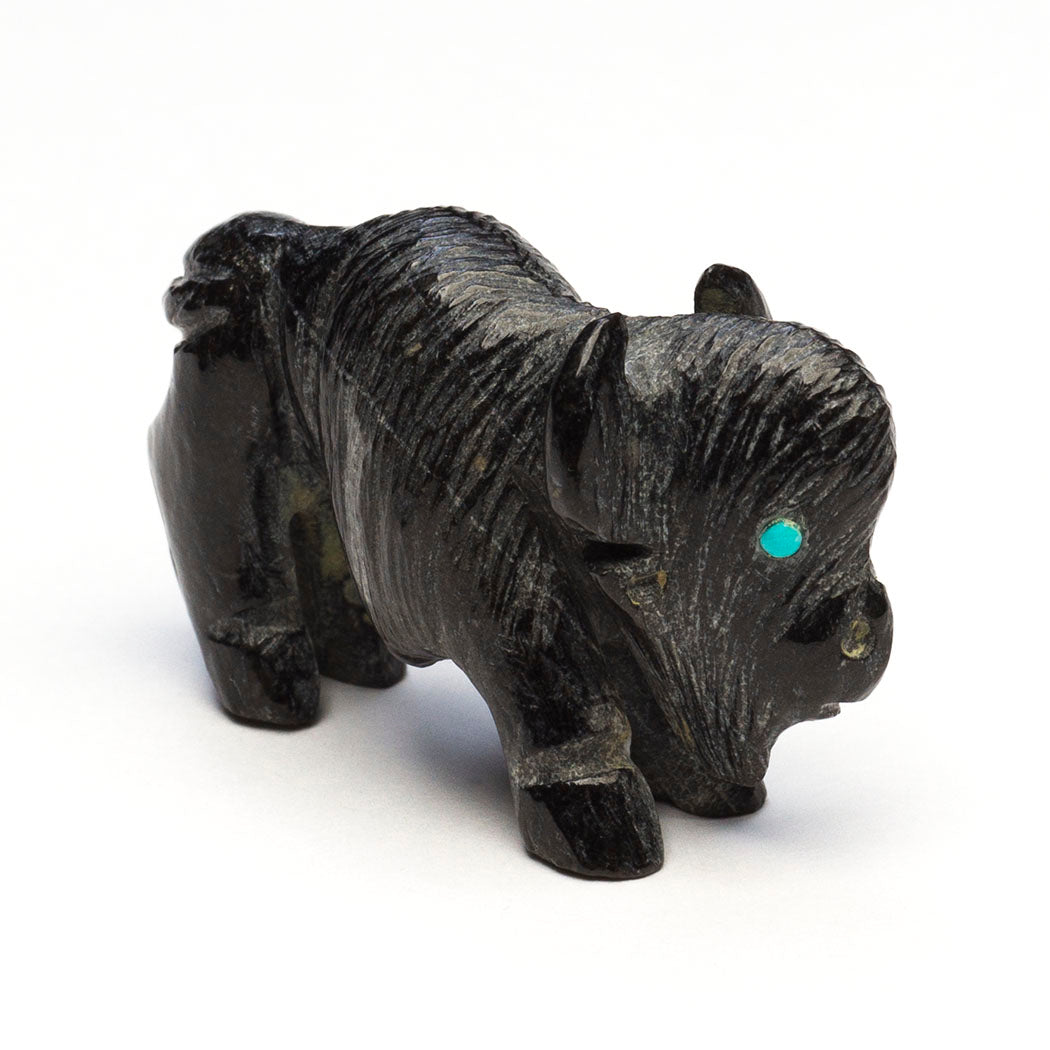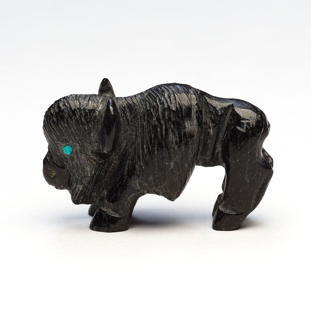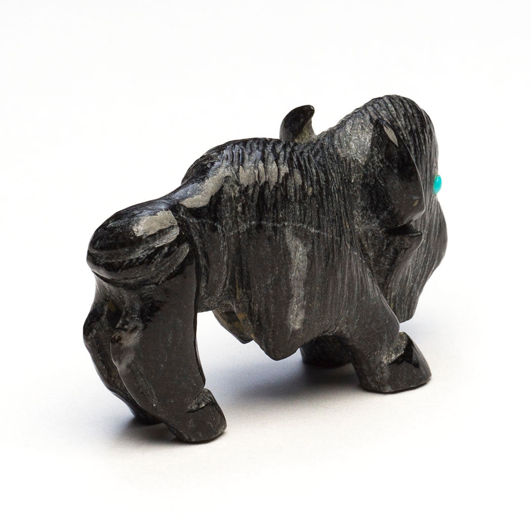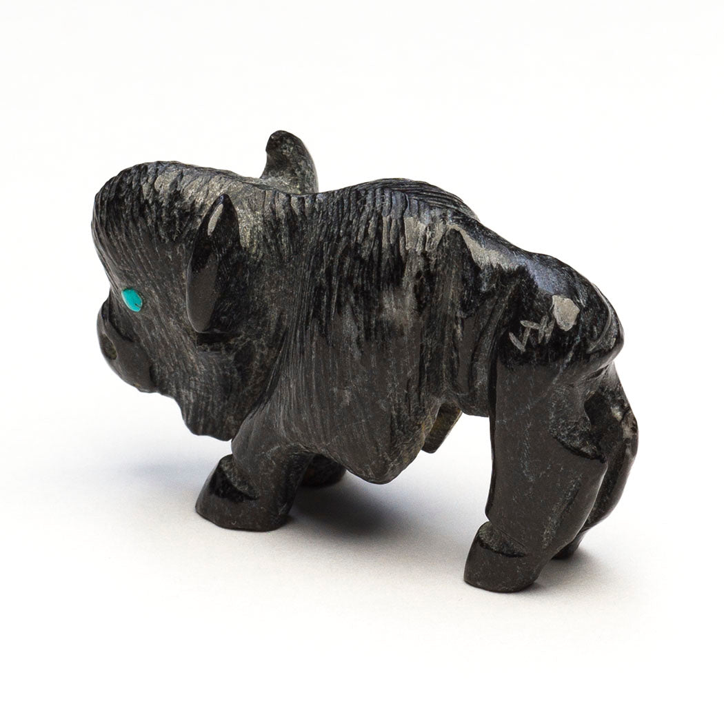 A whipped up tail, etched fur, turquoise inlaid eyes and a pair of curved horns are great features to be had in Jonas Hustito's small marble Bison. Horns provide the ability to fend off predators. Jonas incised his initials on the hip area of this approximately 1 3/4" long, 3/4" wide and 1 1/8" tall bovine who reminds us to be thankful everyday for the abundance, never taking these blessings for granted.