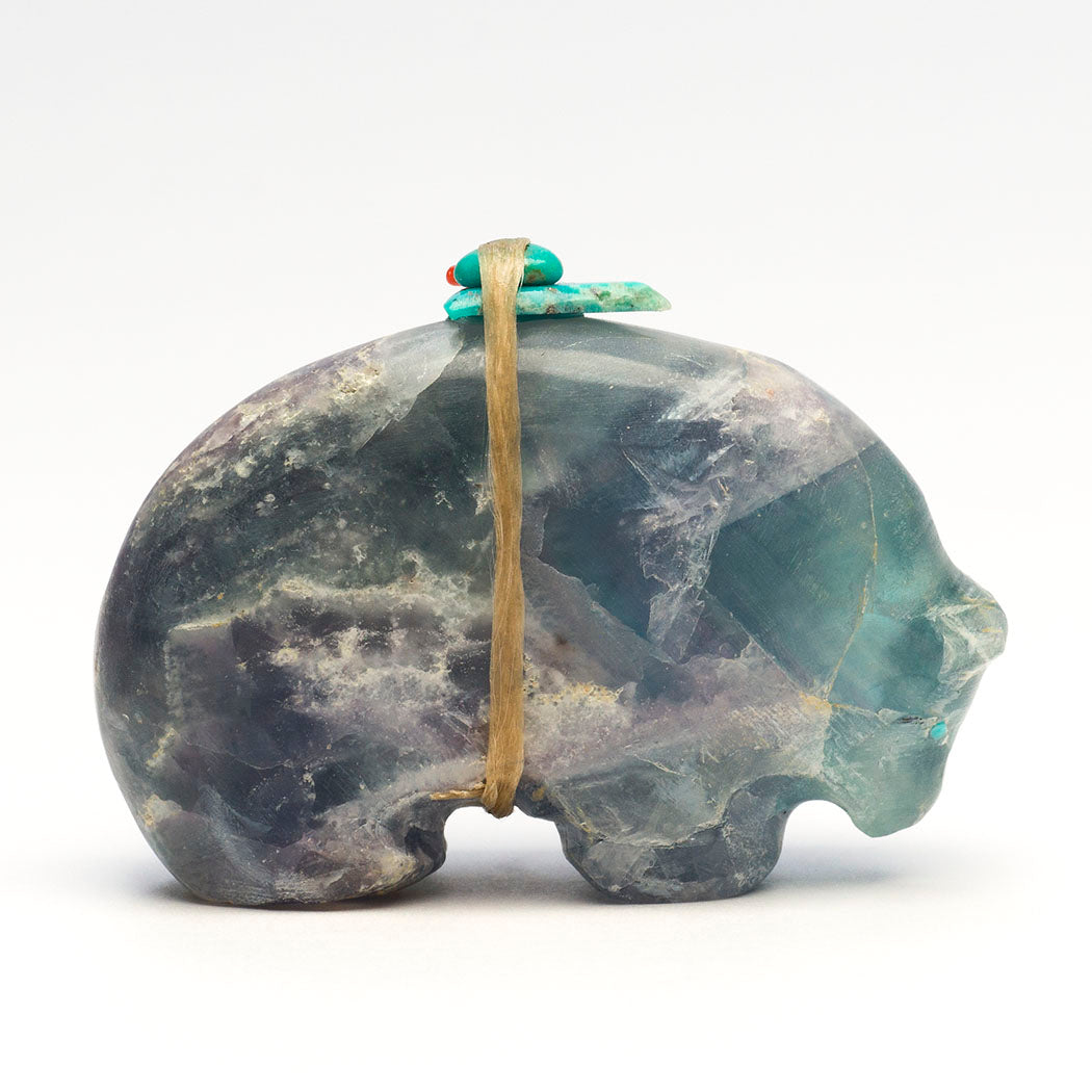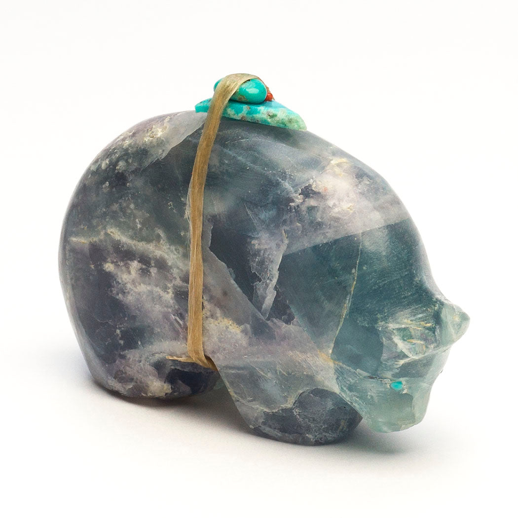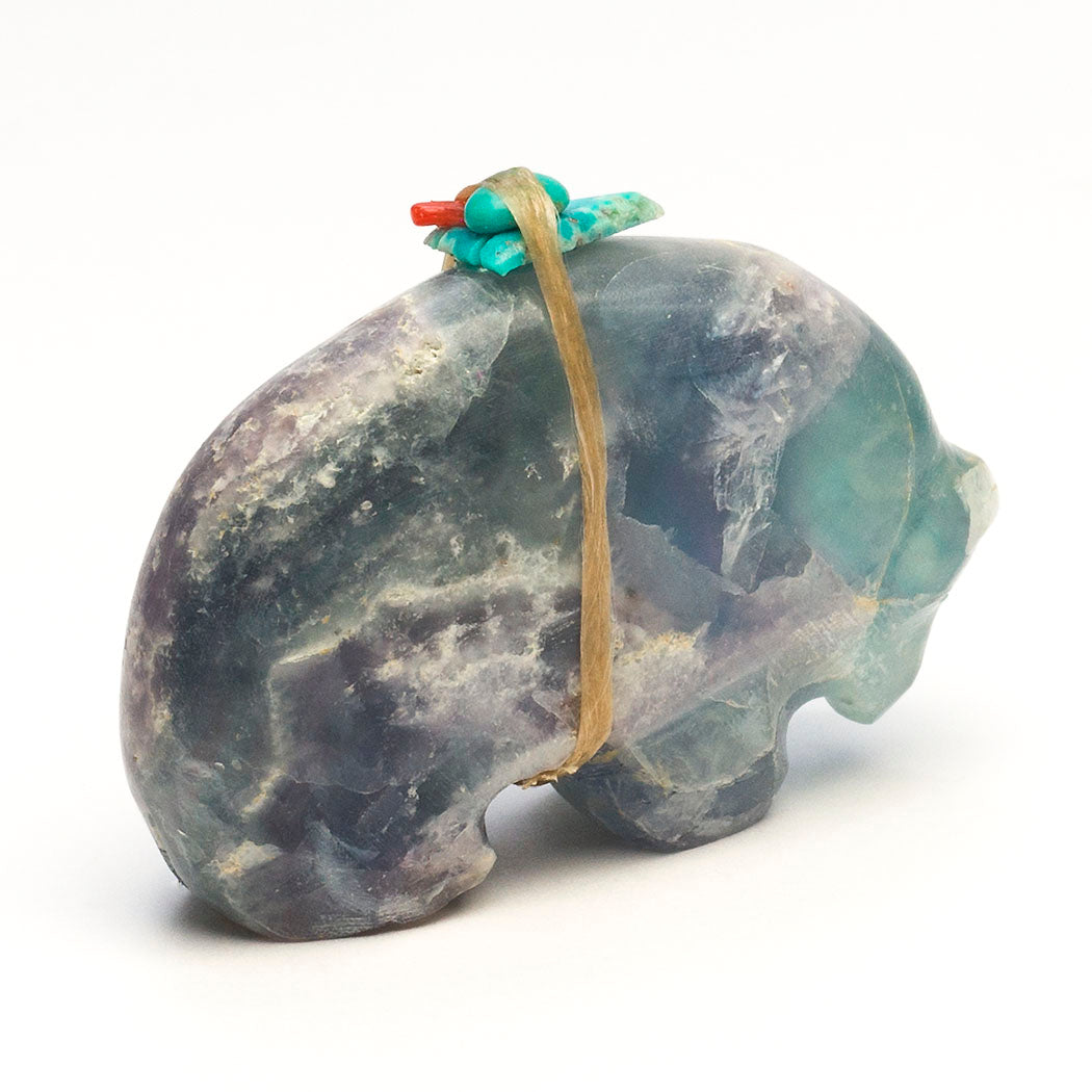Bears go into a resting state called torpor to sustain themselves when times are lean. This vital healing takes place in a den or cave. A Medicine-bear with turquoise eyes is carved with a rounded back meant to mimic the entrance where it goes to renew. Jimmy Yawakia's harmoniously formed fluorite friend is about 2 1/4" long, 3/4" wide and 1 3/4" tall. Soft teal blue and purple hues reside in the specimen. The color purple is said to have healing benefits.