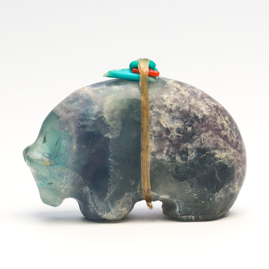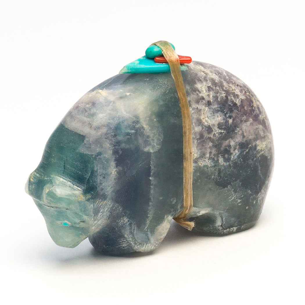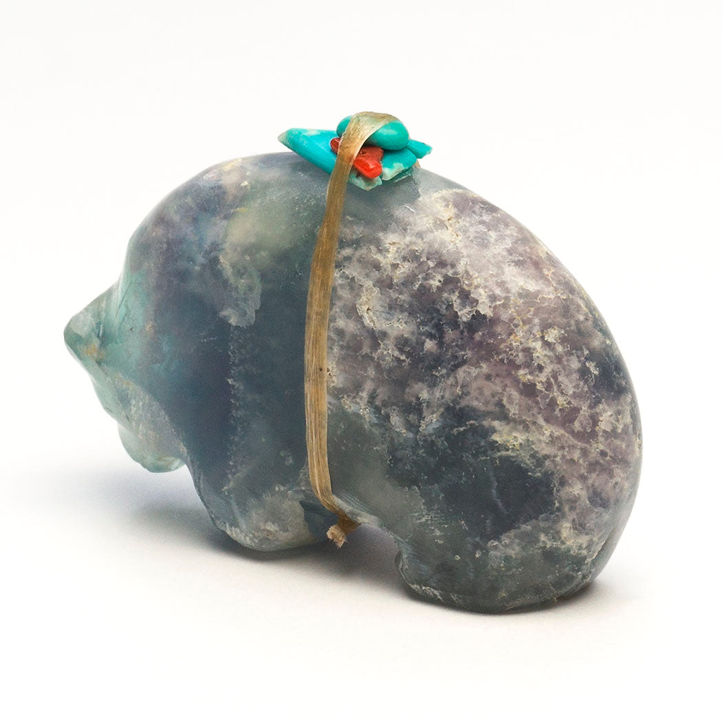 Bears go into a resting state called torpor to sustain themselves when times are lean. This vital healing takes place in a den or cave. A Medicine-bear with turquoise eyes is carved with a rounded back meant to mimic the entrance where it goes to renew. Jimmy Yawakia's harmoniously formed fluorite friend is about 2 1/4" long, 3/4" wide and 1 3/4" tall. Soft teal blue and purple hues reside in the specimen. The color purple is said to have healing benefits.