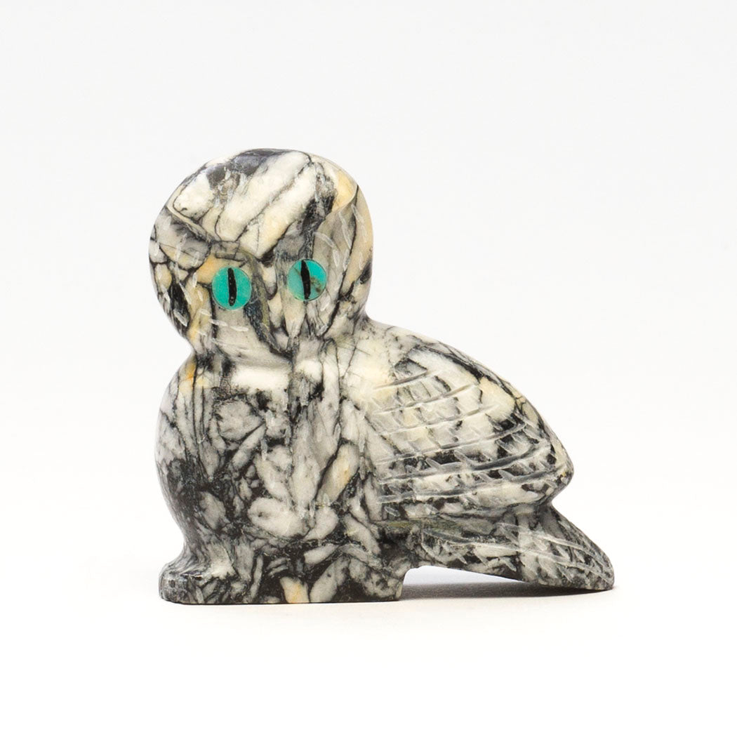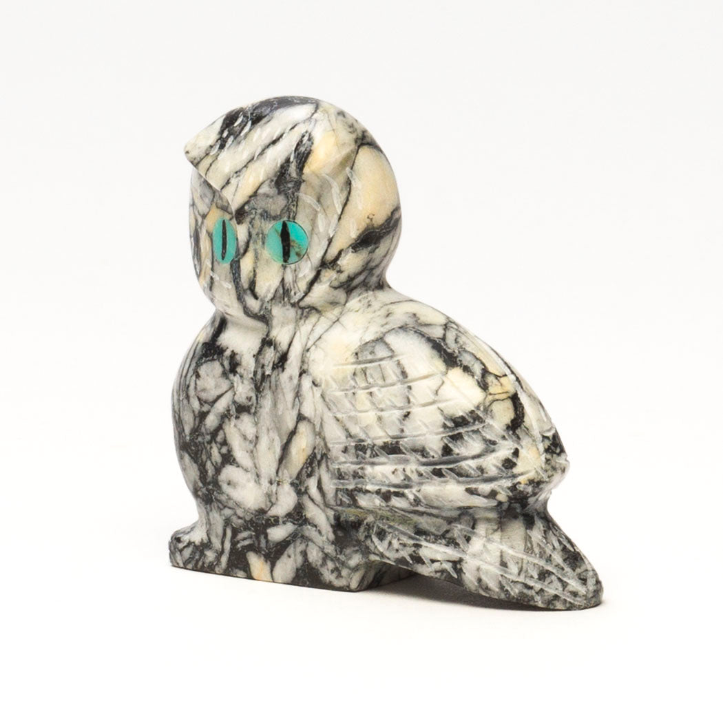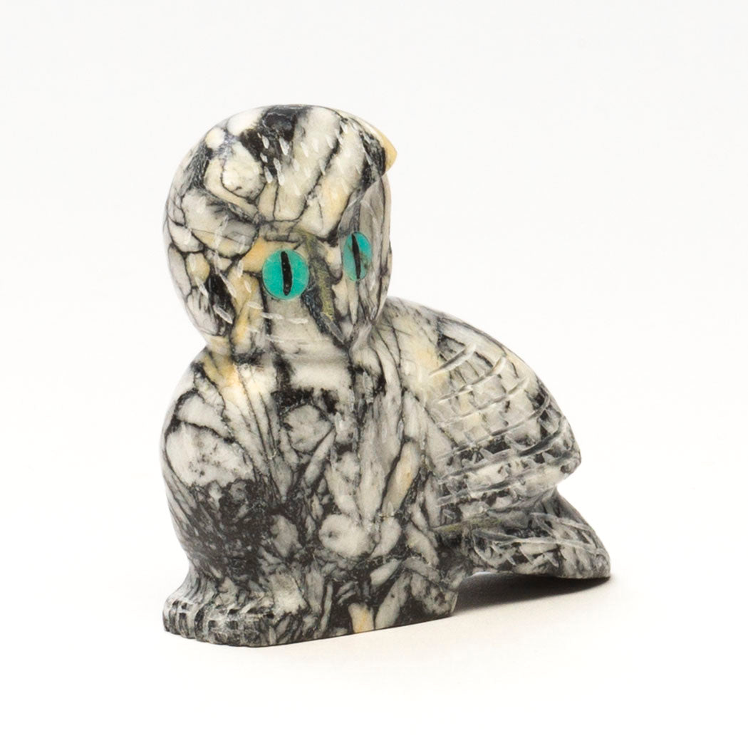 Andres Lementino's tufted Owl with unique eyes from jet in turquoise inlays has a quiet wisdom and strength teaching us it is okay to trust in a wise friend. Pinolith stone consists of magnesite, dolomite and graphite that slowly cooled ages ago forming a striking pattern resembling pine kernels, hence its name. About 2 1/4" long, 5/8" wide and 2 1/8" tall.
