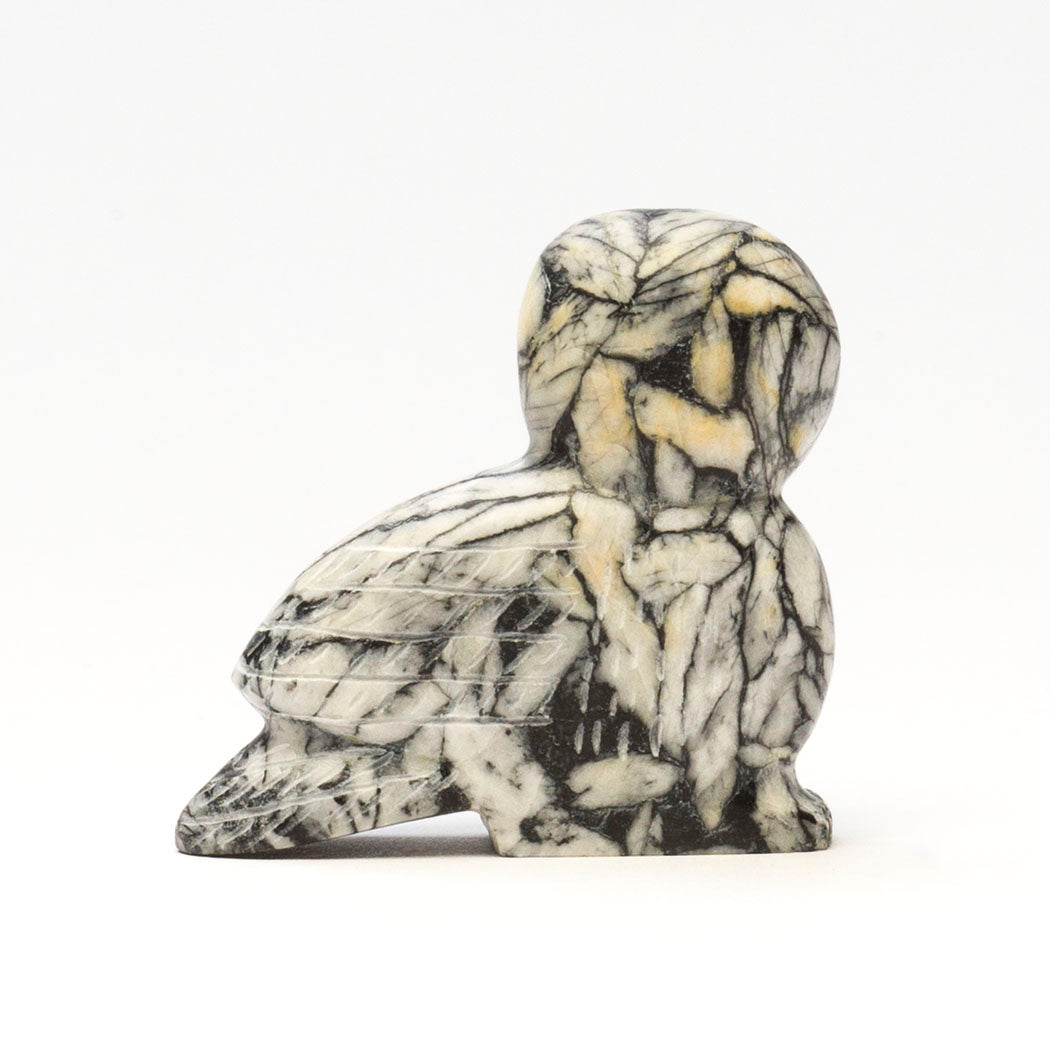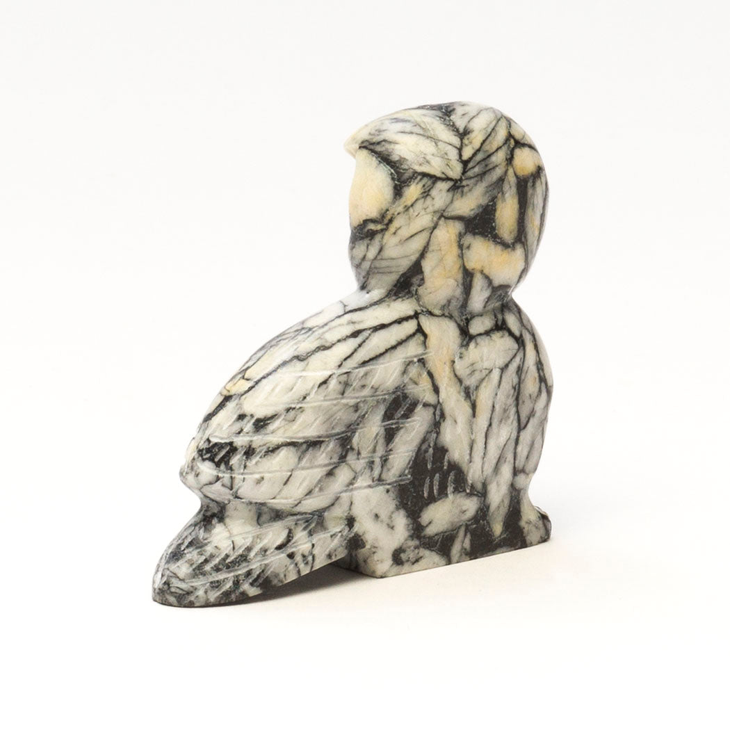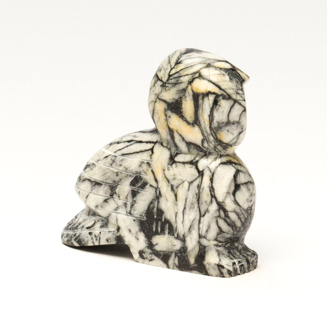 Andres Lementino's tufted Owl with unique eyes from jet in turquoise inlays has a quiet wisdom and strength teaching us it is okay to trust in a wise friend. Pinolith stone consists of magnesite, dolomite and graphite that slowly cooled ages ago forming a striking pattern resembling pine kernels, hence its name. About 2 1/4" long, 5/8" wide and 2 1/8" tall.