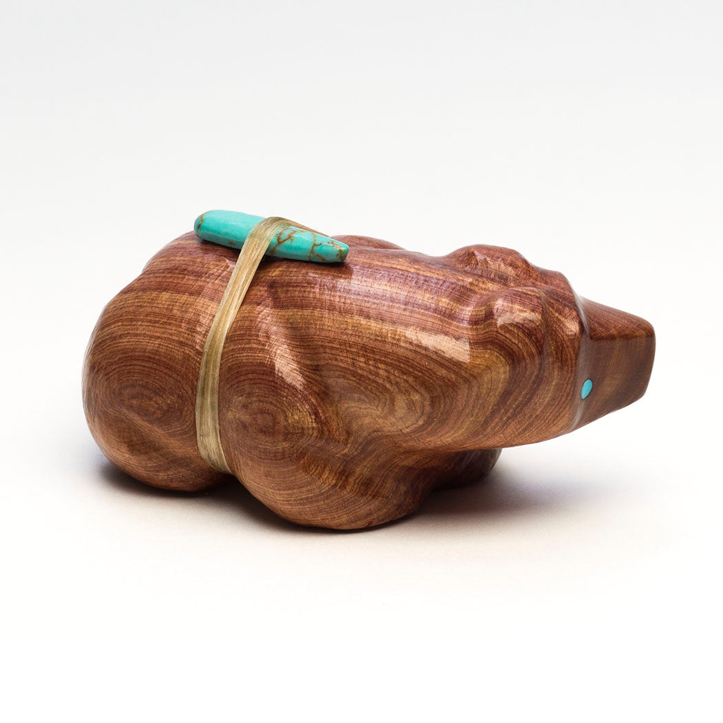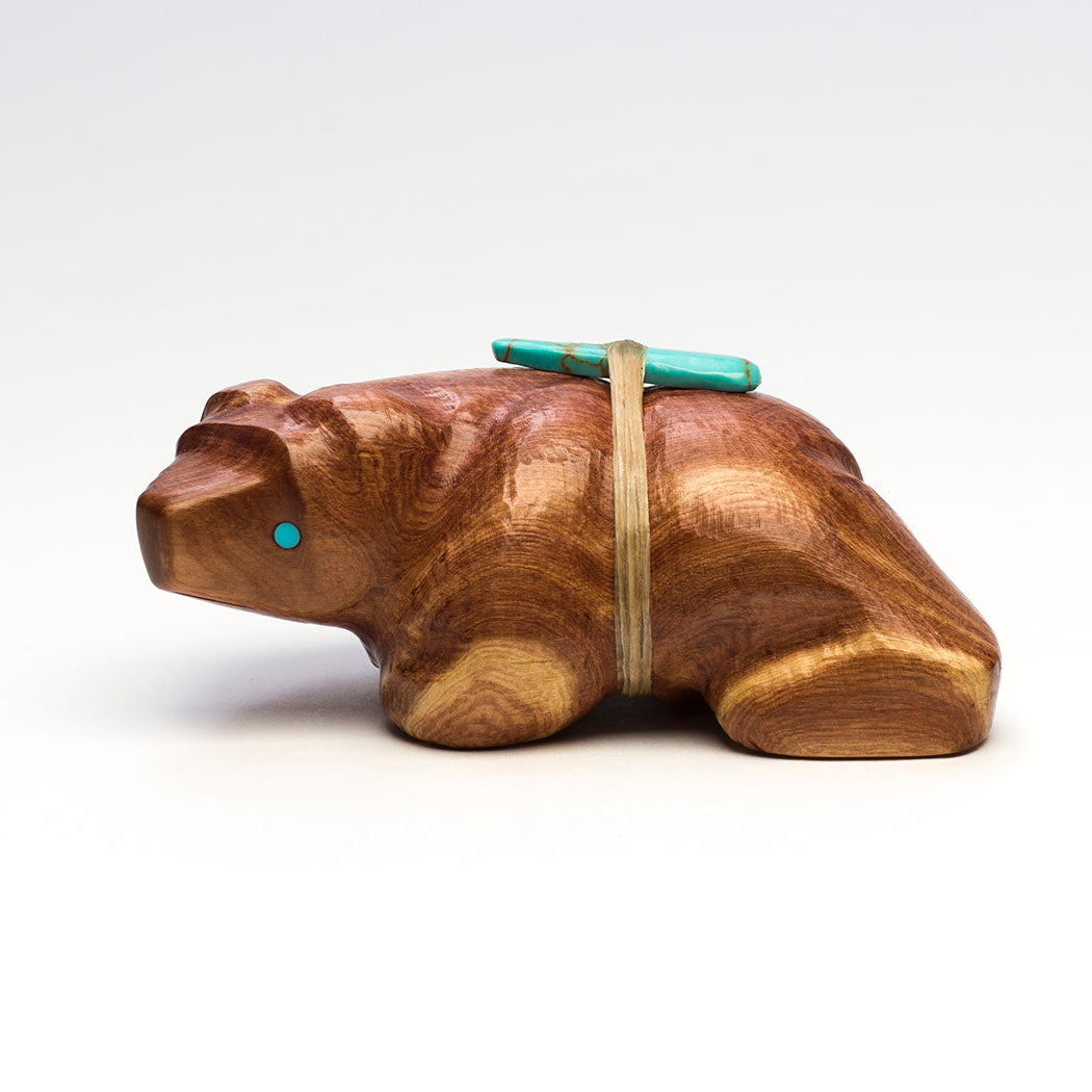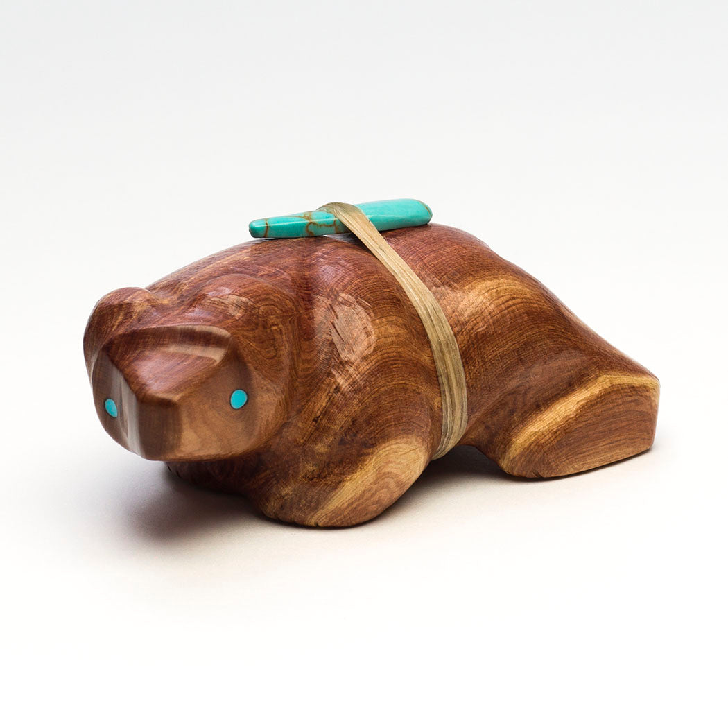 Herbert Halate's walking Bear is carved from naturally fragrant cedar wood and inlaid with friendly eyes from turquoise. The natural grains and formations of the wood specimen are intriguing resembling rolling hills. A bear's animal medicine or how it lives in nature, teaches us that we can summon similar internal qualities like strength and journeying. About 3 5/8" long, 2" wide and 1 1/2" tall.