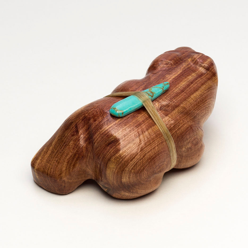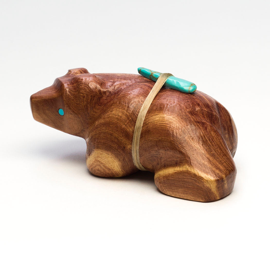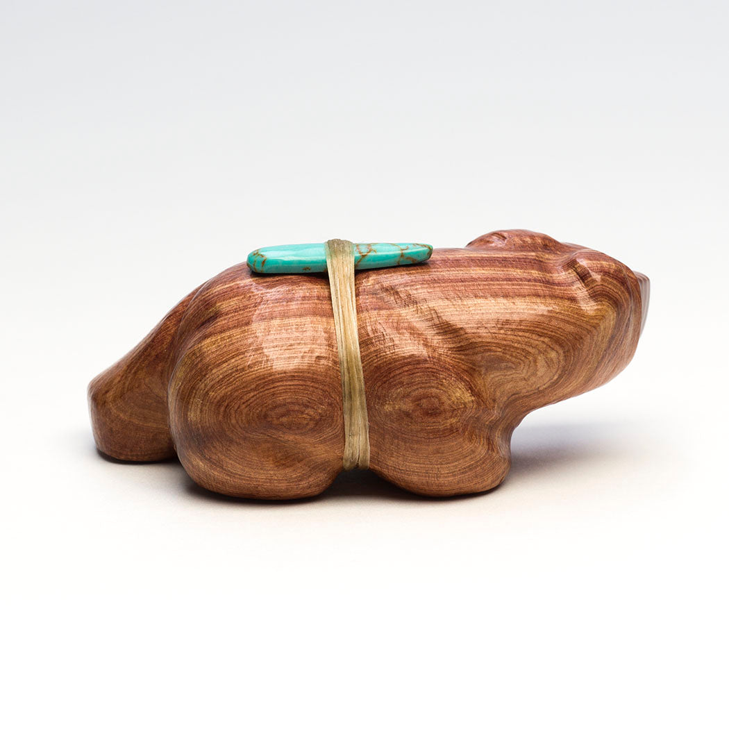 Herbert Halate's walking Bear is carved from naturally fragrant cedar wood and inlaid with friendly eyes from turquoise. The natural grains and formations of the wood specimen are intriguing resembling rolling hills. A bear's animal medicine or how it lives in nature, teaches us that we can summon similar internal qualities like strength and journeying. About 3 5/8" long, 2" wide and 1 1/2" tall.