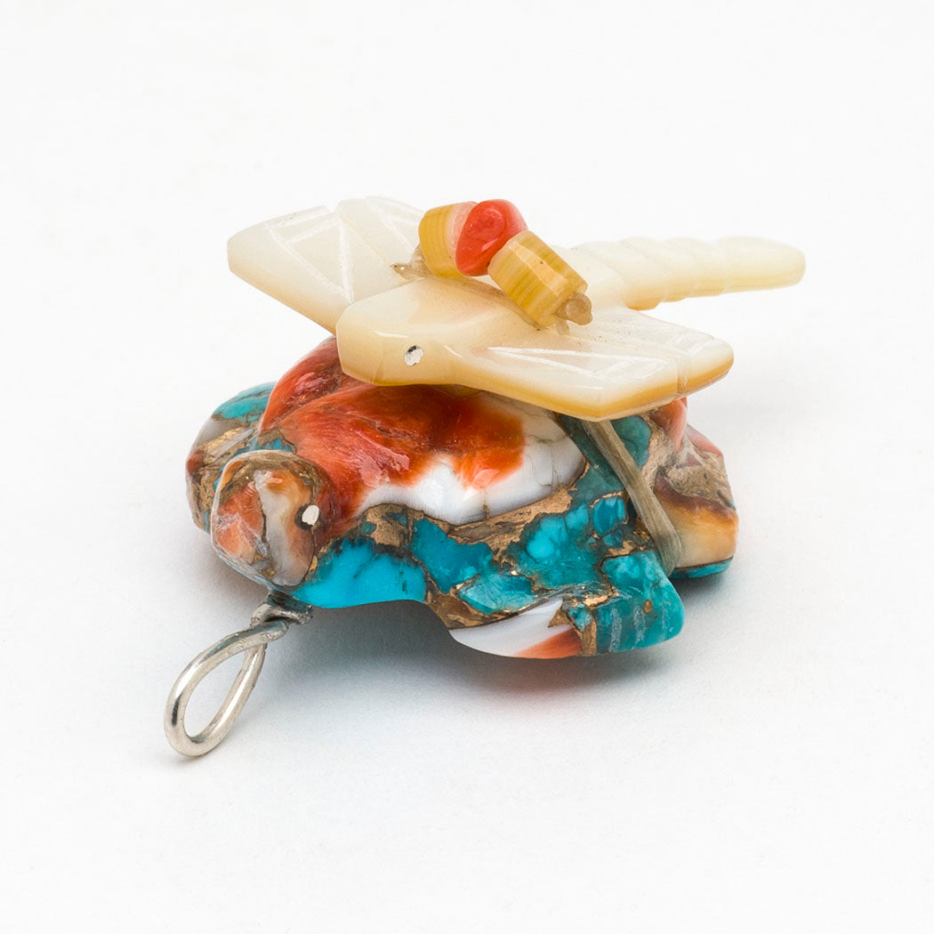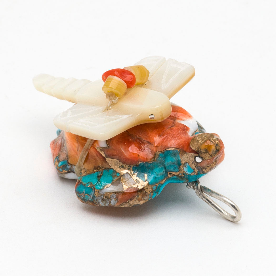 Daisy Rose Leonard's shimmering gold lip shell Dragonfly is bound by a steady Turtle from a turquoise, brass and spiny oyster shell composite, plus coral and heishe beads. A lovely creature combination of earth and sky bonded by their love of water in wearable pendant form. For the A:Shiwi (Zuni) turtles have a rain association and dragonflies are a sign of water. Together the delightful pair measures about 1 7/8" long, 1" wide and 3/4" deep, each with spirited eyes from sterling silver inlays. Measurements include the silver bale. Please note the silver chain pictured isĀ not included with the pendant.