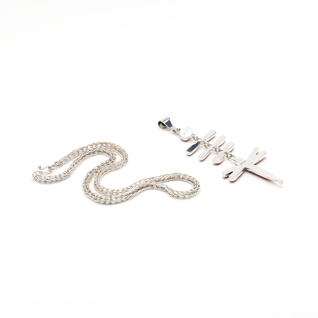 Where there is water, there is life therefore the ancient creature dragonfly is traditionally recognized as a sign of water. Fall in love with the magic of Dragonfly in Smokey Gchachu's handmade sterling silver, branch red coral and sky blue turquoise dragonfly pendant necklace. Exquisite bezel work enhances the coral's natural beauty. The tail tip is finished with a colorful turquoise cabochon. Dimensions of the removable dragonfly pendant itself are about 4 1/4" long including bale, 1 1/2" wide and 1/8" deep. The silky hand woven sterling silver chain is approximately 16 5/8" long. A truly unique designer's 2-piece set that's wonderfully versatile. Signed by the artist.
