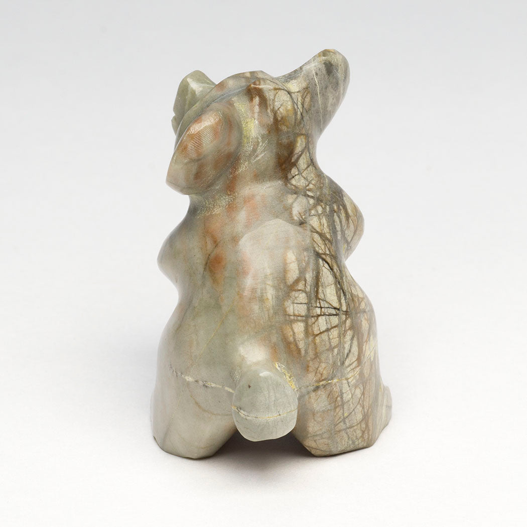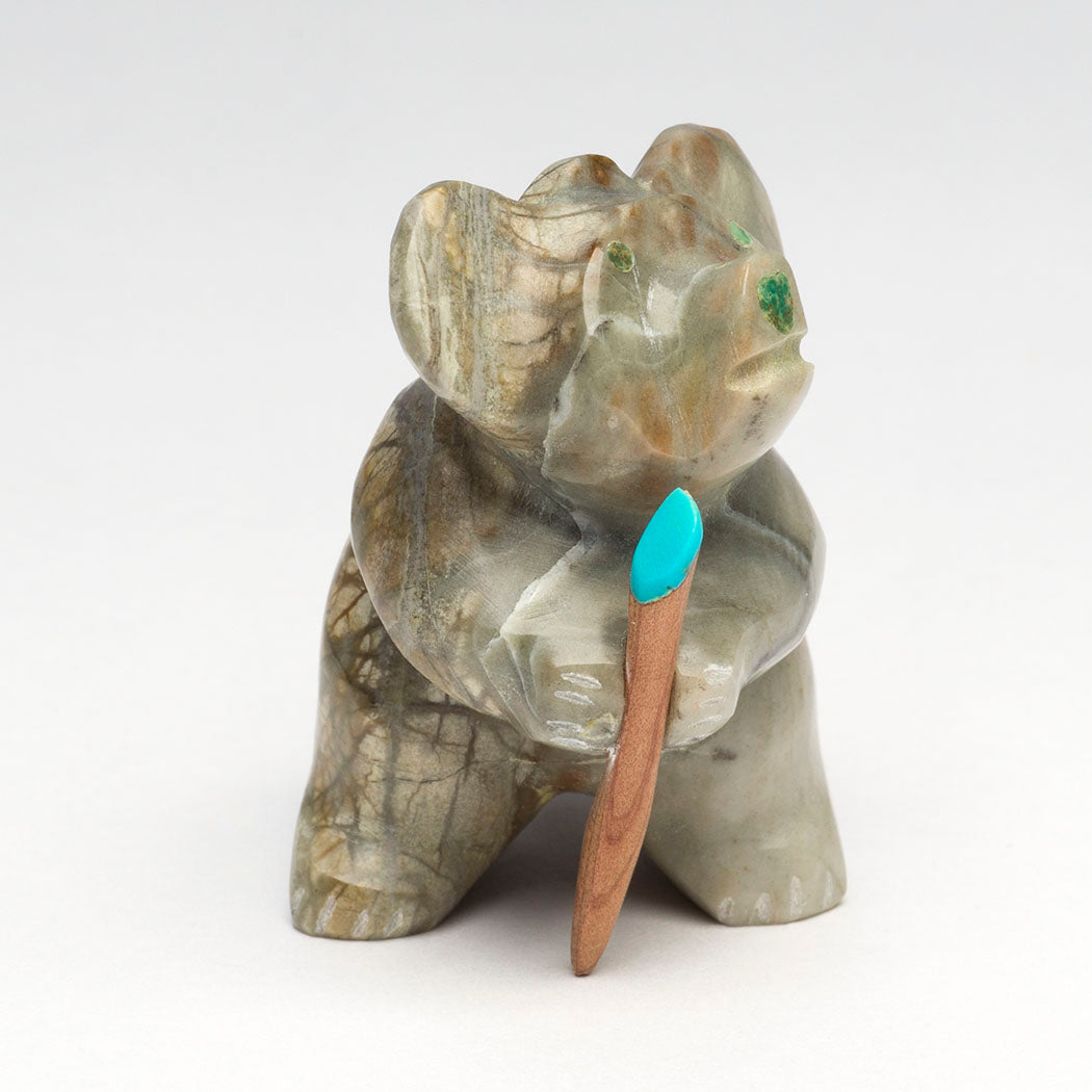 The Indigenous First Nations Peoples in eastern Australia regard koalas as creatures with power over the rains. They are water stewards and if disrespected can cause big drought. First Nations Peoples are actively involved in conservation efforts sharing their traditional ecological knowledge to care for koalas as their populations have suffered significantly. Carved from Picasso marble, Enrike Leekya's wise old koala has endearing eyes and a heart-shaped nose both from turquoise inlays. A miniature walking stick is fashioned from lightly fragrant cedar and capped with colorful turquoise. Dimensions of this large-eared marsupial are approximately 2" tall, 1 1/2" wide and 1 1/2" deep.