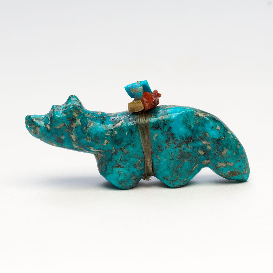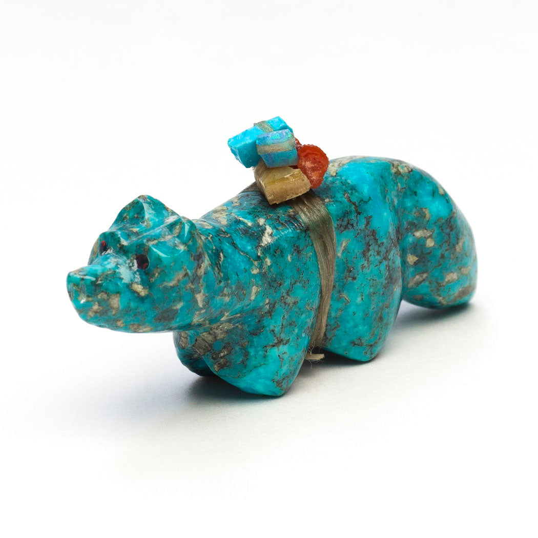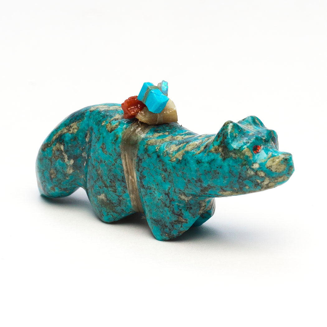 Daryl Shack, Sr.'s cheery Wolf (Fox or Coyote) is carved from turquoise and inlaid with flashing eyes from cultured opal inlays. A "Shack Stack" offering bundle, Daryl's signature touch, is piled high with goodies like turquoise, cultured opal and red coral pieces. Wild canines greatly contribute to more resilient and stable ecosystems. We can help them by writing to our wildlife commissions asking them to protect bushytails and their homes. About 2" long, 1/2" wide and 1" tall.