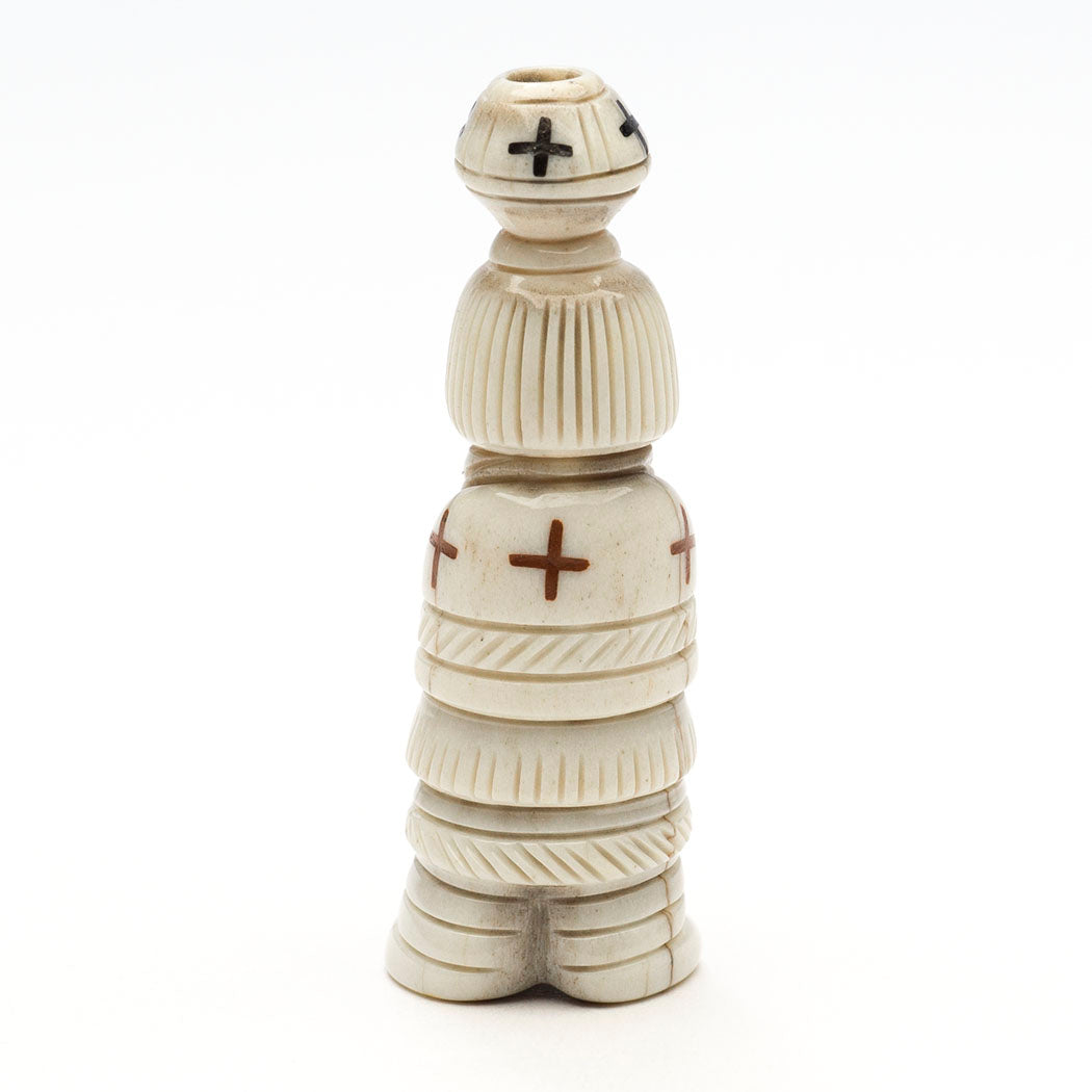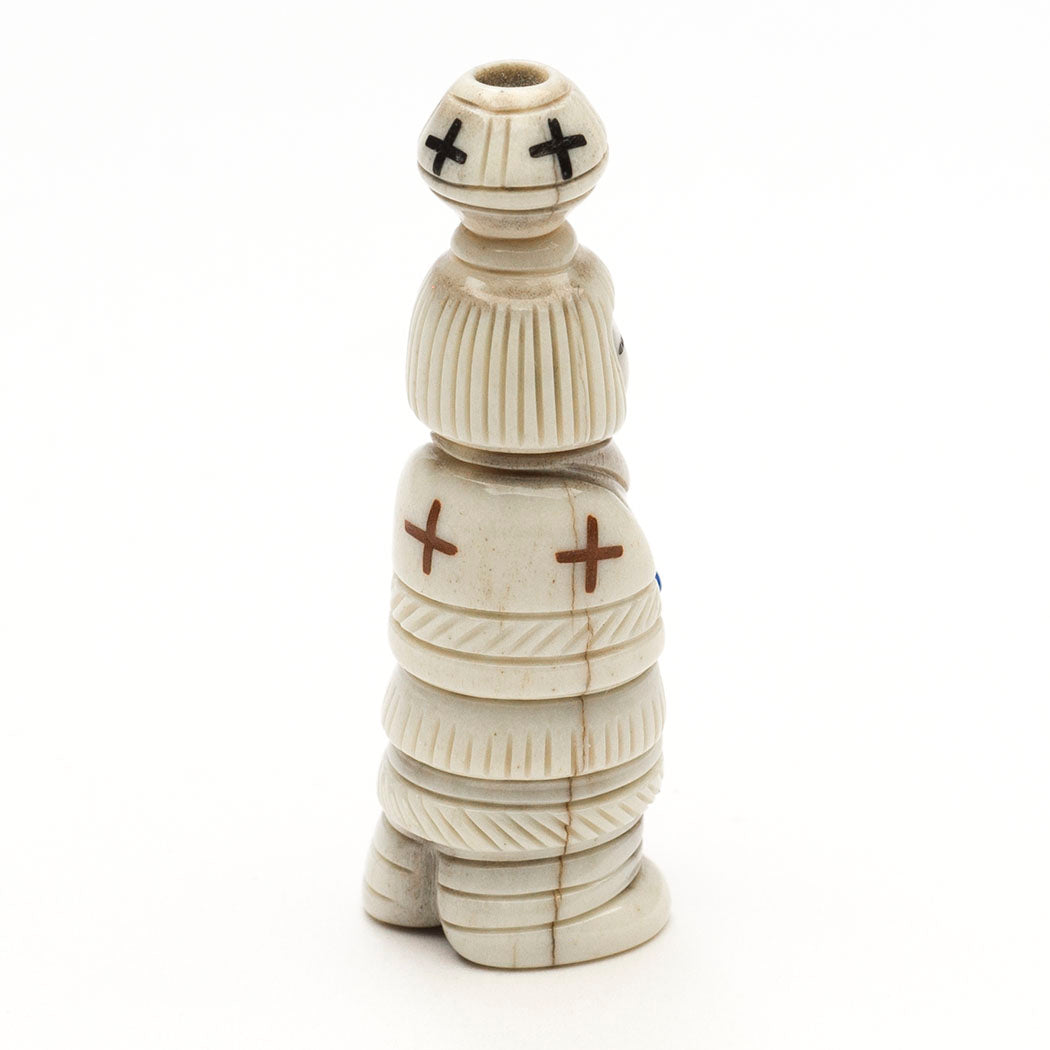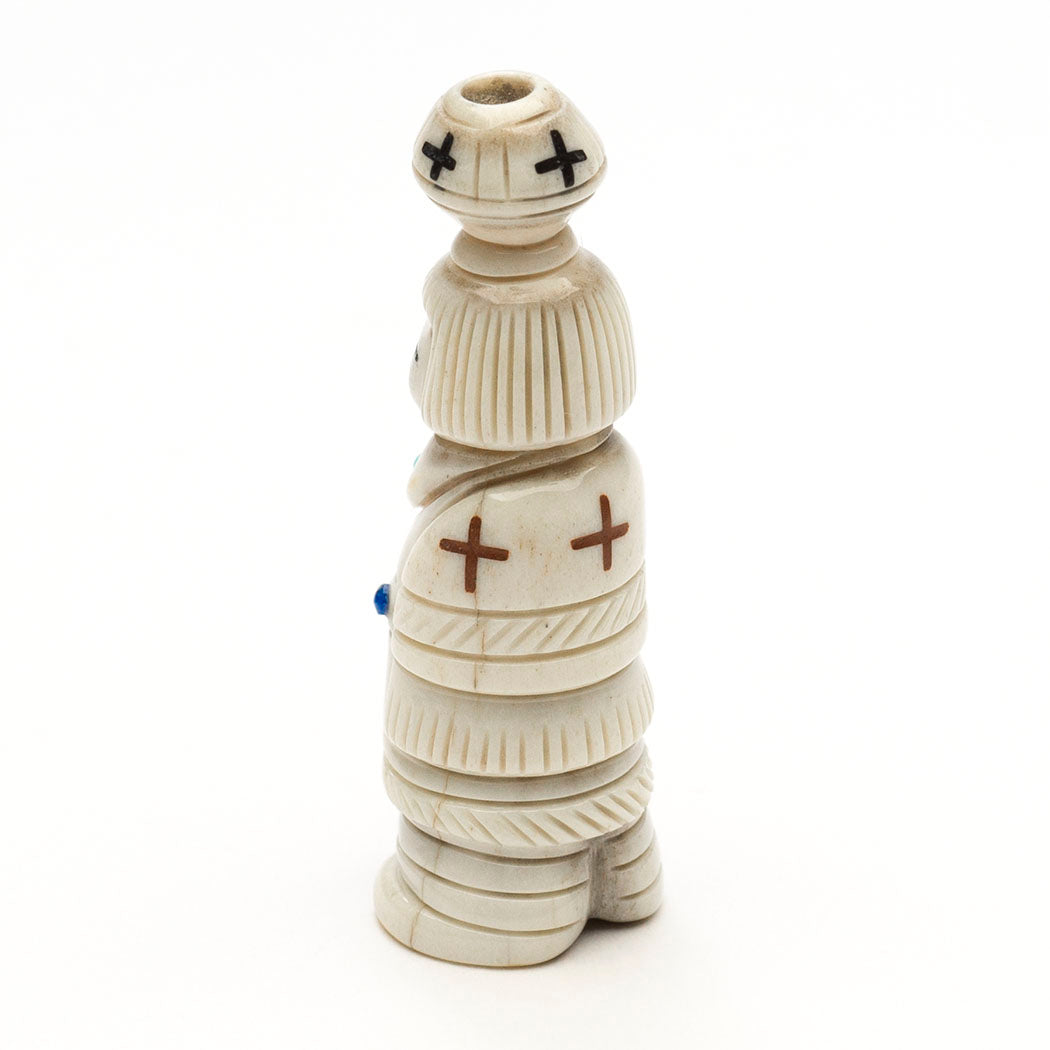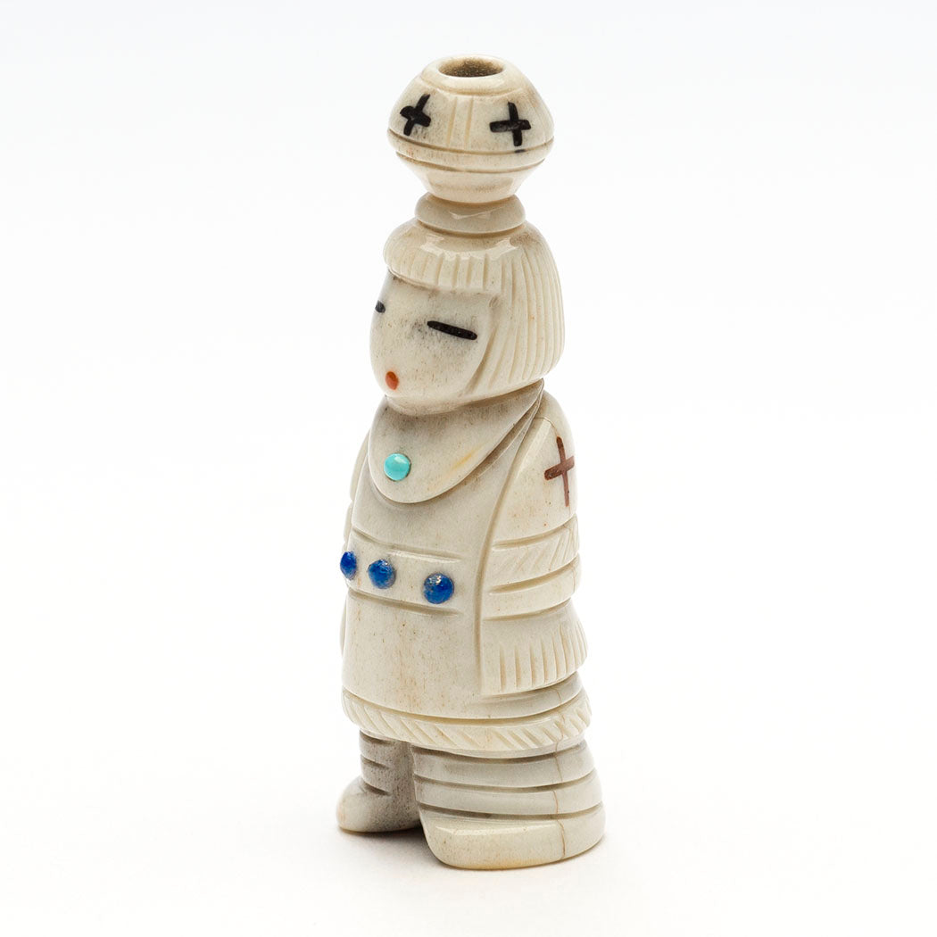 Zuni Pueblo women are known for skillful movement while balancing pottery jars on their heads. Troy Sice's collectible Olla Maiden is a representation of these amazing women. She is masterfully carved from one piece of antler and precisely set turquoise and lapis inlays. Etched star elements are filled with either jet or pipestone paste. Soulful eyes are from jet paste and a voice of wisdom is represented by a red coral inlay. About 1 5/8" tall, 1/2" wide and 1/2" deep.