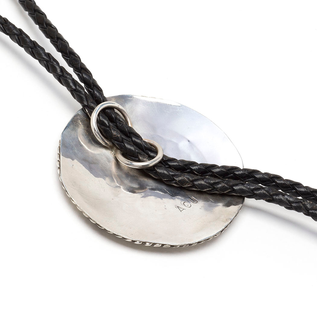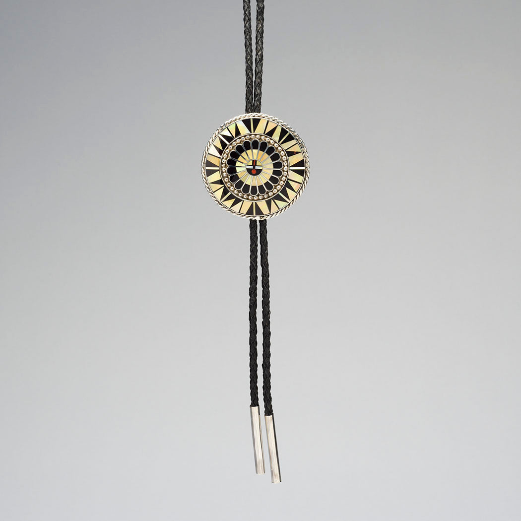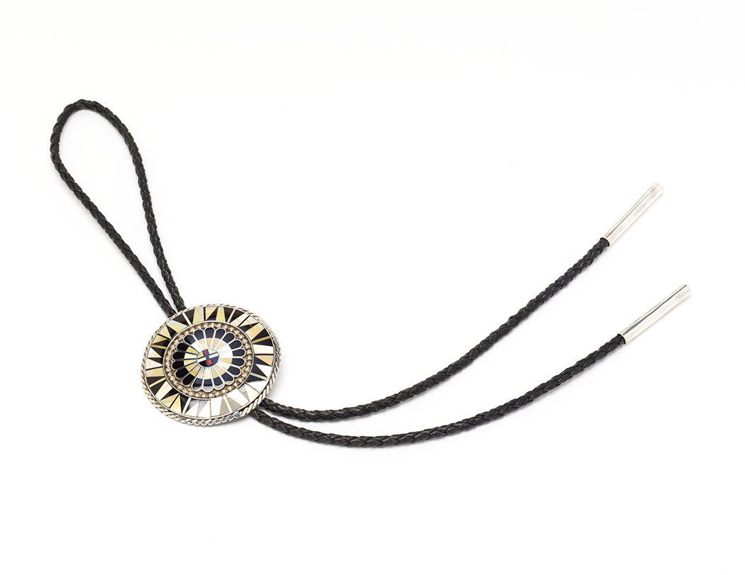 For the A:Shiwi (Zuni) the Sunface symbol is a traditional one representing the elements in harmony and balance. April Unkestine often incorporates this sacred design in outstanding jewelry creations. She's mastered both the stone to stone and channel inlay jewelry techniques that require stellar lapidary and silversmithing skills. Each stone, shell or coral specimen has to fit precisely as evidenced in a glorious sterling silver Sunface bolo tie. Iridescent gold lip shell, rich pen shell and colorful red coral look striking together. The adjustable Sunface station itself is about 2 5/8" long and 2 5/8" wide. Including the handsome sterling silver tips, the black leather braided cord is approximately 36" long. Signed by the artist.