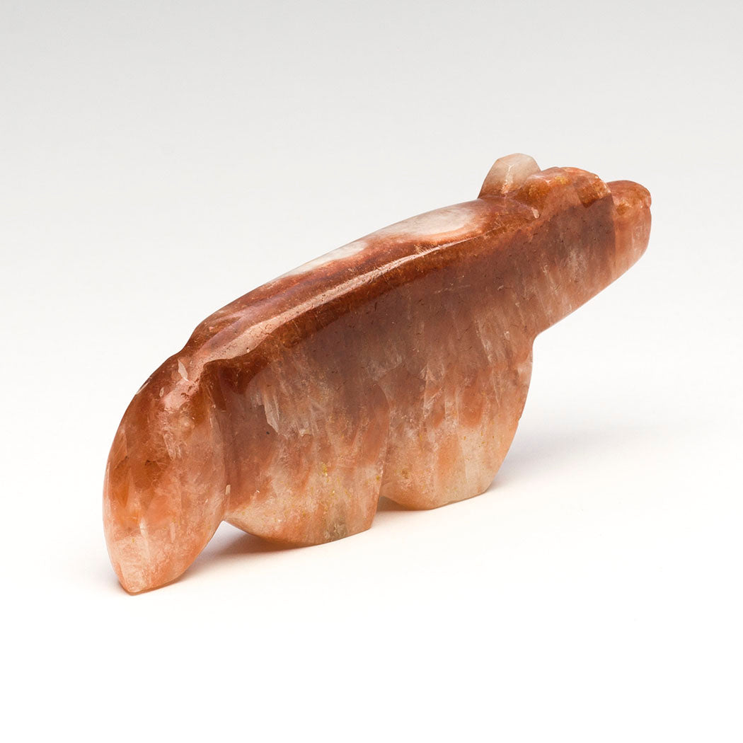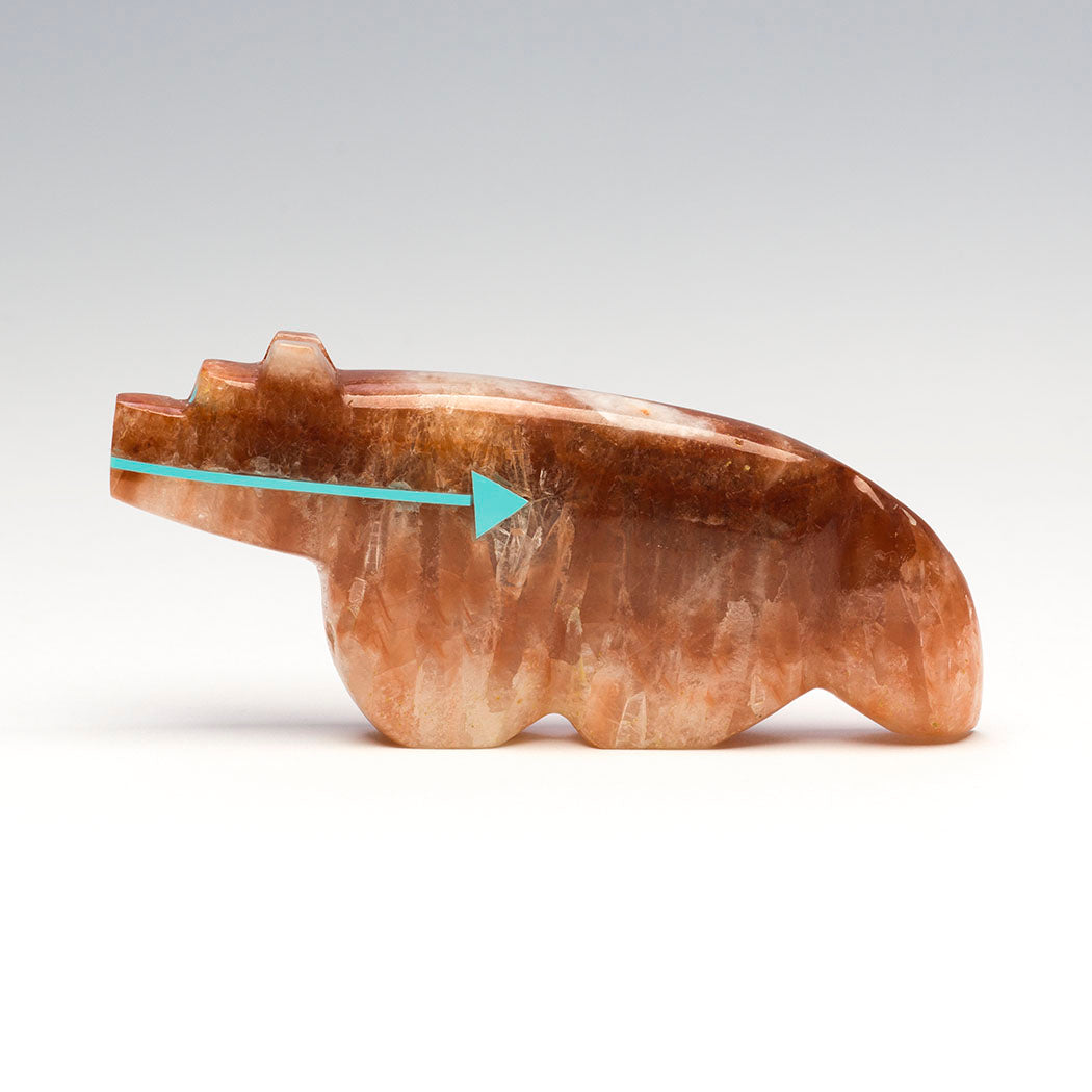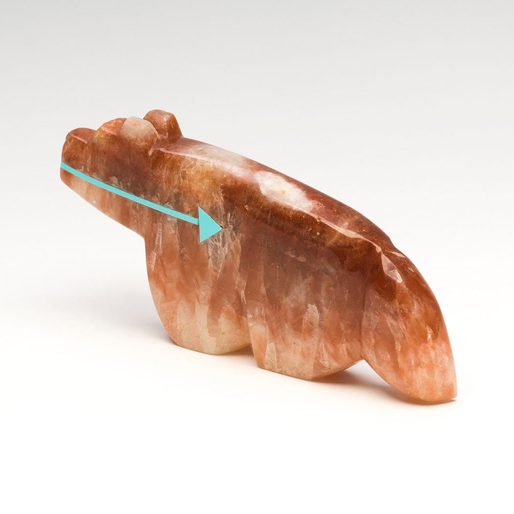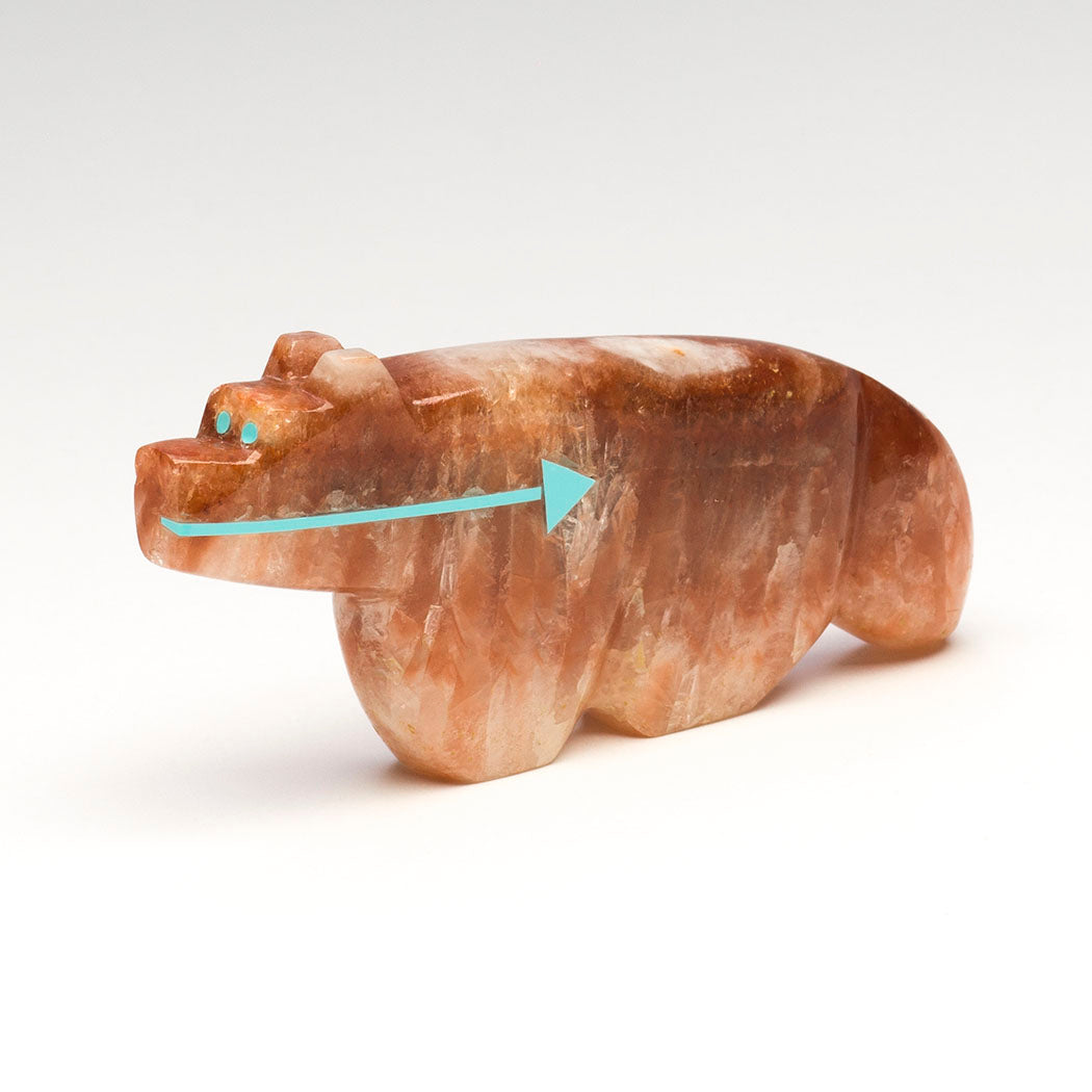 Not only are stone animal carvings incredible works of art but they can help us focus on the qualities from a certain animal we would like to cultivate in ourselves. Bernard Laiwakete's autumn-hued calcite bushytail (Fox, Wolf or Coyote) would be a wonderful carving to help us remember the natural characteristics of wild canines like their discernment, being good pack or family members and stewards of the environment. Energetic eyes and a heartline or breath path are from turquoise inlays. About 4" long, 1/2" wide and 1 7/8" tall.