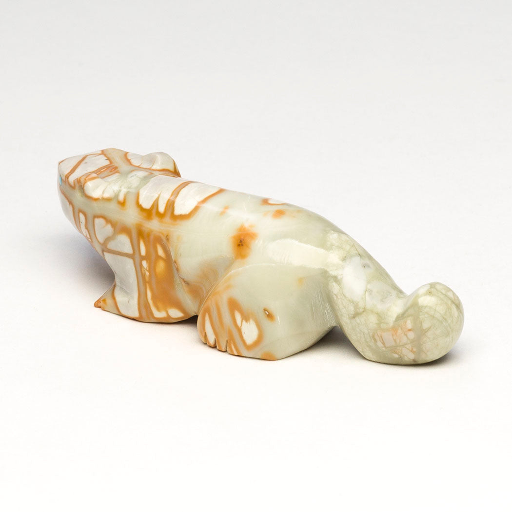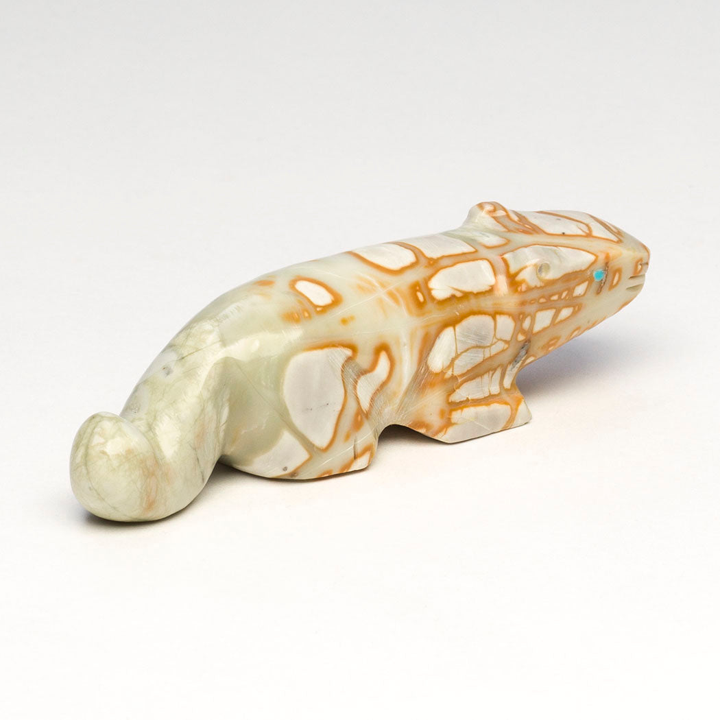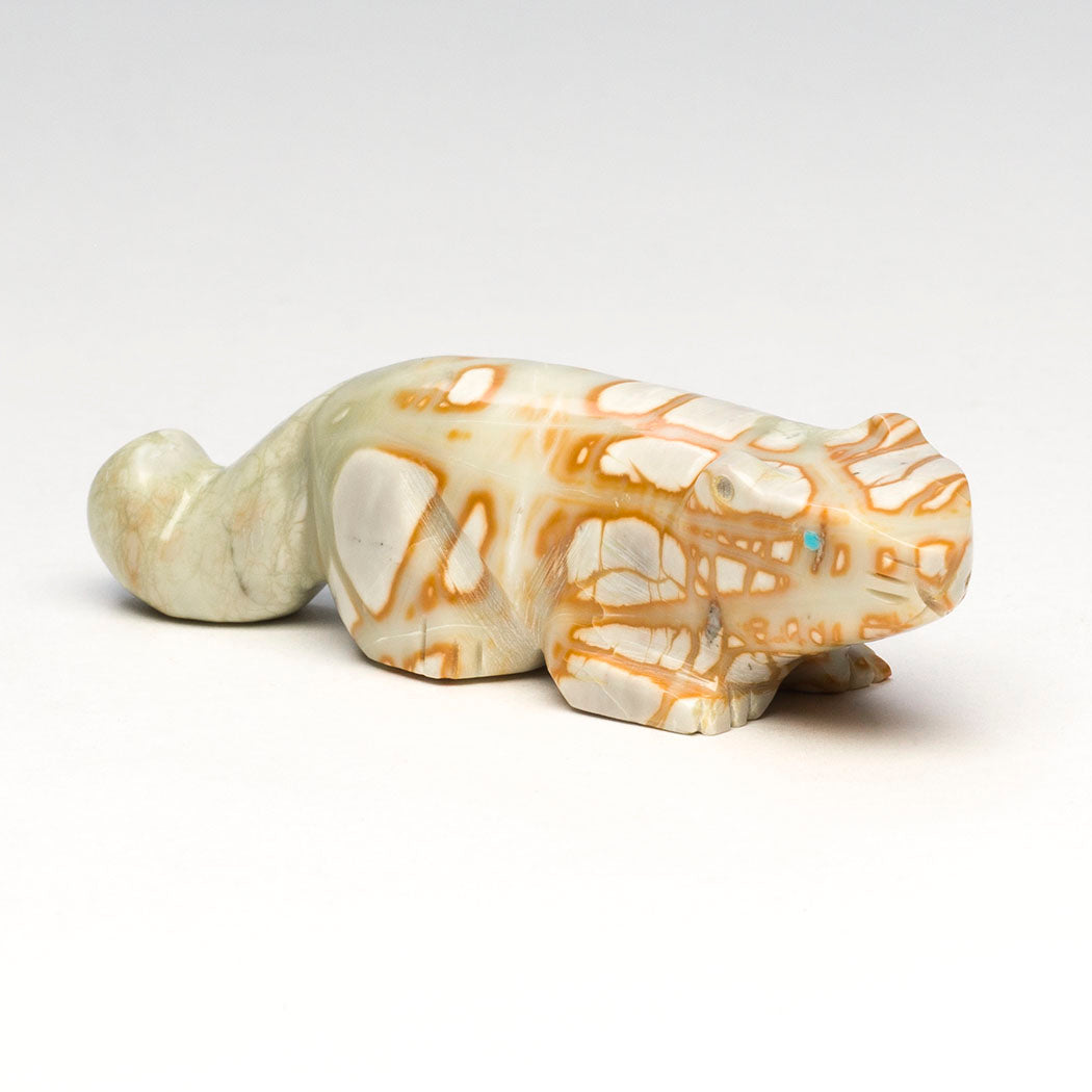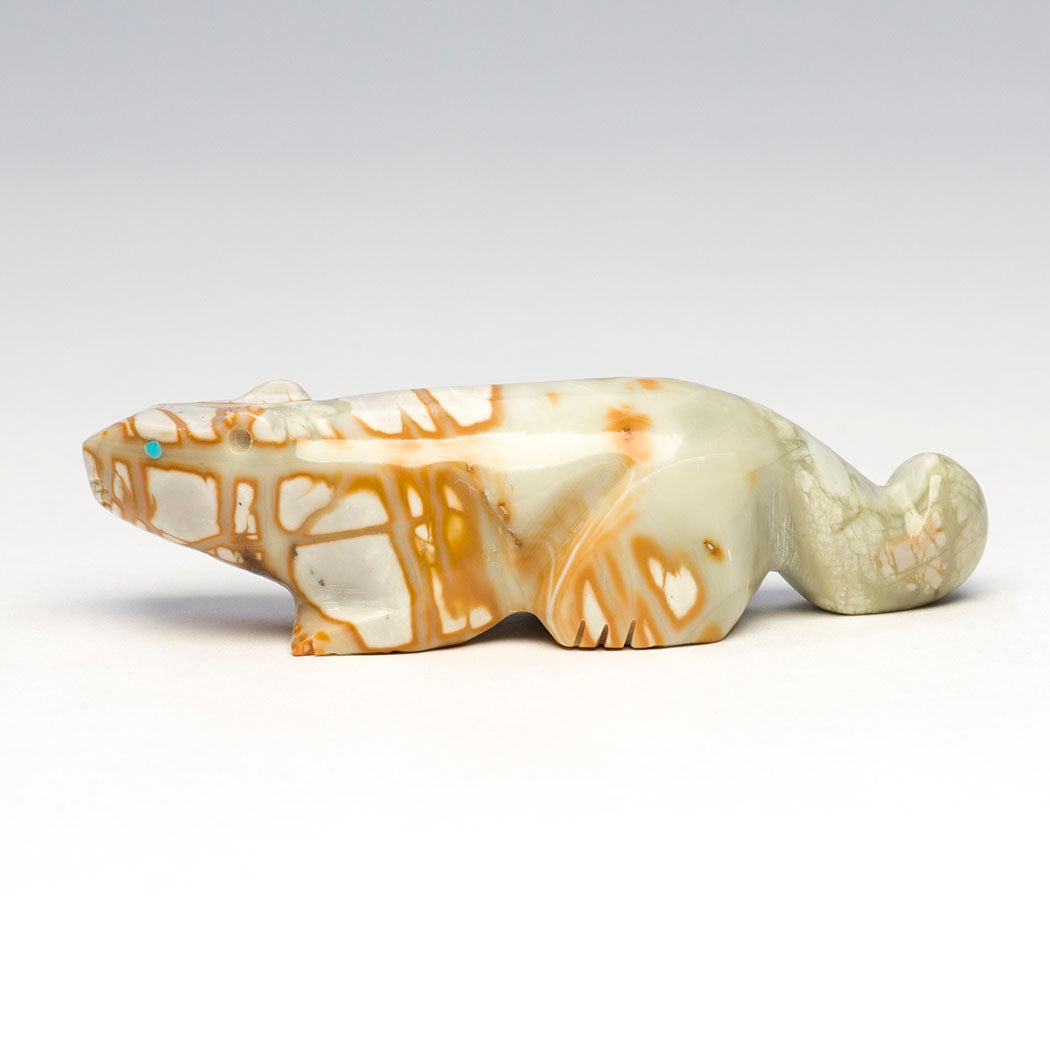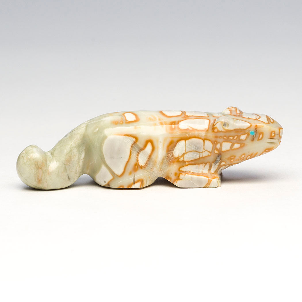 David Chavez, Jr.'s Mountain-lion (puma, panther, leopard or cougar) would be a wonderful companion for anyone traveling down unfamiliar roads. A mountain lion's animal medicine includes embracing the unknown and not to let fears become obstacles to your journey. Carved from a phenomenal Picasso marble and inlaid with discerning eyes from turquoise inlays, this wonderful feline is roughly 3 1/2" long, 1" wide and 1" tall.