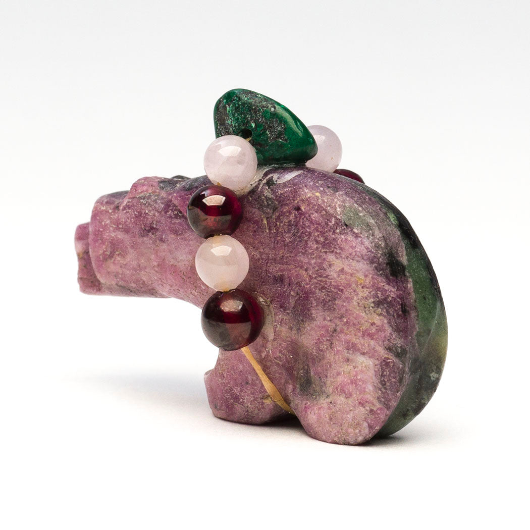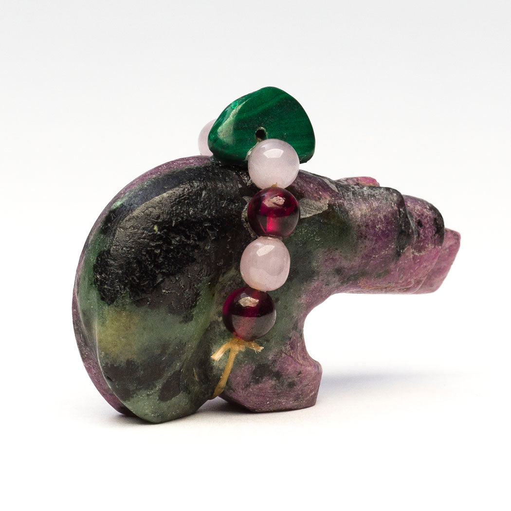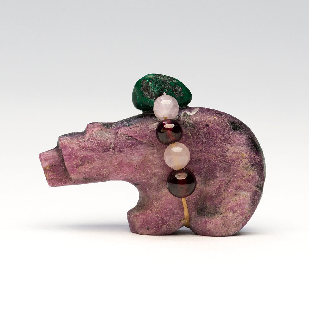 Bear is a colorful feast for the eyes. Alluring garnet, pretty amethyst and a verdant malachite bead are secured in the offering bundle. Kateri usually inlays eyes on her animal carvings but this approximately 1 1/2" long, 3/4" wide and 1 1/8" tall one is unique as it doesn't have inlays making it a true collectible.