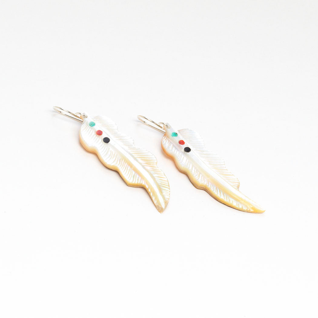 For many Indigenous cultures, feathers represent an interconnectedness with nature and hold spiritual significance. They also are a symbol of unity and a gift from the sky. Cheryl Beyuka's carved iridescent gold lip shell feather earrings embody this reverence. Detailed with quill, shaft and barb features, the lightweight earrings are also inlaid with colorful coral, sky blue turquoise and bold jet. Including the lovely handmade sterling silver hooks, measurements are a gorgeous 2 1/4" long and 5/8" wide. Signed by the artist.