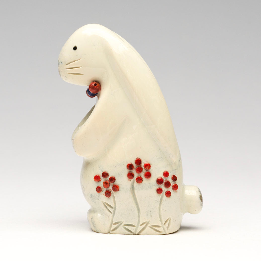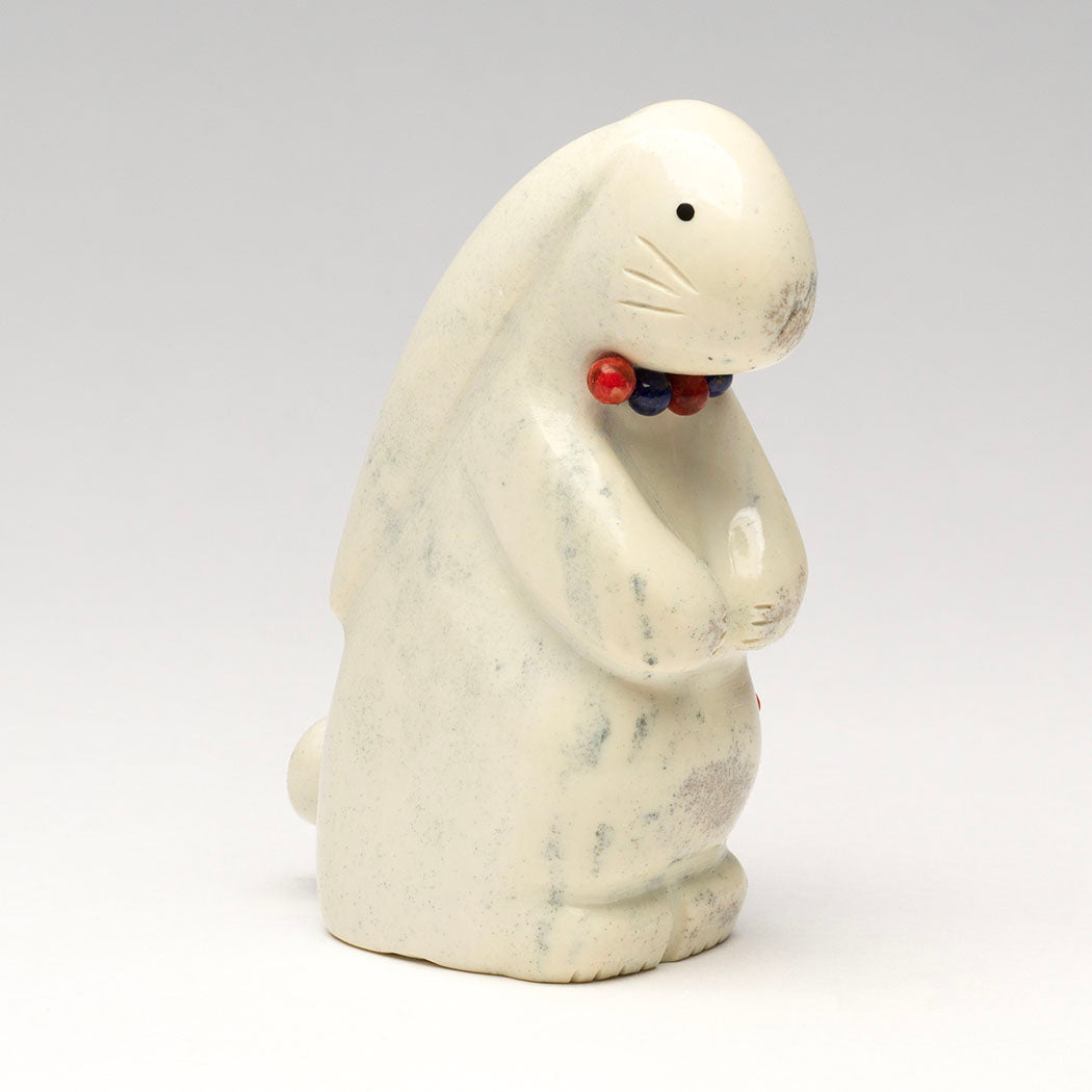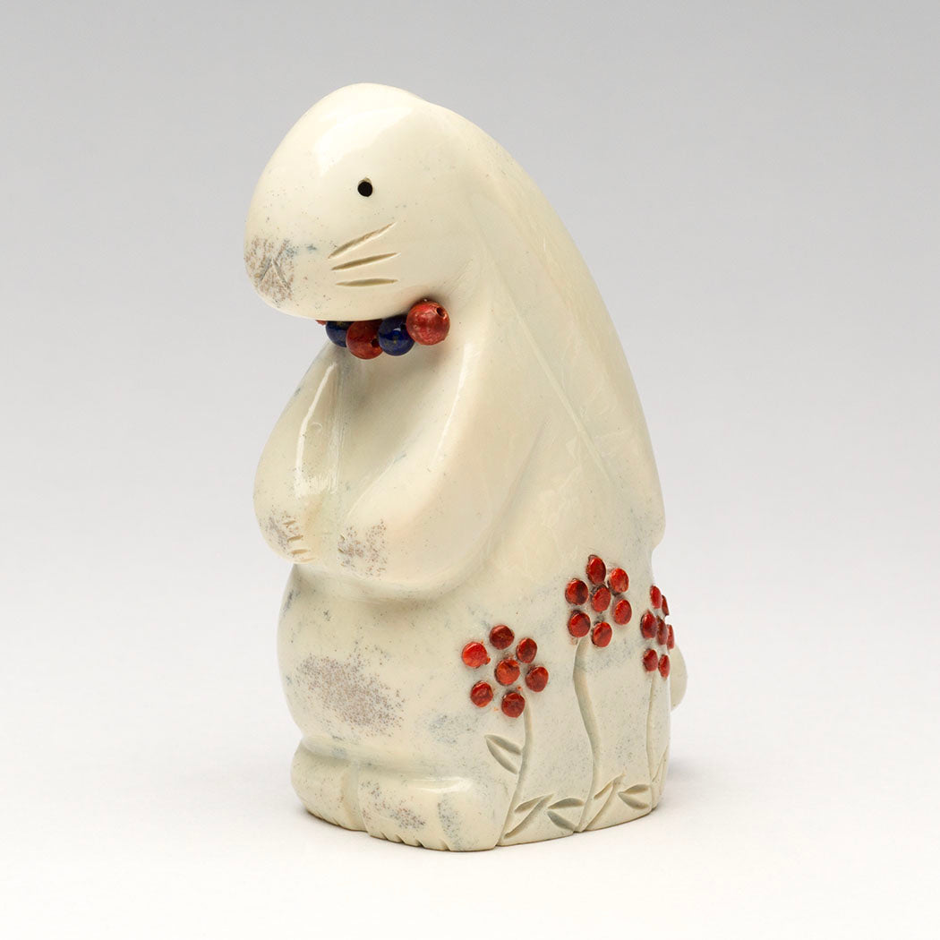 Rabbit enjoys an all you can eat buffet of sweet grasses and baby shoots. The wonderful blooms on the bunny are from inlaid spiny oyster shell while the stems and leaves are nicely etched. Munching eyes are from jet inlays and a tiny offering necklace has spiny oyster shell and lapis lazuli beads. About 3 1/4" tall, 1 1/4" wide and 2 1/4" deep.