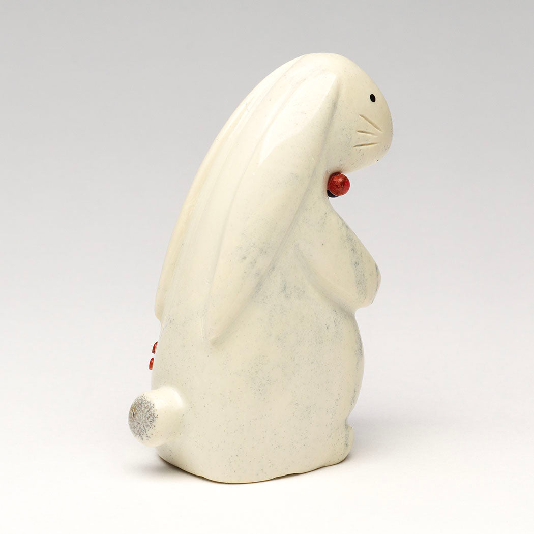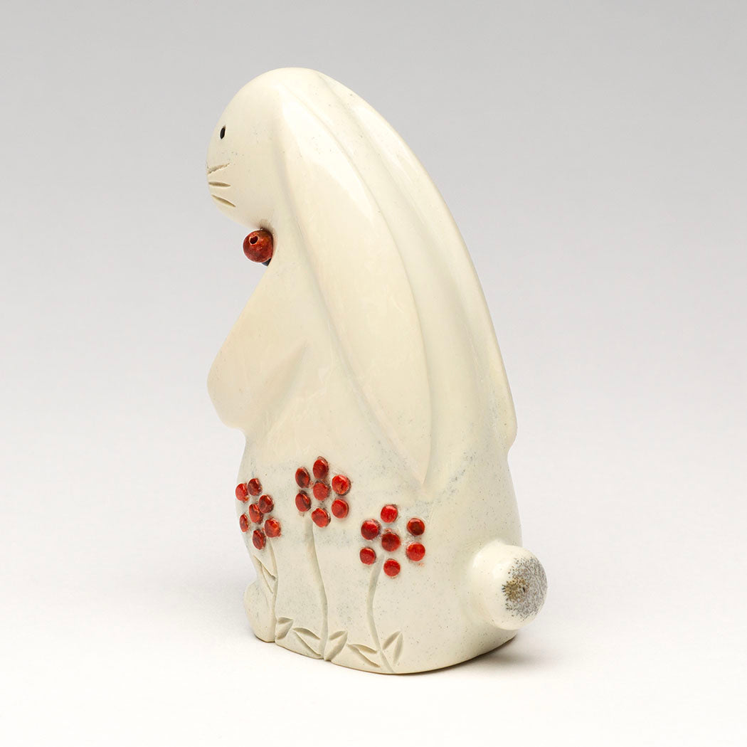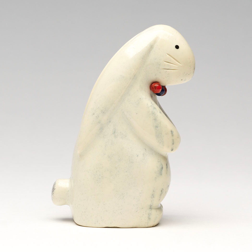 Rabbit enjoys an all you can eat buffet of sweet grasses and baby shoots. The wonderful blooms on the bunny are from inlaid spiny oyster shell while the stems and leaves are nicely etched. Munching eyes are from jet inlays and a tiny offering necklace has spiny oyster shell and lapis lazuli beads. About 3 1/4" tall, 1 1/4" wide and 2 1/4" deep.