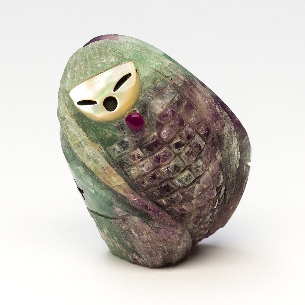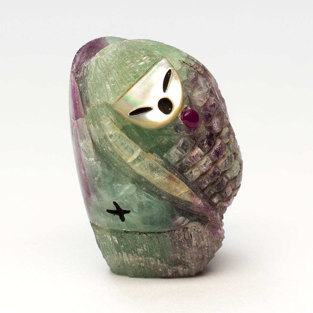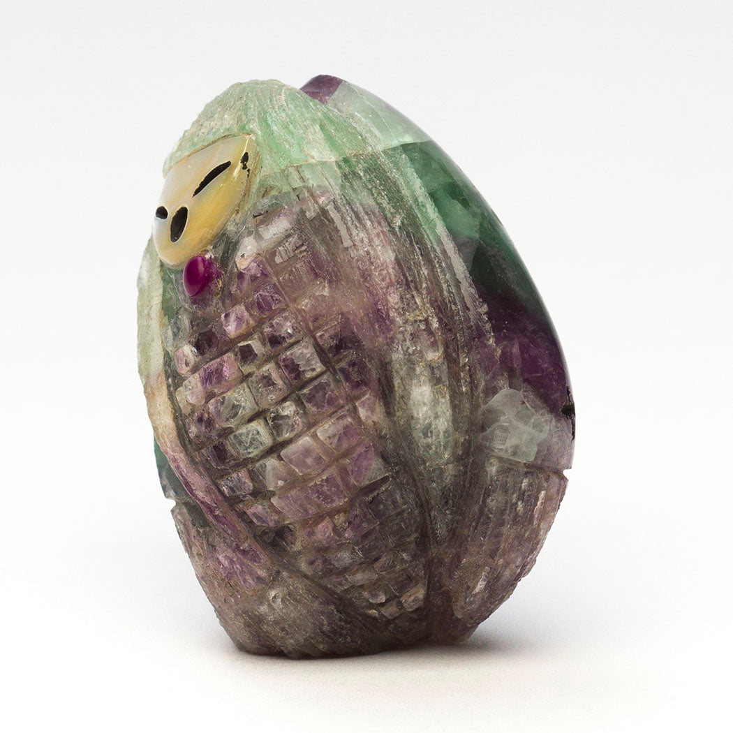 Corn is a gift that brings life. Corn Maiden brought this gift to the People. Kateri Quandelacy Sanchez's collectible Corn-Maiden has an overlaid face from iridescent gold lip shell with incised features accented by jet paste. She also wears an inlaid alunite cabochon complimenting the fluorite specimen with subtle mint green and healing purple hues. About 1 5/8" tall, 1 1/2" wide and 1" deep.