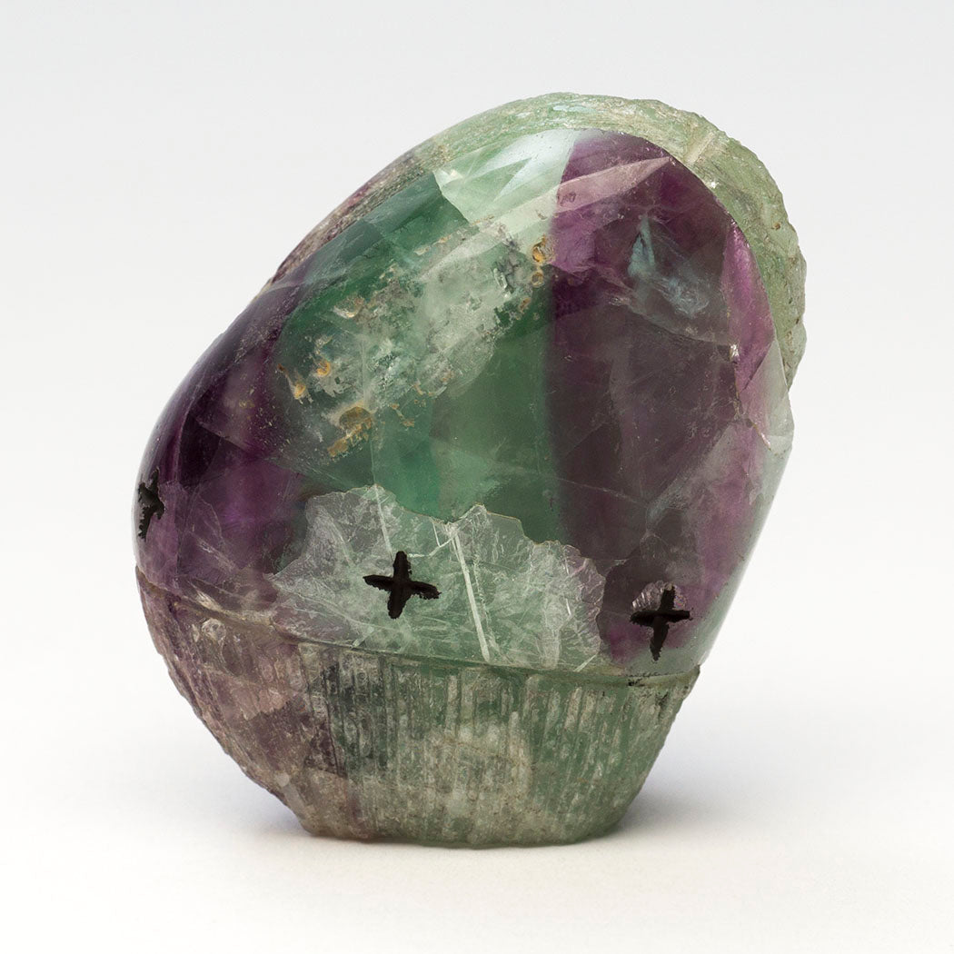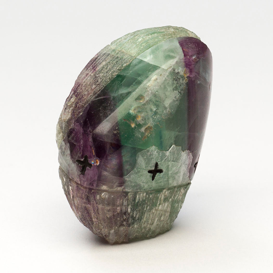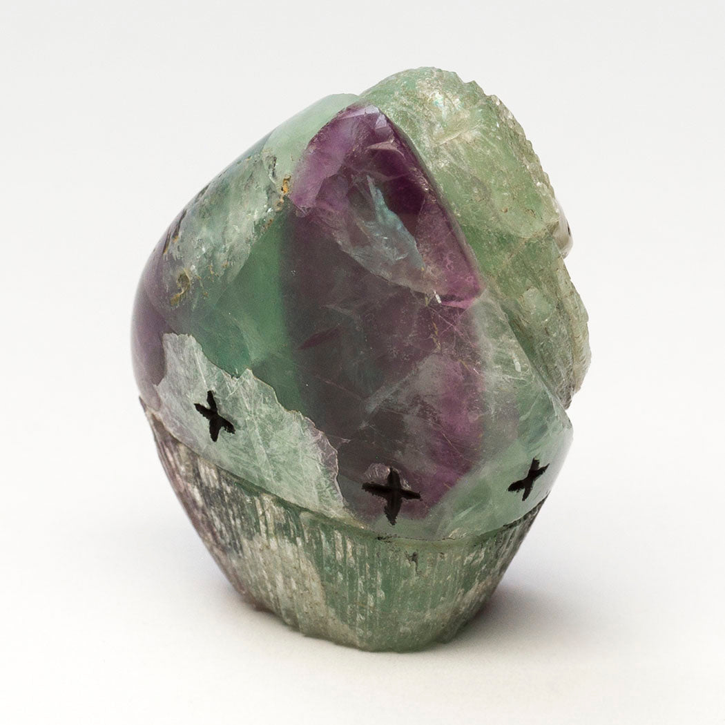 Corn is a gift that brings life. Corn Maiden brought this gift to the People. Kateri Quandelacy Sanchez's collectible Corn-Maiden has an overlaid face from iridescent gold lip shell with incised features accented by jet paste. She also wears an inlaid alunite cabochon complimenting the fluorite specimen with subtle mint green and healing purple hues. About 1 5/8" tall, 1 1/2" wide and 1" deep.