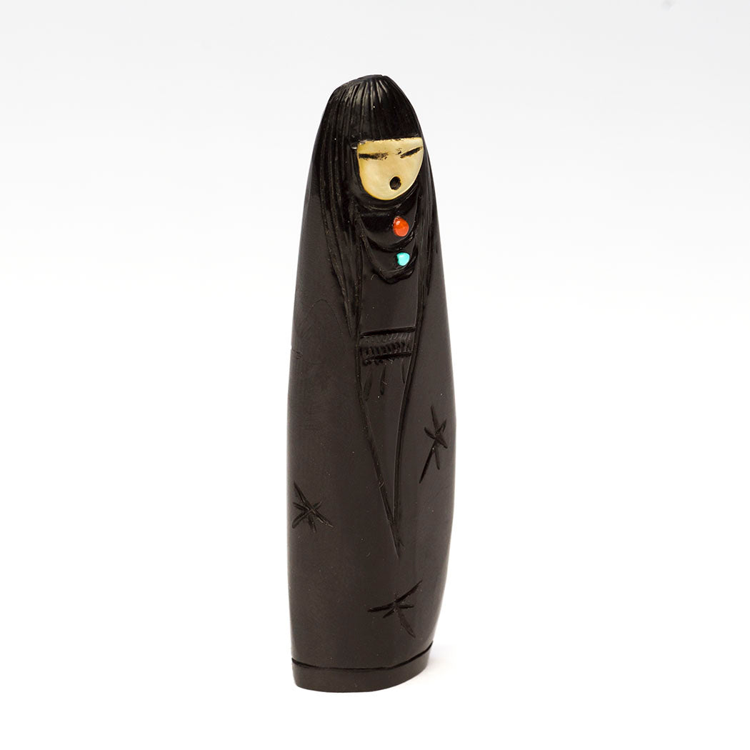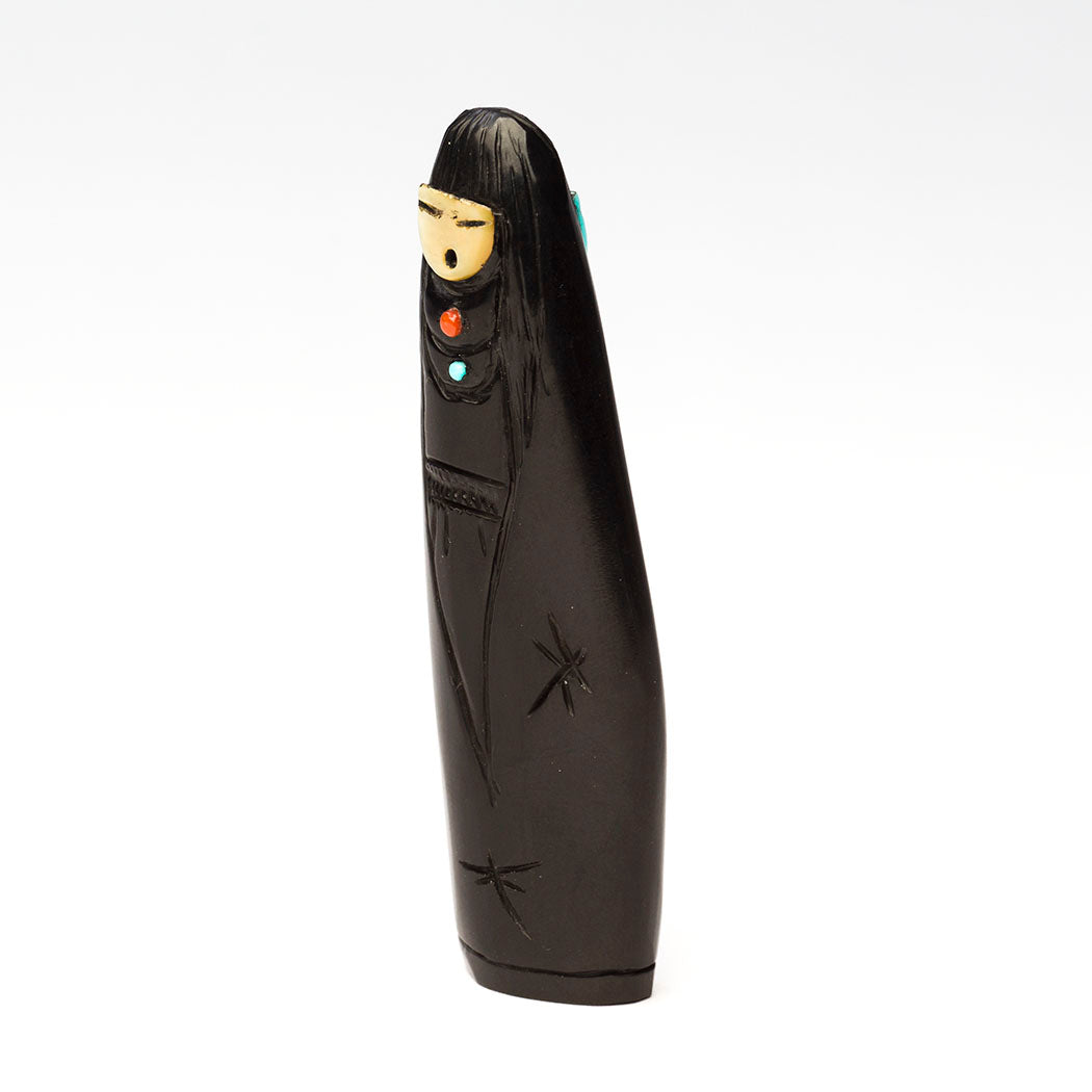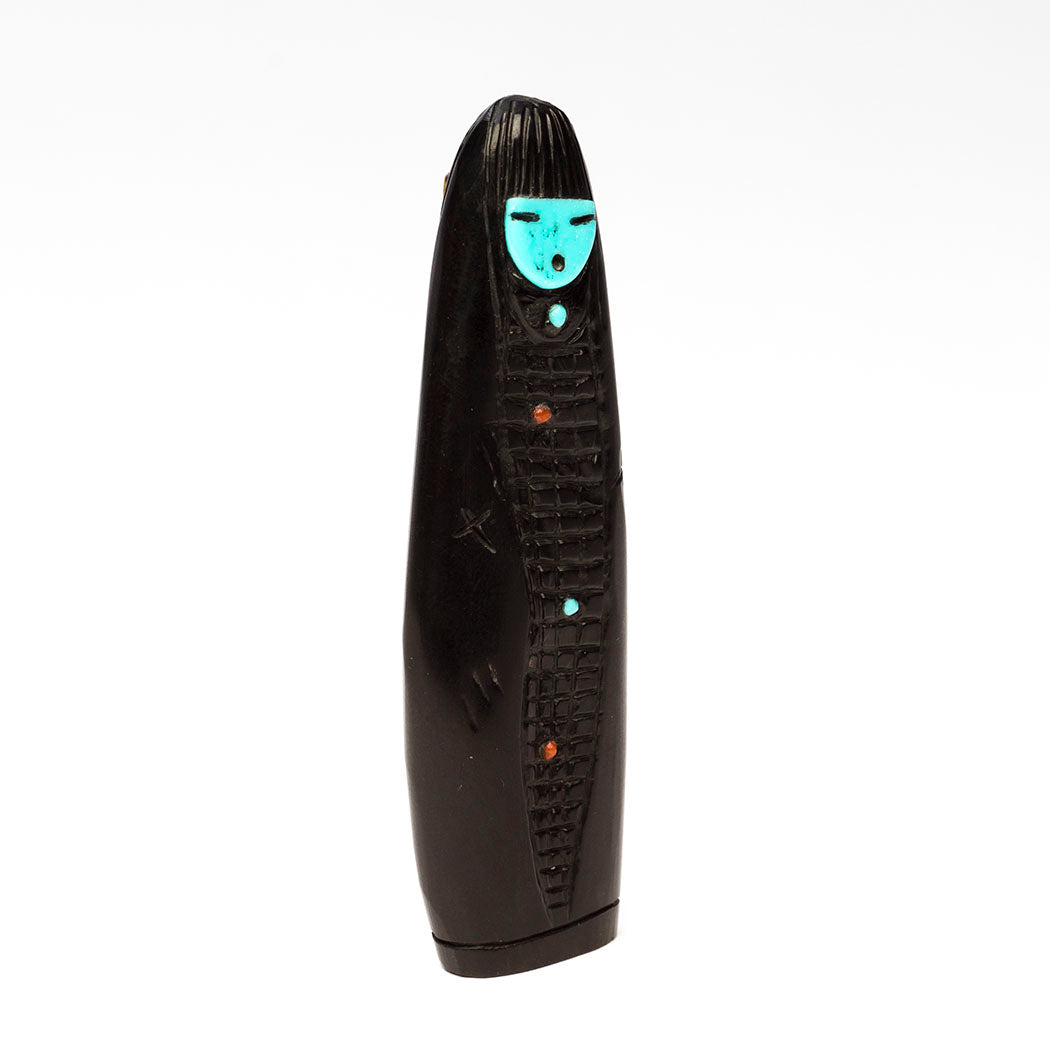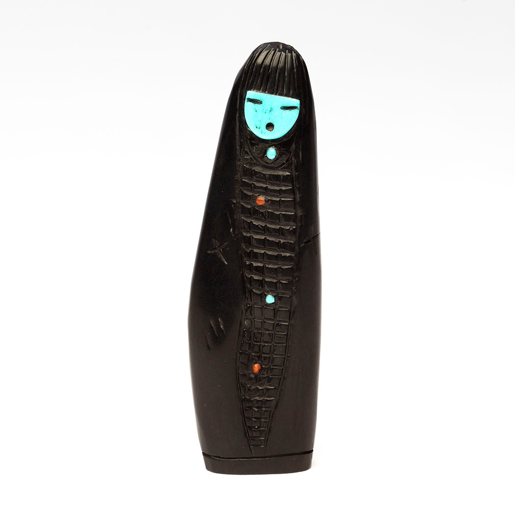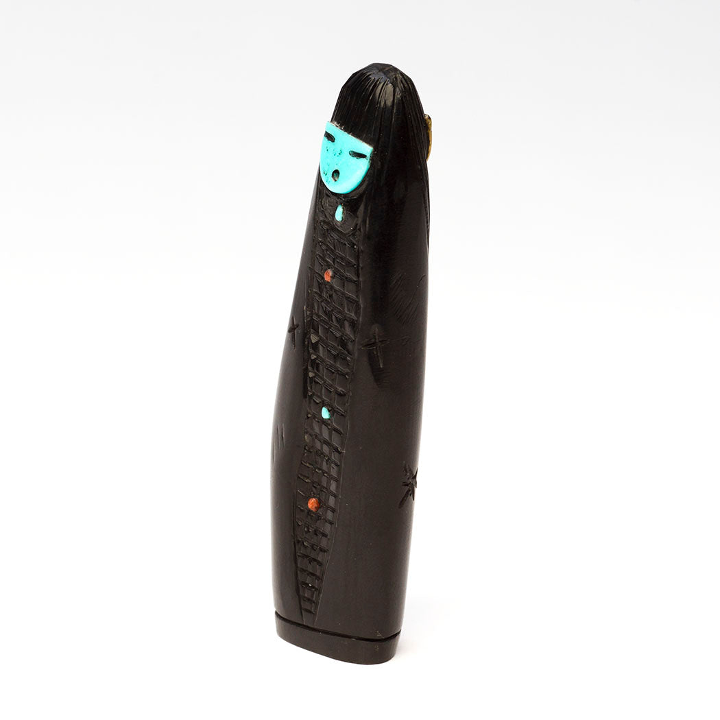 Female empowerment is represented in Sandra Quandelacy's reversible carving from jet. Corn Maiden's soul-nourishing Corn kernels and Grandmother's time-tested wisdom celebrate feminine strength and power. Facial features are incised in either turquoise or iridescent gold lip shell and filled with jet paste. Bright red coral, pipestone and turquoise pieces are inlaid to this approximately 2 3/4" tall, 3/4" wide and 3/8" deep nurturing statuette.