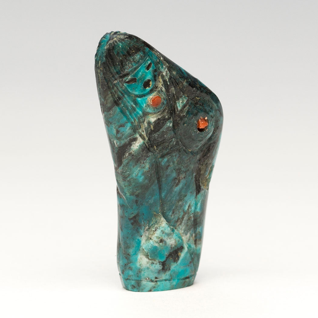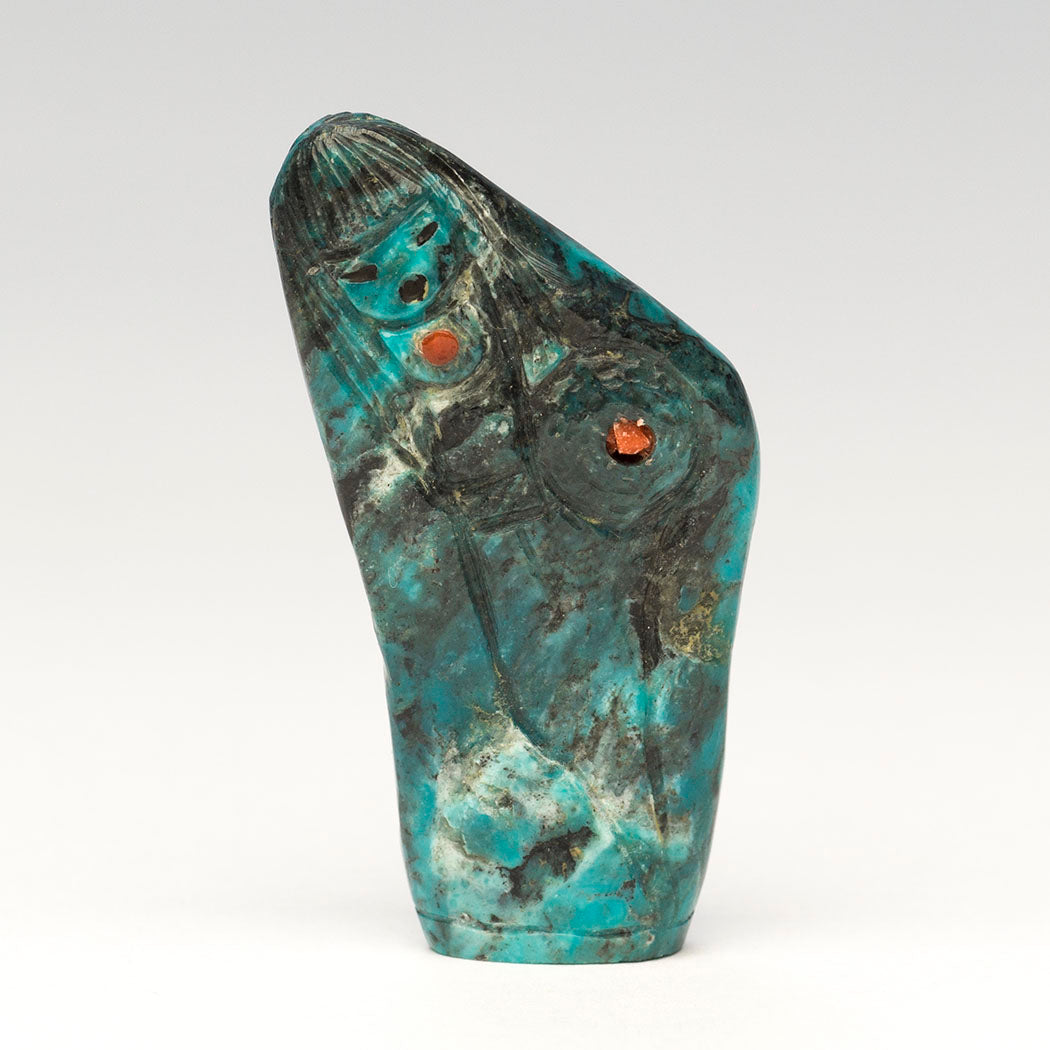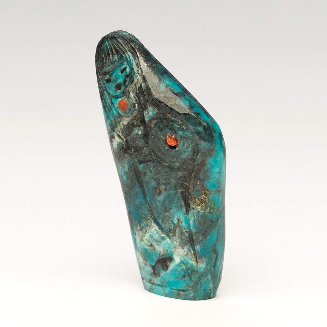 Sandra Quandelacy's carvings are often reversible as is the case with this gorgeous turquoise piece that depicts Corn-Maiden and Grandmother who holds a water carrying jar called an 'olla'. It's filled with crushed red coral. The carving representative of powerful and resilient female energy is inlaid with colorful bits of red coral, turquoise and alunite. Facial features are etched and filled with jet paste. About 1 3/4" tall, 1" wide and 3/8" deep.