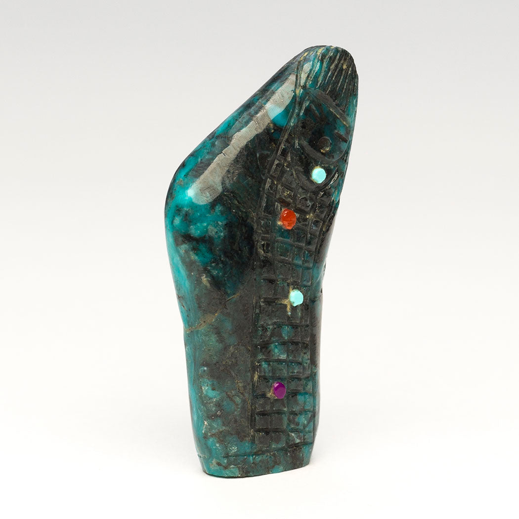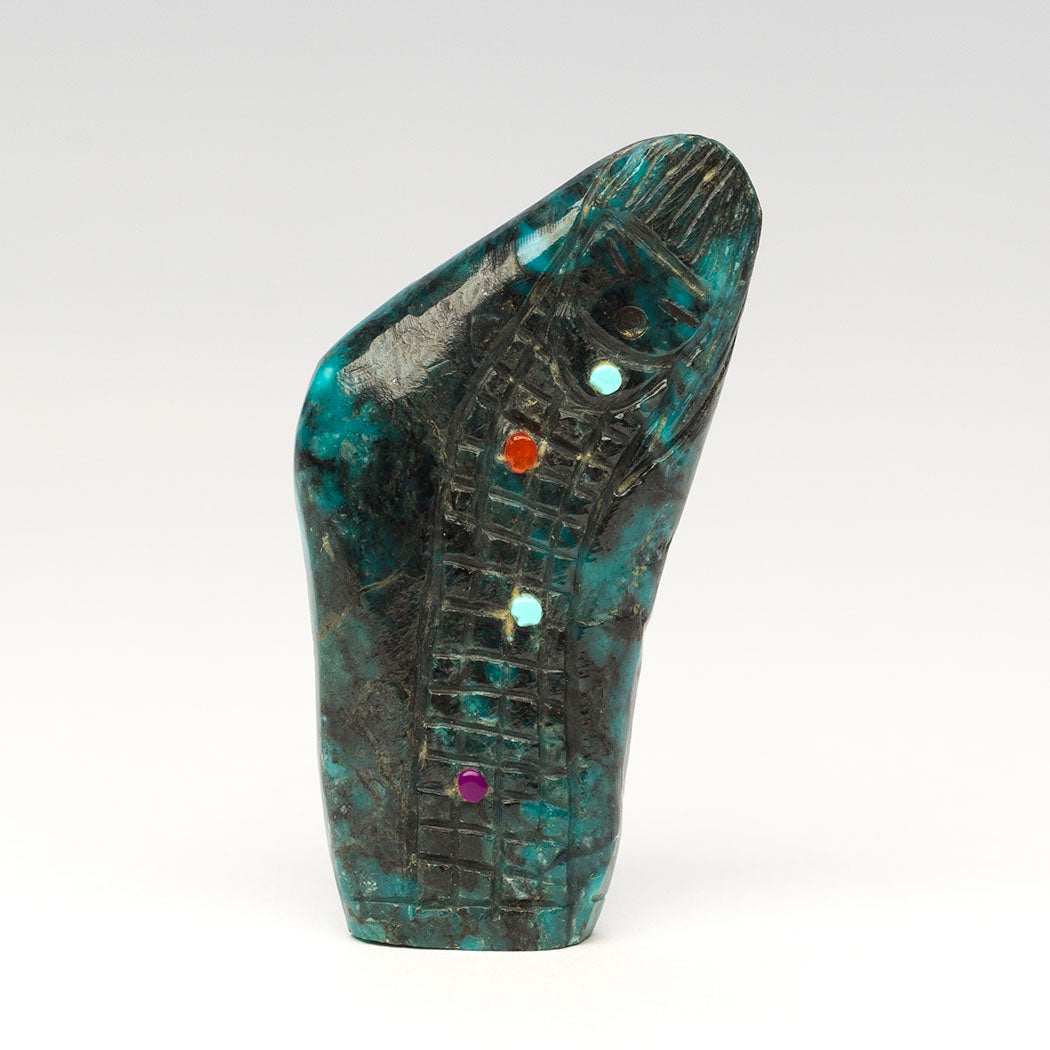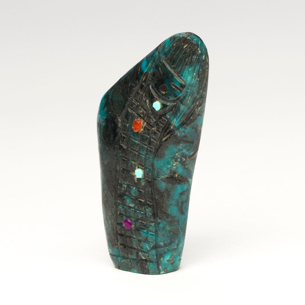 Sandra Quandelacy's carvings are often reversible as is the case with this gorgeous turquoise piece that depicts Corn-Maiden and Grandmother who holds a water carrying jar called an 'olla'. It's filled with crushed red coral. The carving representative of powerful and resilient female energy is inlaid with colorful bits of red coral, turquoise and alunite. Facial features are etched and filled with jet paste. About 1 3/4" tall, 1" wide and 3/8" deep.