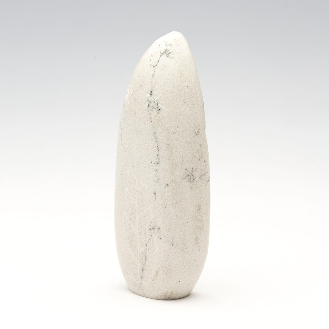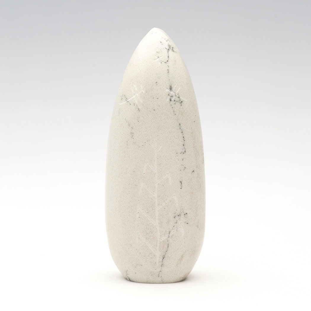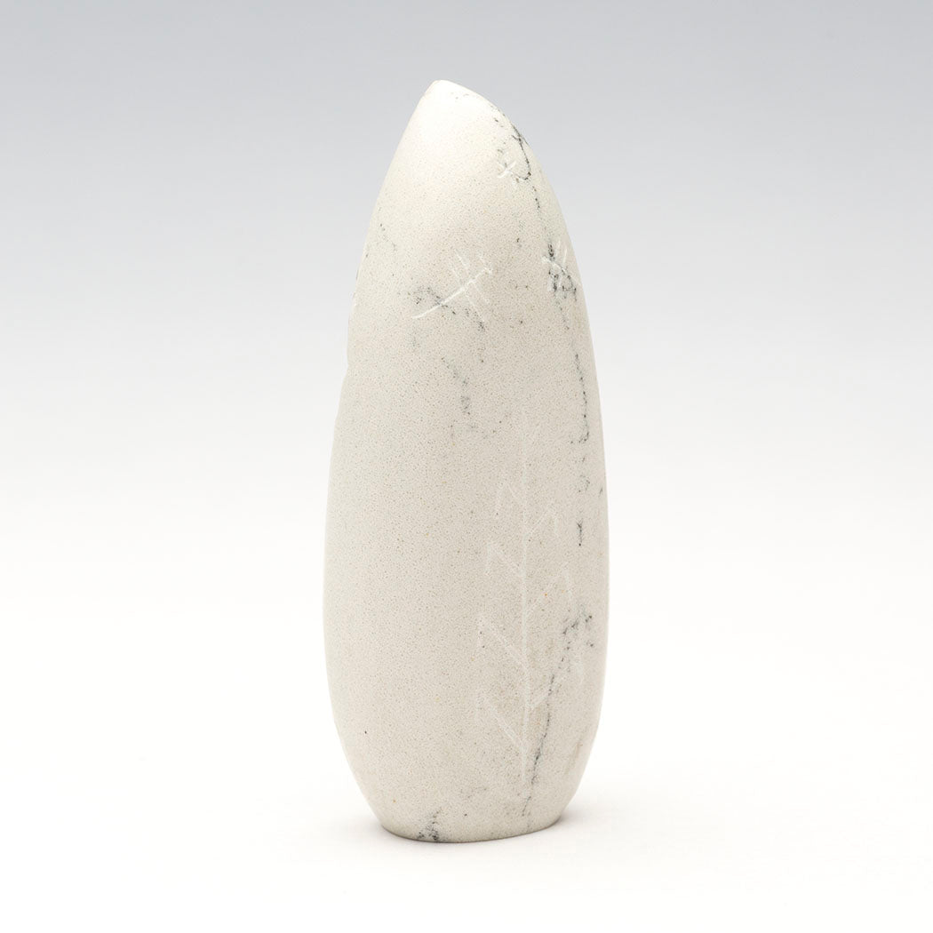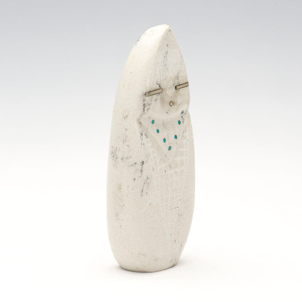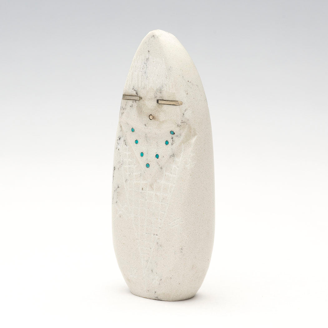 Todd Westika's Corn-Maiden with gorgeous sterling silver facial features is sculpted from lovely howlite, a borate mineral often referred to as White Buffalo Stone because it resembles White Buffalo turquoise from Nevada. An incised corn body, cornstalk and hovering Dragonflies accent this approximately 2 7/8" tall, 1 1/8" wide and 5/8" deep stunning carving. Although water insects, dragonflies visit corn fields to eat pests like mosquitoes, flies and aphids, perching on corn tassels or stalks.