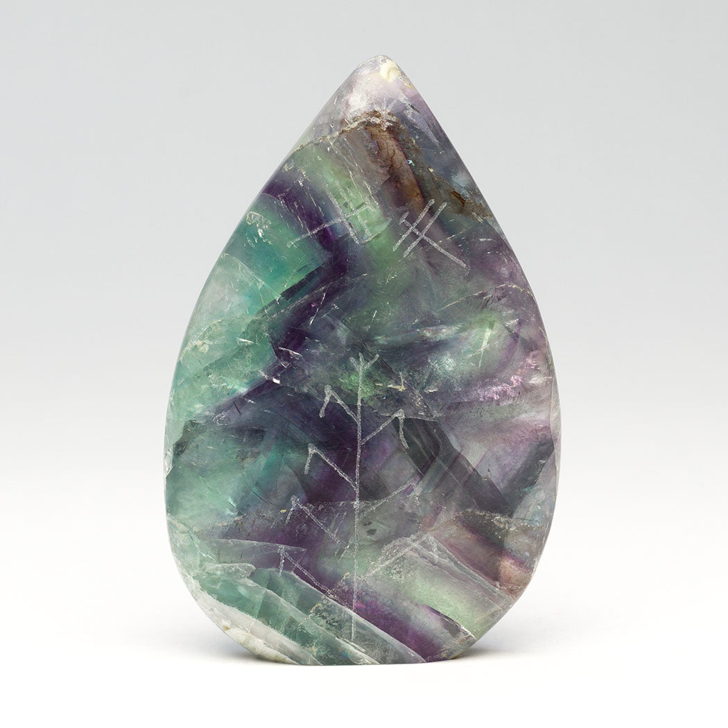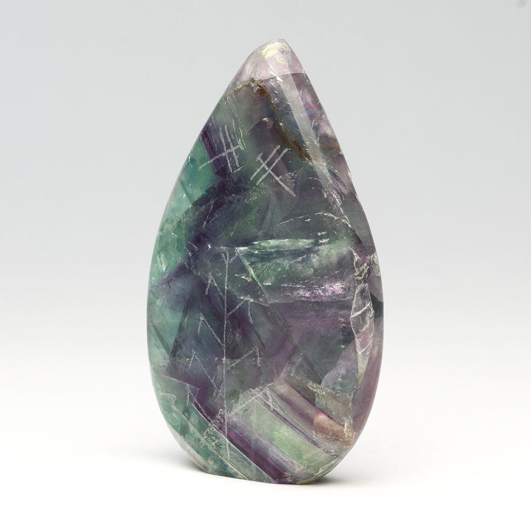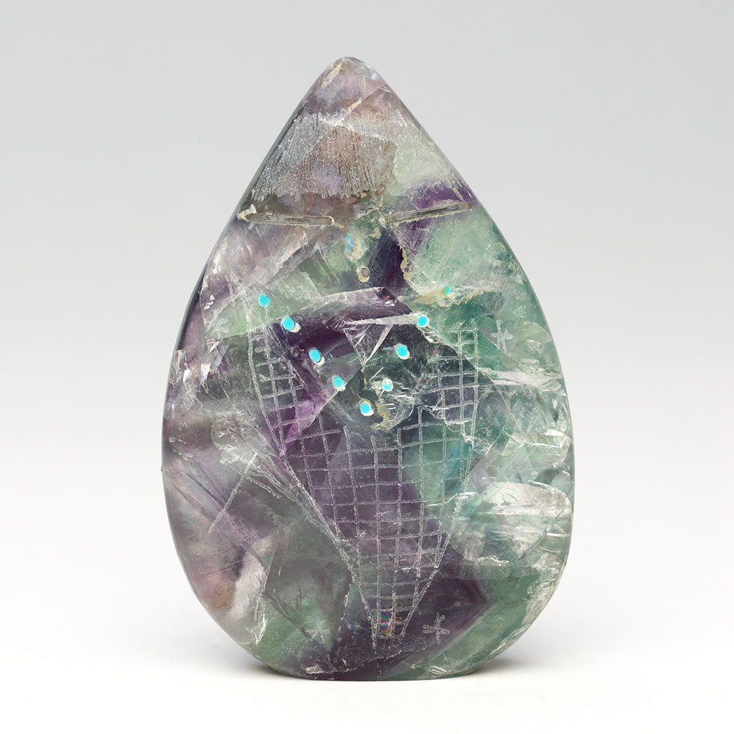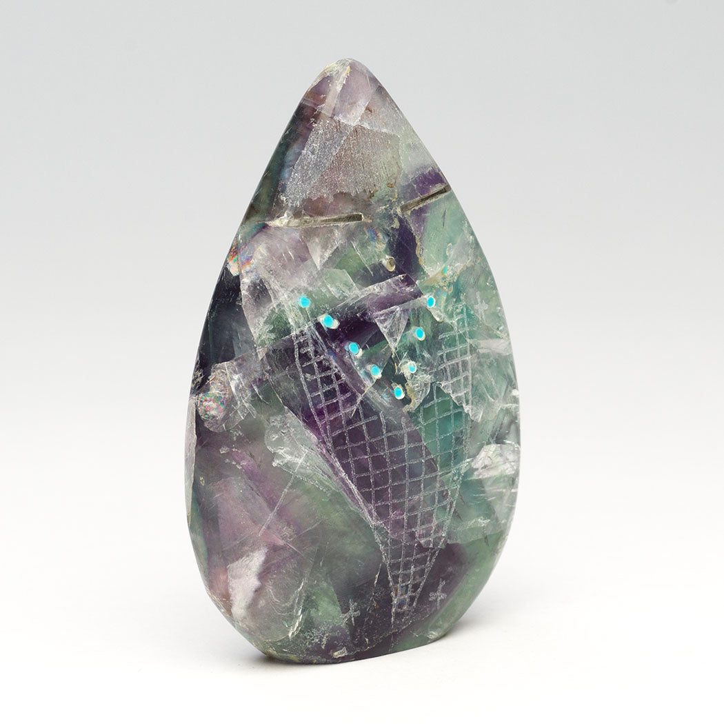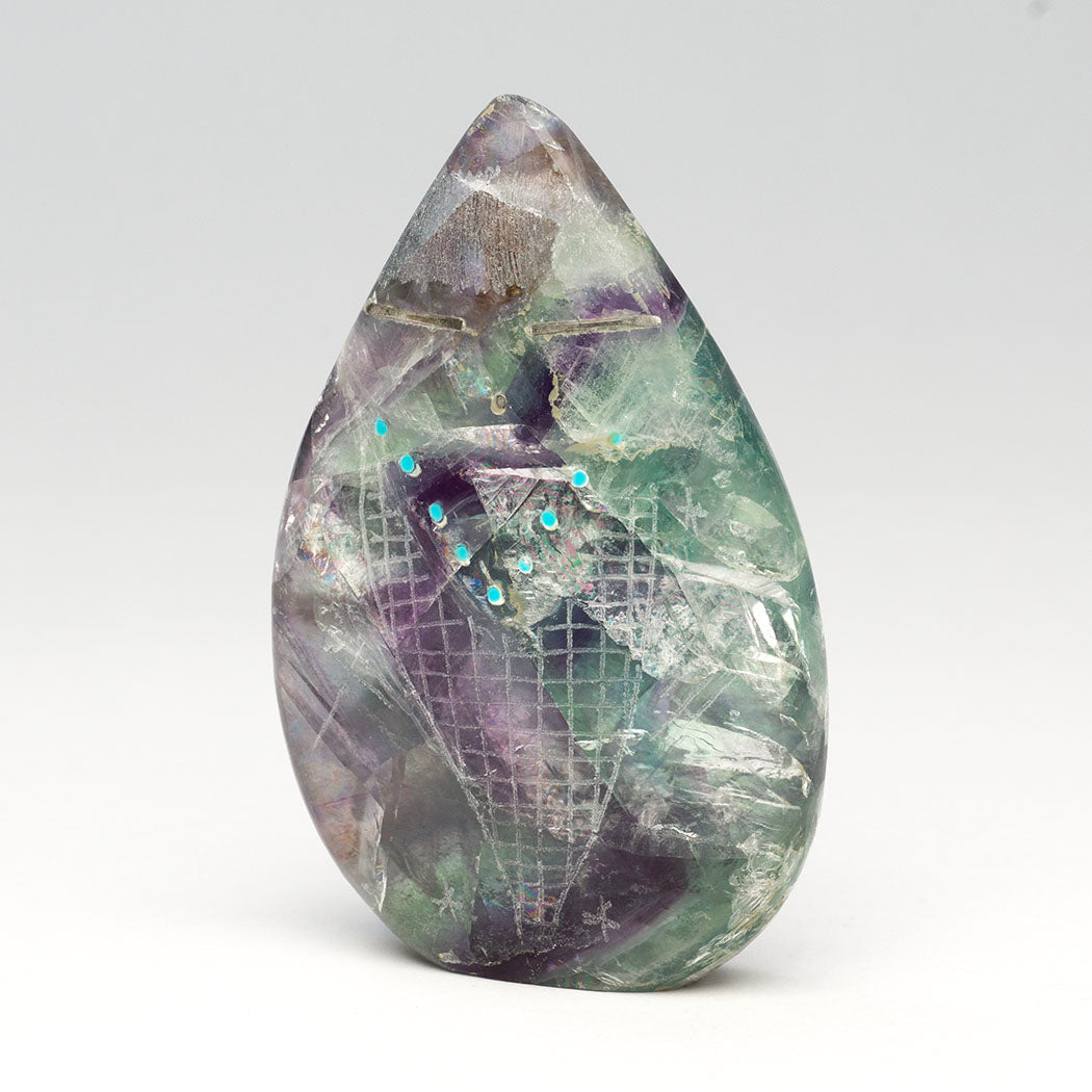 Todd Westika's rainbow fluorite Corn Maiden has beautiful rainbow flashes. Some of them can be seen in the photos, look closely. The magical rainbows are complimented by sgraffito-etched stars and Dragonfly elements. The sterling silver-eyed Corn Maiden wears a tiny necklace from turquoise stones elegantly inlaid above an incised corn body. About 2 1/4" wide, 3 7/8" tall and 3/4" deep.