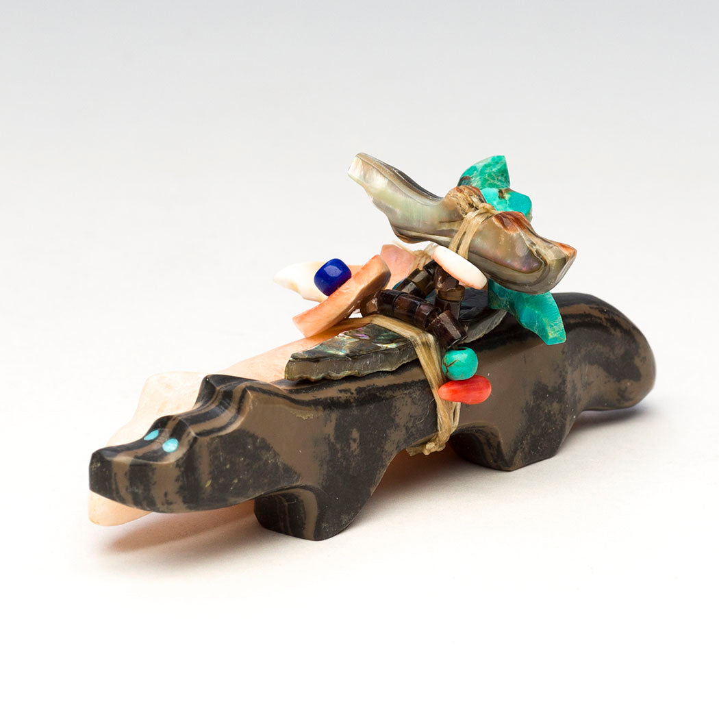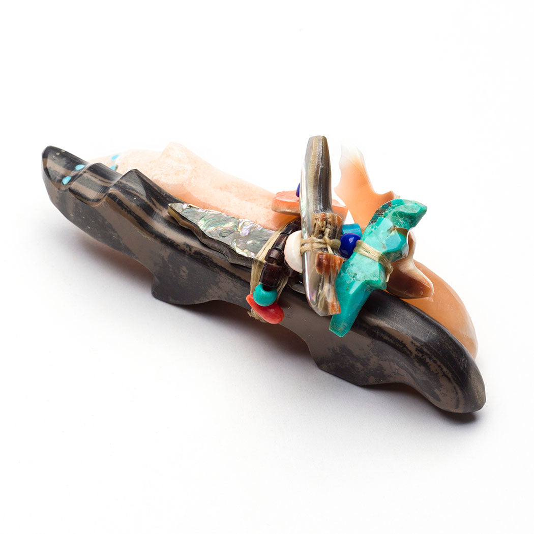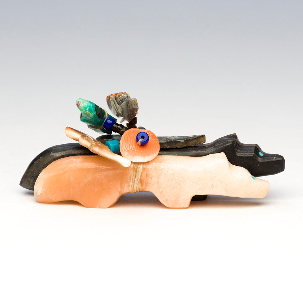 A wonderful Fox (Wolf or Coyote) family is carved by Jayne Quam. Turquoise eyes are inlaid to the alabaster and black jasper parents, while the precious babies are sculpted from spiny oyster shell, shell and turquoise. A lovely abalone point, melon shell, lapis and other assorted beads accompany them. We can advocate for policies that support legislation protecting wild canine habitats and assist in mitigating human-wildlife conflicts. About 3 3/8" long, 1 1/2" wide and 1 1/4" tall.