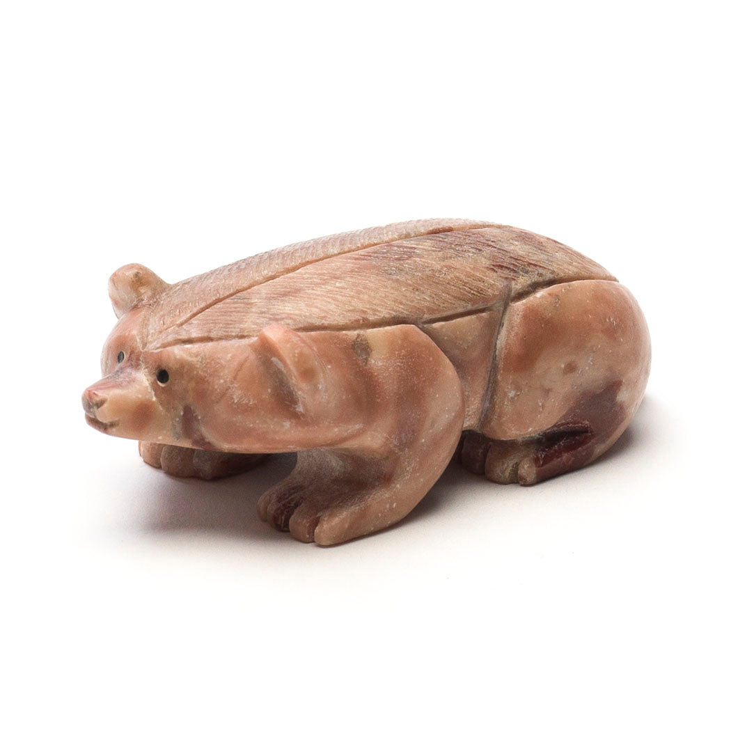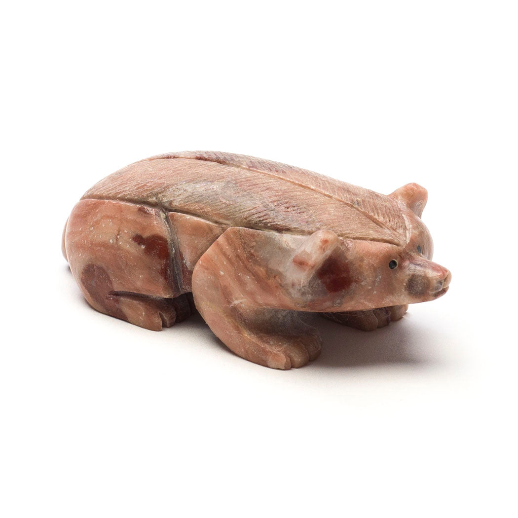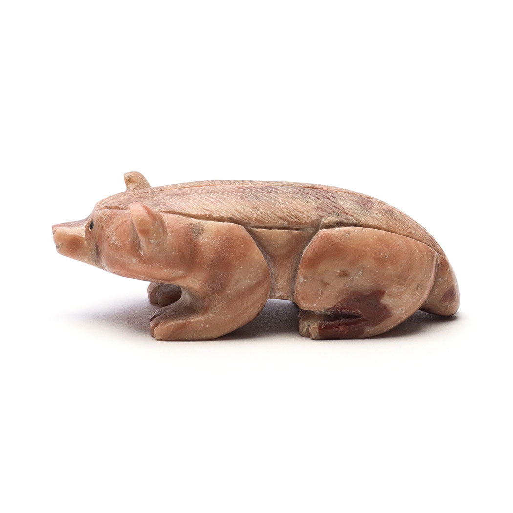 Badger may be diminutive in size but its unflinching tenacity makes it larger than life. Focused eyes are from jet inlays and intricate etching provides classic badger fur details. This intractable and enticing grassland critter burrows in at about 2 1/4" long, 1" wide and 7/8" tall, sculpted from dolomite.