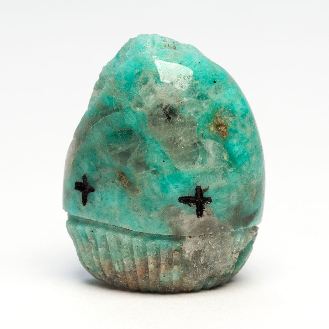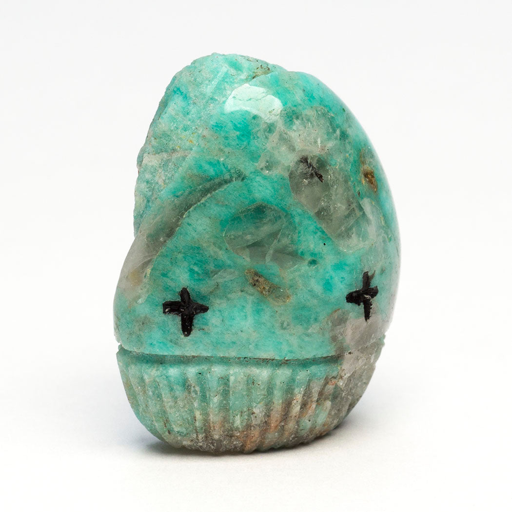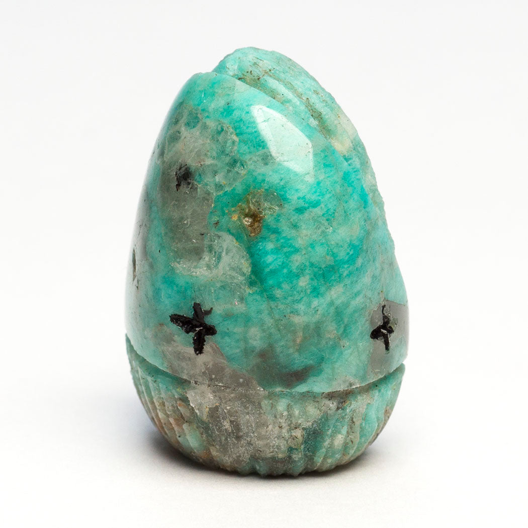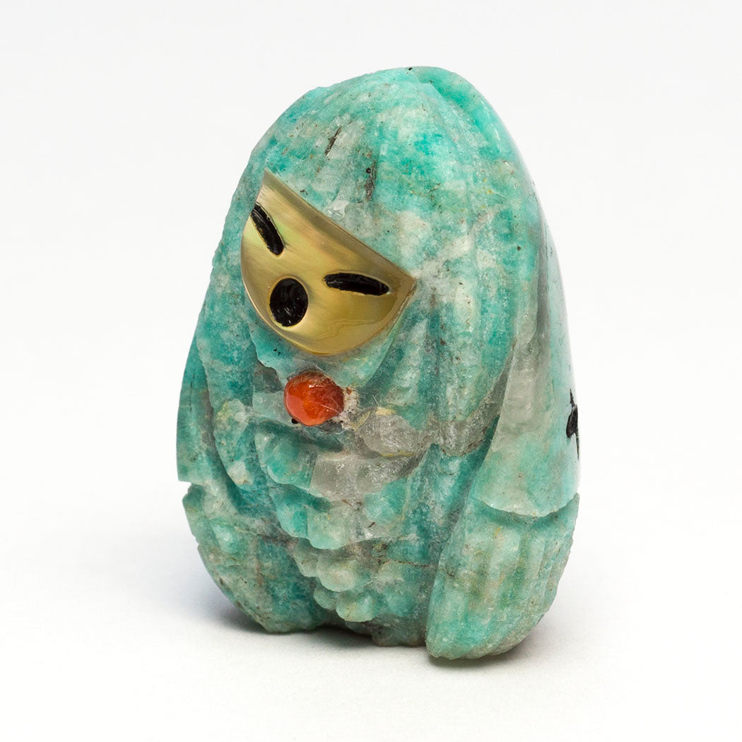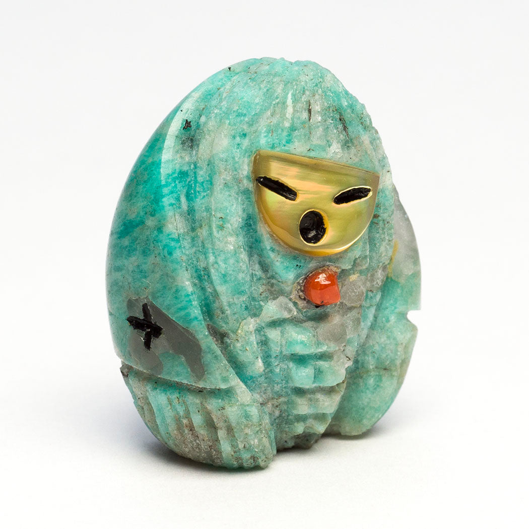 Corn-Maiden is carved from amazonite which is a feldspar mineral mined in places like Colorado, Canada, Australia and Namibia, sometimes called the Stone of Hope. Combine that great energy with Corn Maiden's soul-nourishing goodness and you have a match made in heaven. Soothing facial features are etched into iridescent gold lip shell and filled with jet paste. A lovely red coral cabochon adorns this approximately 1 1/8" tall, 7/8" wide and 5/8" deep friend.