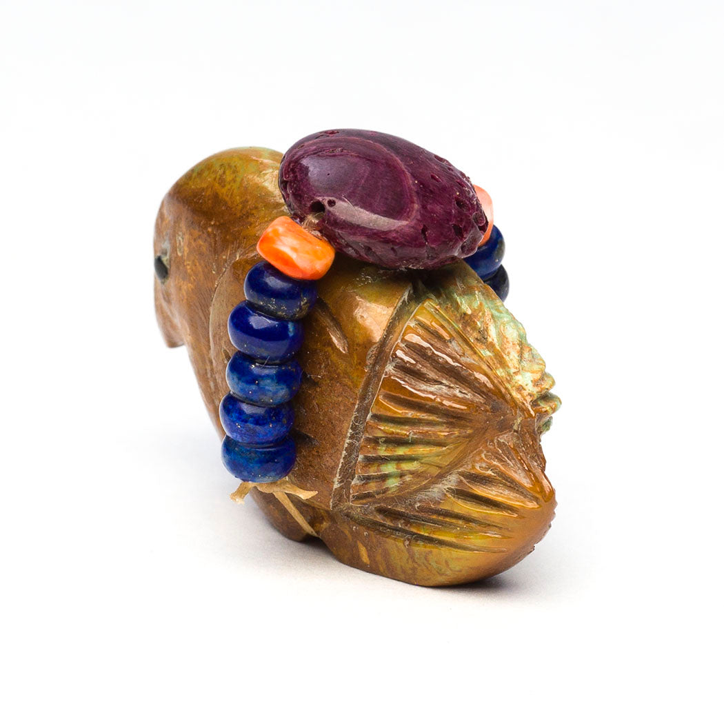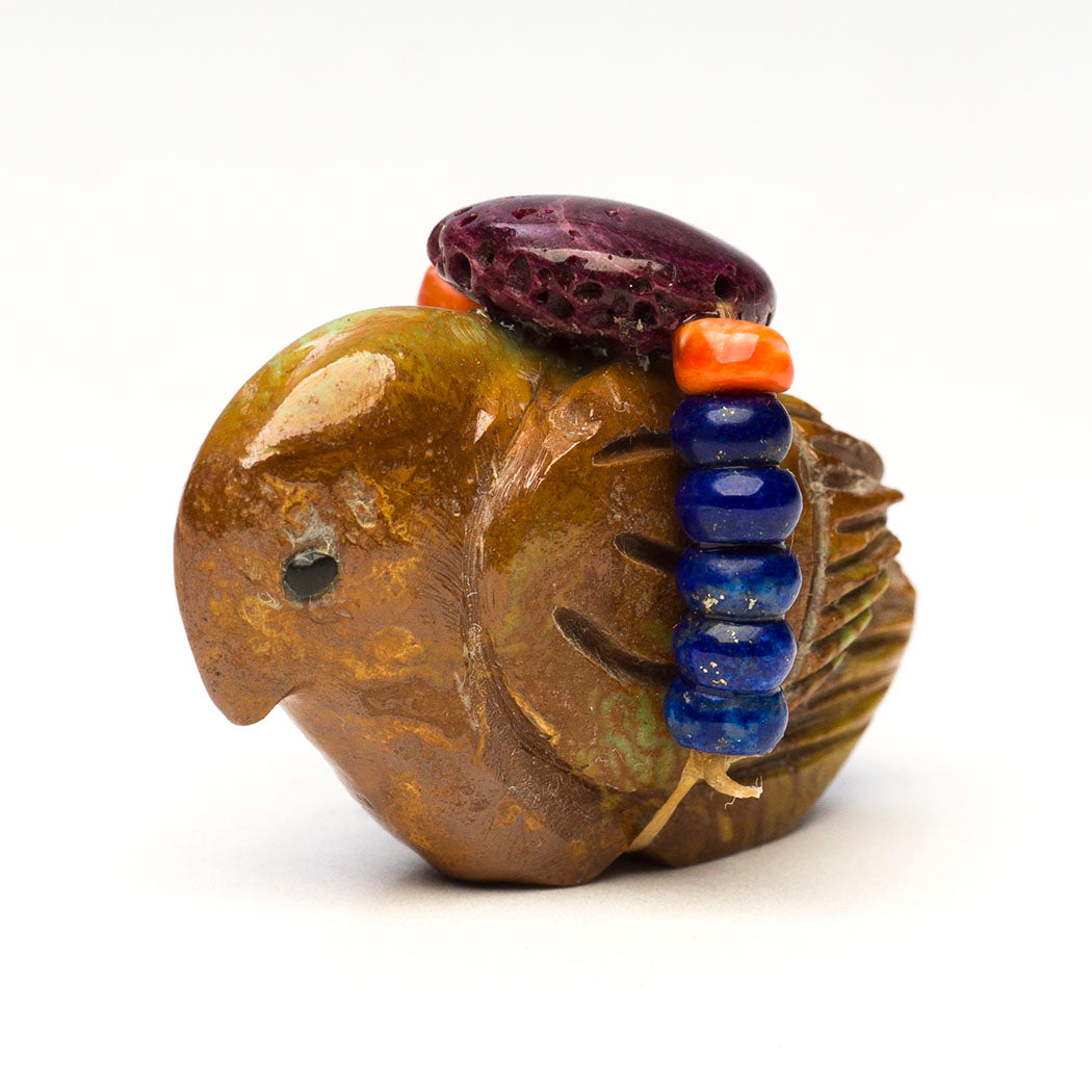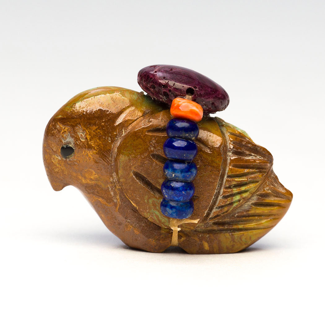 What forest secrets might Kateri Quandelacy Sanchez's songbird sing? This soulful observer with pen shell eyes has been sculpted from turquoise in matrix to a tidy size of approximately 1 1/4" long, 3/4" wide and 7/8" tall. An offering bundle from a stunning purple spiny oyster shell, bright orange spiny oyster shell and plump as blueberries lapis lazuli beads is given in thankfulness for feathered crooners and their meaningful melodic songs.