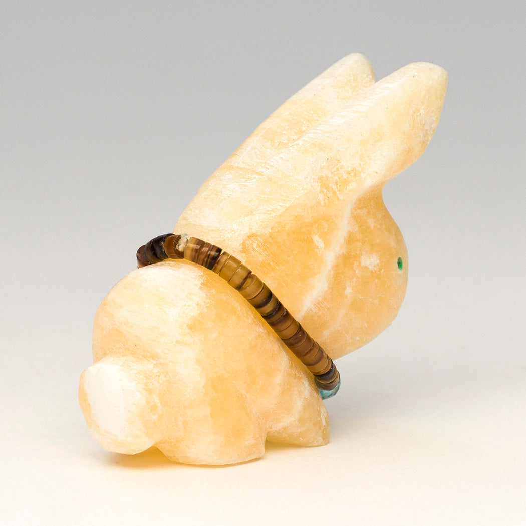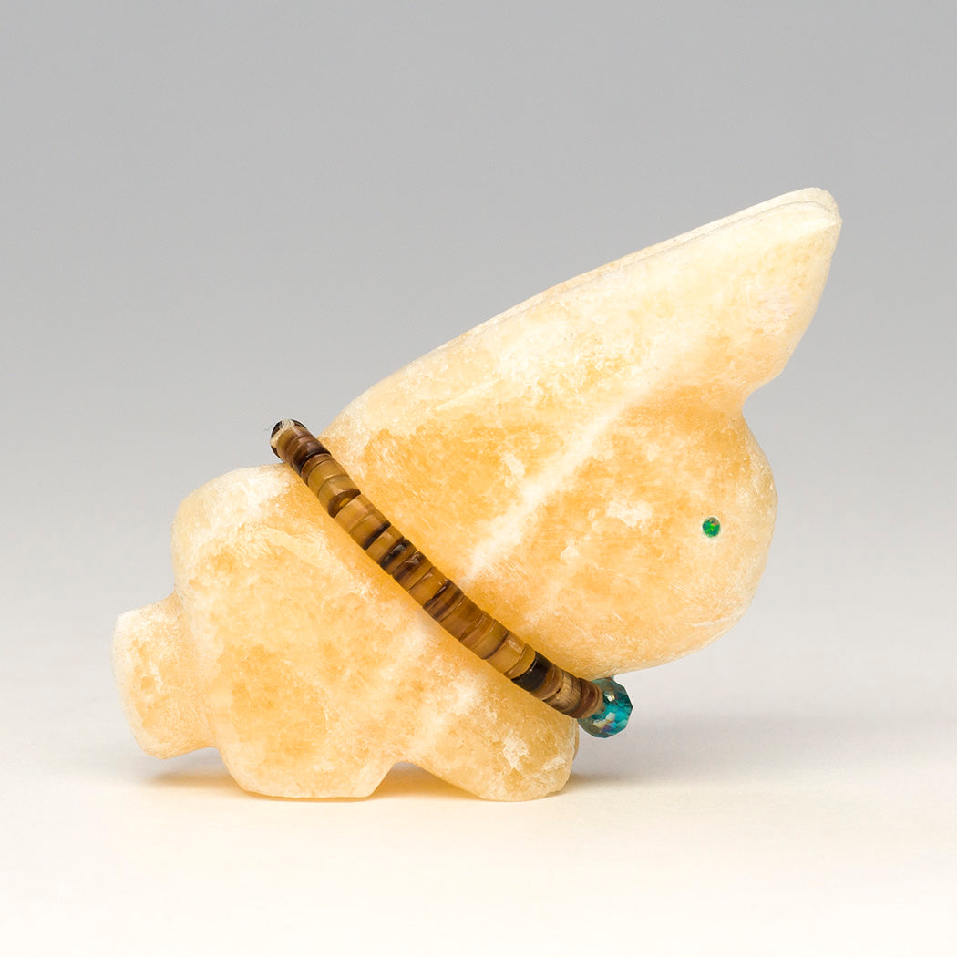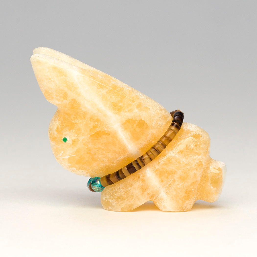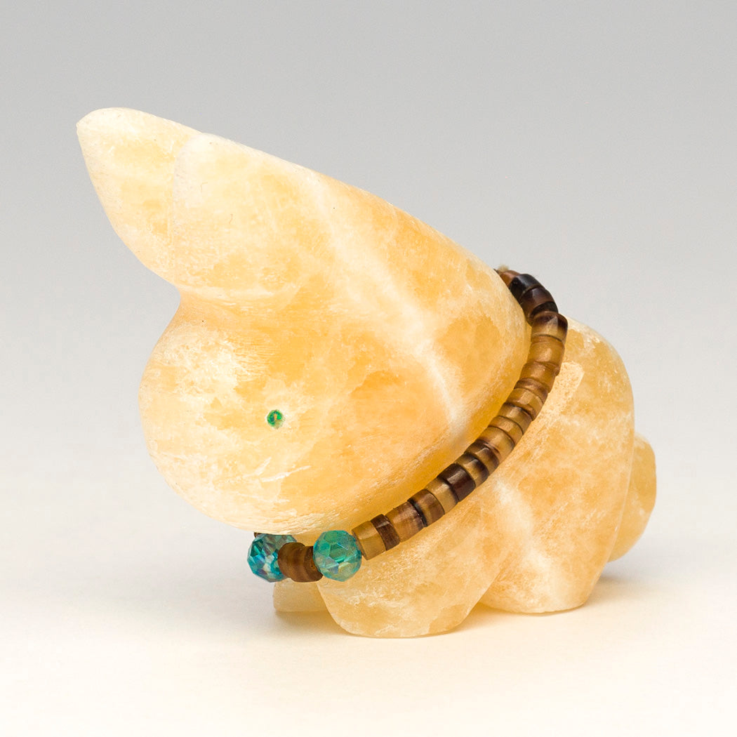 Join Benina Kallestewa's Bunny as it hops through a darling daily adventure helping you to flow through life with sweetness. Carved from orange calcite, dimensions of this cottontail friend are approximately 2 1/8" long, 3/4" wide and 1 3/4" tall. Dancing eyes are from cultured opal inlays and a tiny offering necklace is from pen shell and refreshing aquamarine faceted beads.