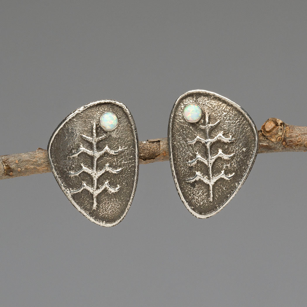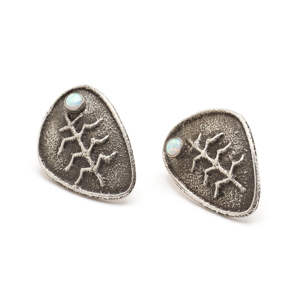 Full moons from lovely cultured opal cabochons bless the sweet Corn stalks that are ready for harvest in noted jeweler Cordell Pajarito's tufa cast sterling silver post earrings. Corn is a sacred crop used as sustenance and in traditional ways for Indigenous Pueblo cultures. This one of a kind design was carved into tufa stones then molten sterling silver was skillfully poured in capturing the scene for eternity. Signed by the artist. About 1 1/8" long, 3/4" wide and 1/8" deep, of medium-weight in wearability.