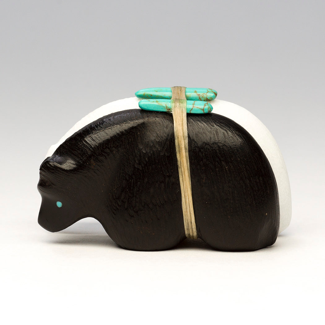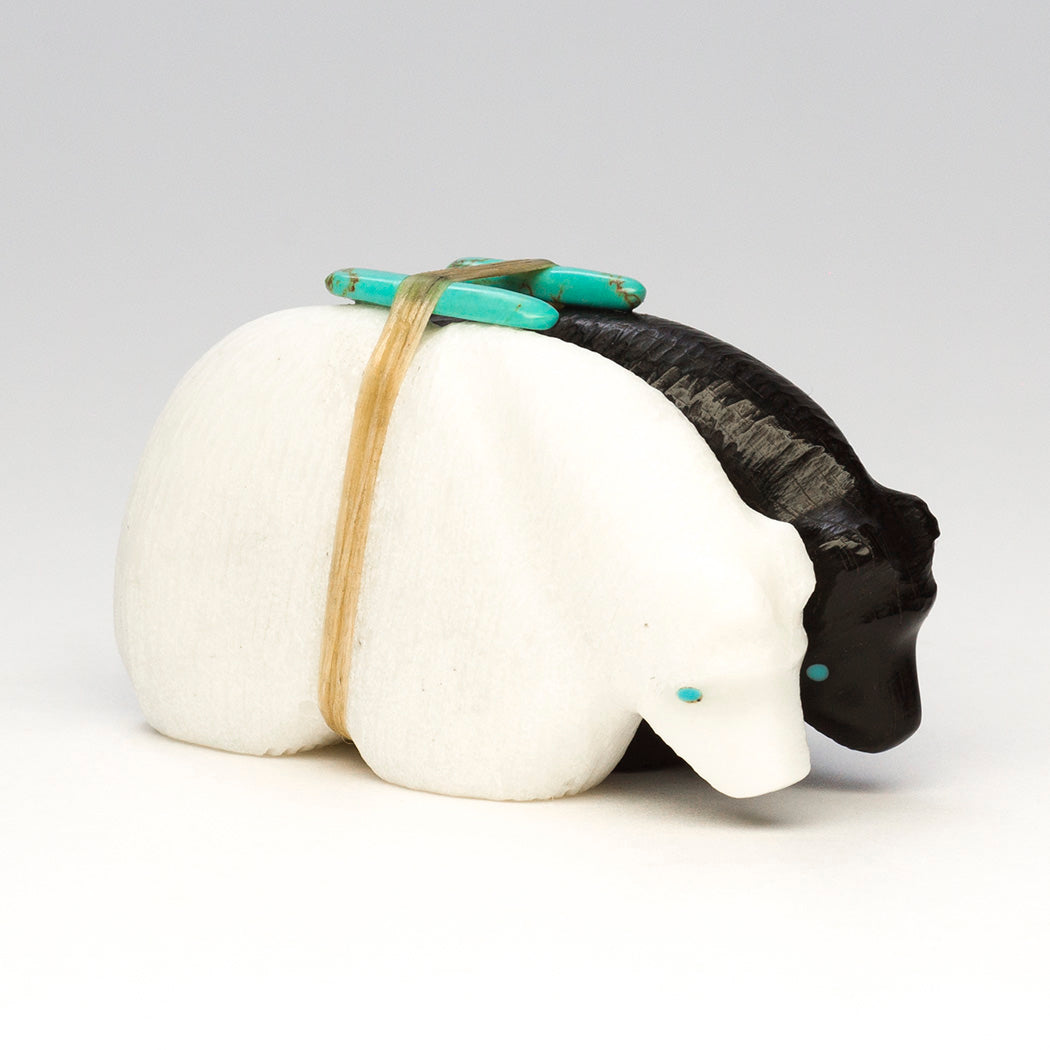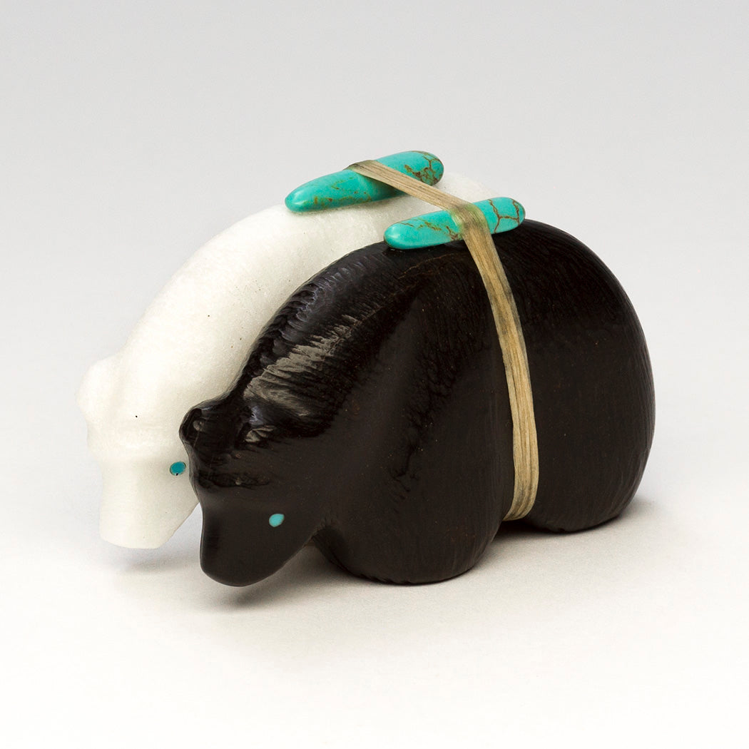 Medicine-Bear pair is carved from jet and marble with lightly etched coats. Eyes that tell a story and sleek offering bundles are from turquoise. All together measurements are about 2 1/2" long, 1 1/4" wide and 1 1/2" tall.