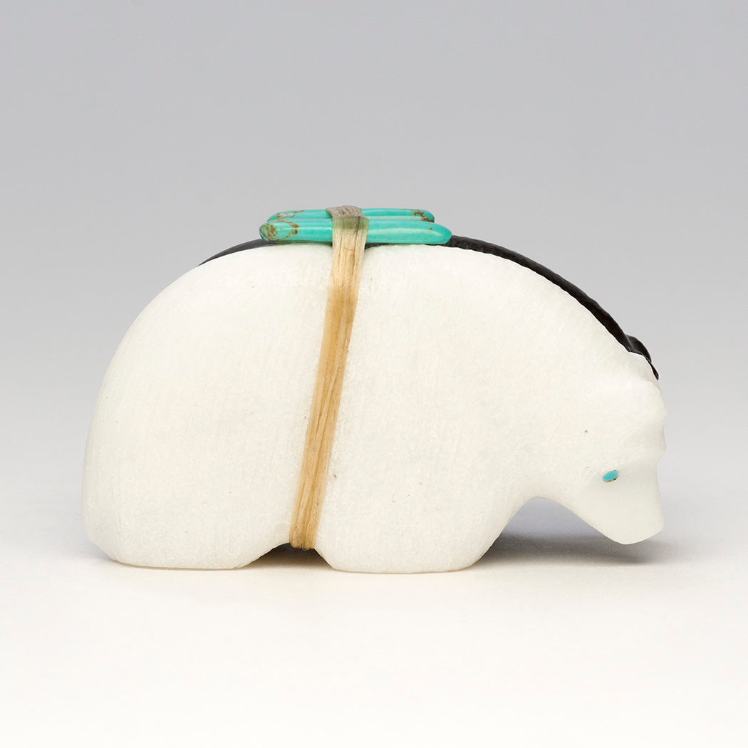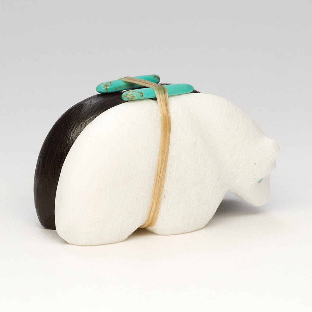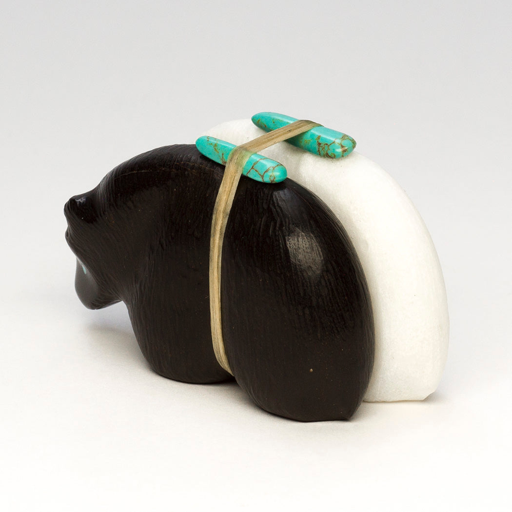 Medicine-Bear pair is carved from jet and marble with lightly etched coats. Eyes that tell a story and sleek offering bundles are from turquoise. All together measurements are about 2 1/2" long, 1 1/4" wide and 1 1/2" tall.