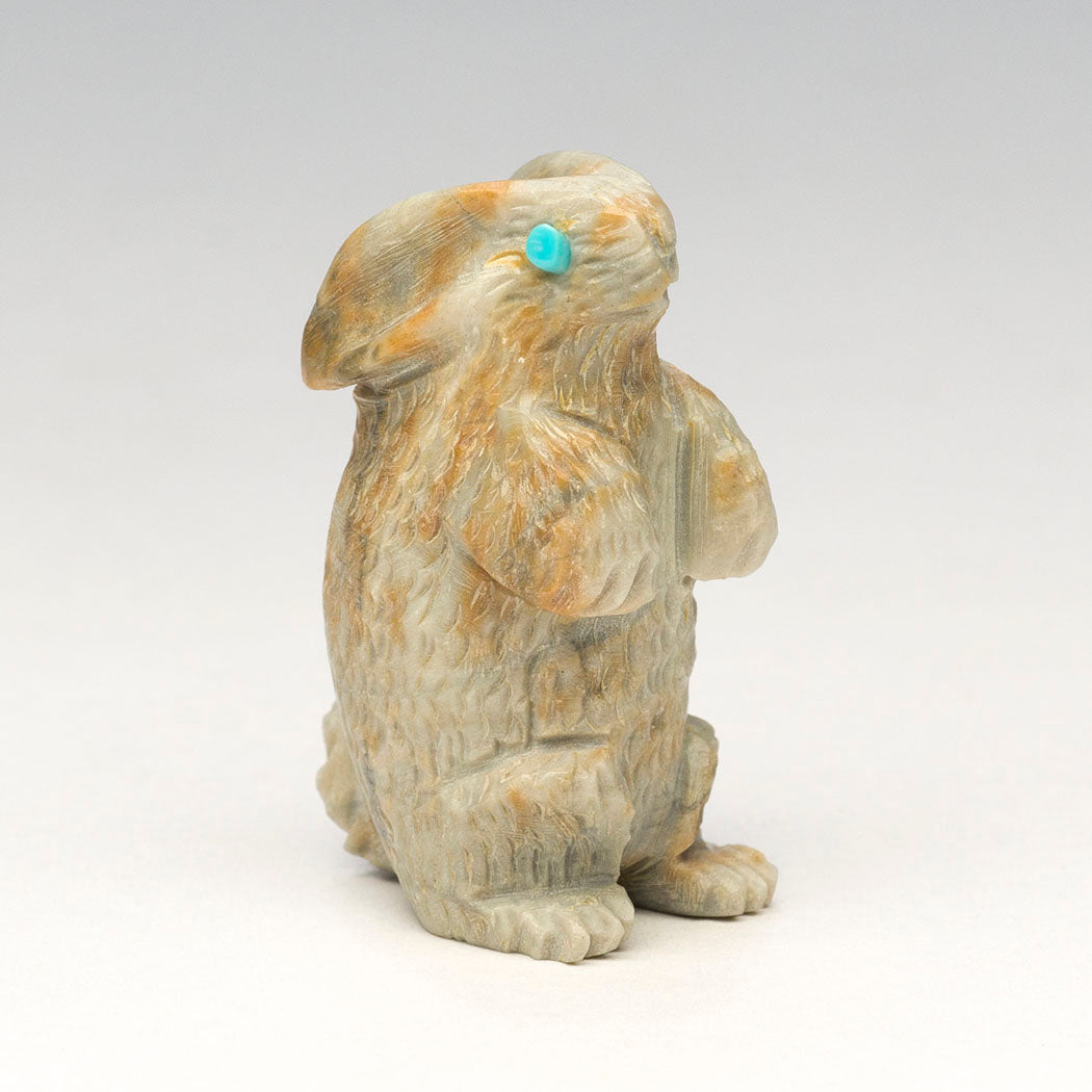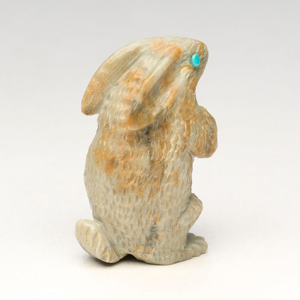 Sedrick Banteah's dear cottontail Rabbit from Picasso marble will nibble bark from red willow branches and other woody plants to sustain itself through the winter months. Alert eyes from turquoise inlays seek out the choicest bites, while a beautifully-etched cozy coat keeps this approximately 1 1/2" tall, 3/4" wide and 7/8" deep woodland fauna warm and protected.