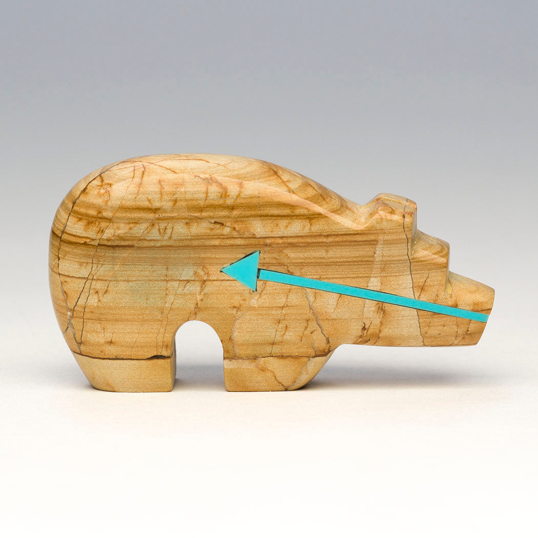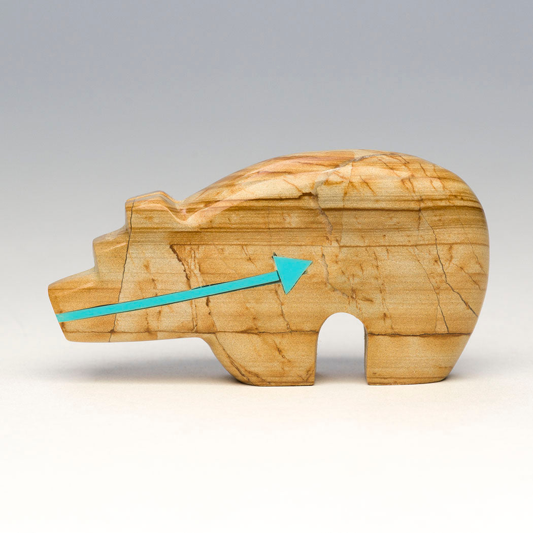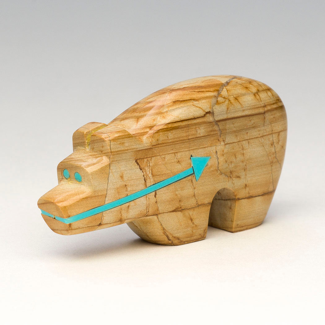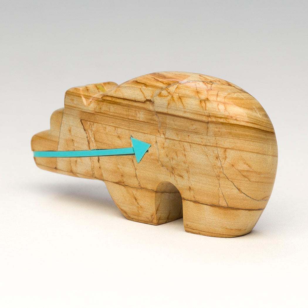 Scenic landscapes dwell in Bernard Laiwakete's picture jasper Bear that's like a snapshot of Mother Earth's natural beauty. Picture jasper is essentially stacked layers of ancient sediment, prehistoric volcanic ash and mineral deposits. It is said to bolster a deep connection to nature. Refreshing blue turquoise is inlaid for the gentle eyes and a continuous heartline or breath path on this roughly 2 5/8" long, 1/2" wide and 1 3/8" tall nurturing bear.