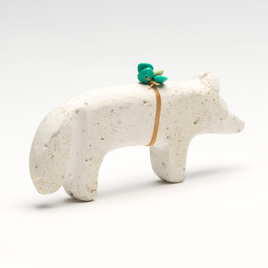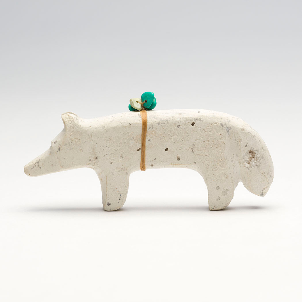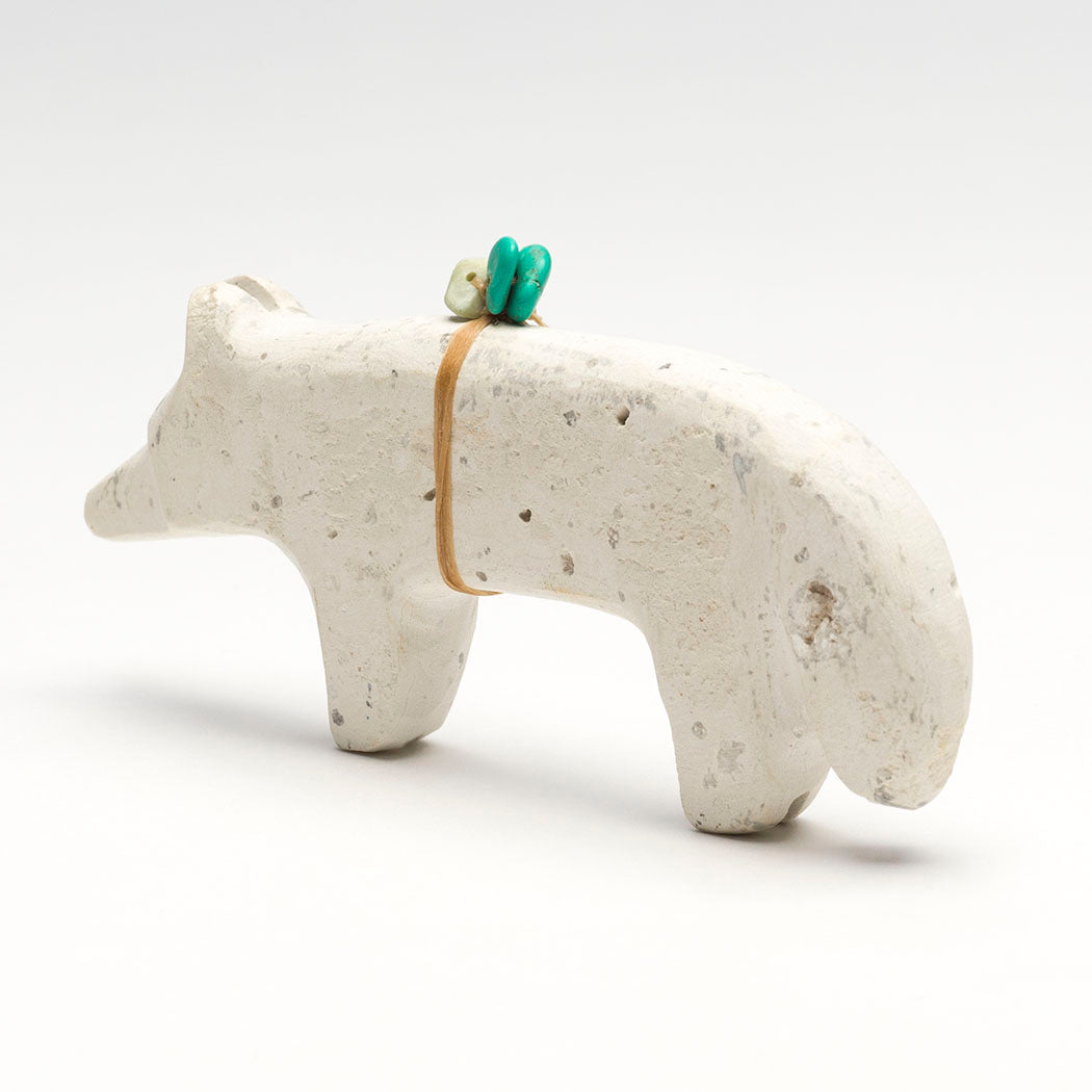 Out exploring new pathways, Salvador Romero's trailblazing Wolf (Coyote or Fox) has been carved from a textured found stone exhibiting neat inclusions and tiny holes. The chalky white hue is quite appealing too. Male wolves sometimes set out on their own in search of new habitats among other reasons, setting an example for us to be action-oriented and trust our judgment in forging new trails in life. About 4 1/4" long, 1/2" wide and 2" tall.