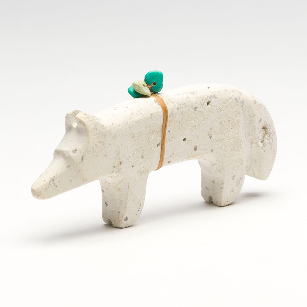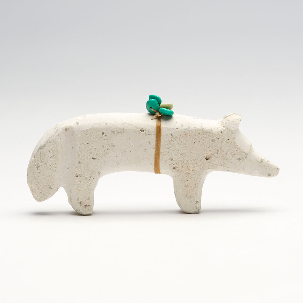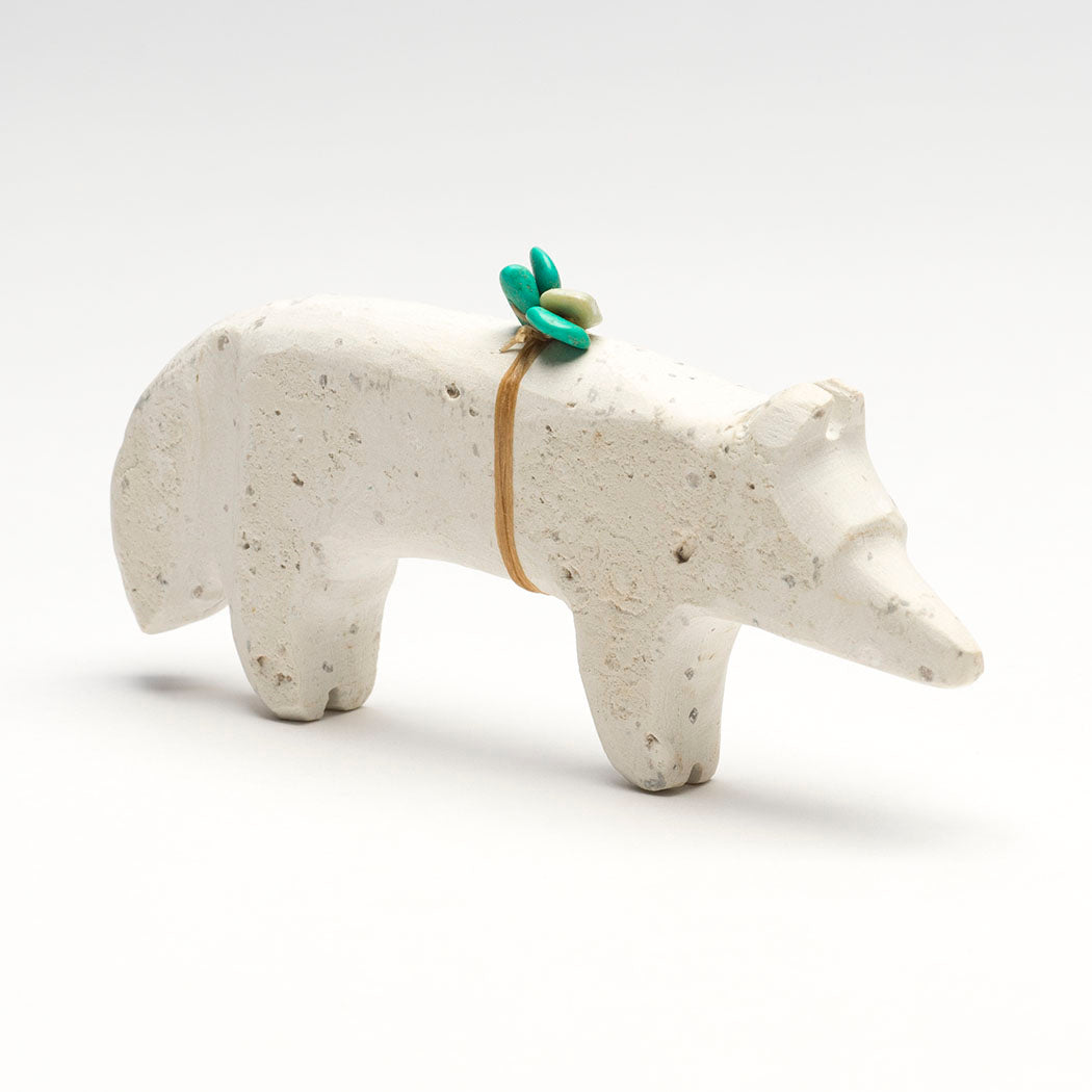 Out exploring new pathways, Salvador Romero's trailblazing Wolf (Coyote or Fox) has been carved from a textured found stone exhibiting neat inclusions and tiny holes. The chalky white hue is quite appealing too. Male wolves sometimes set out on their own in search of new habitats among other reasons, setting an example for us to be action-oriented and trust our judgment in forging new trails in life. About 4 1/4" long, 1/2" wide and 2" tall.