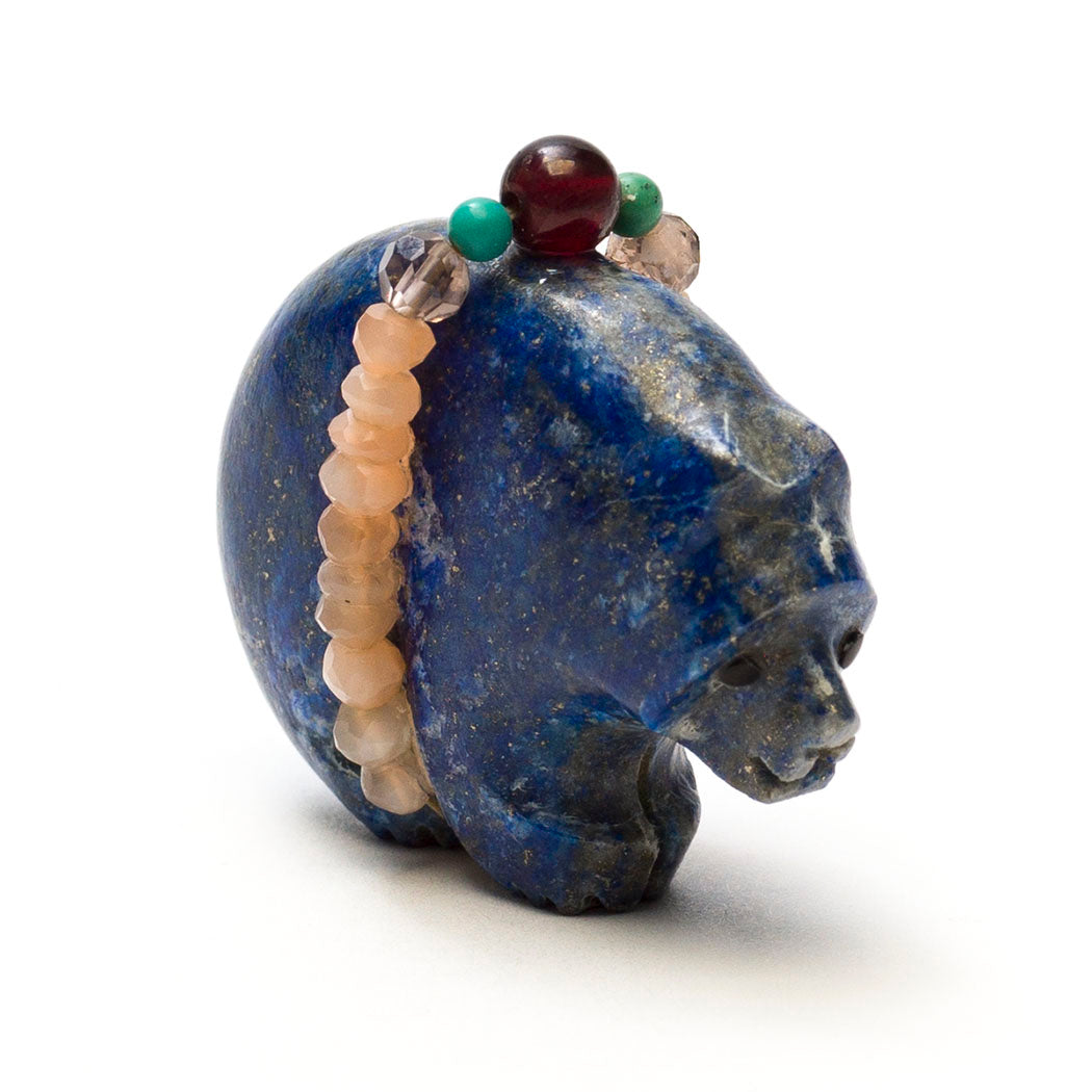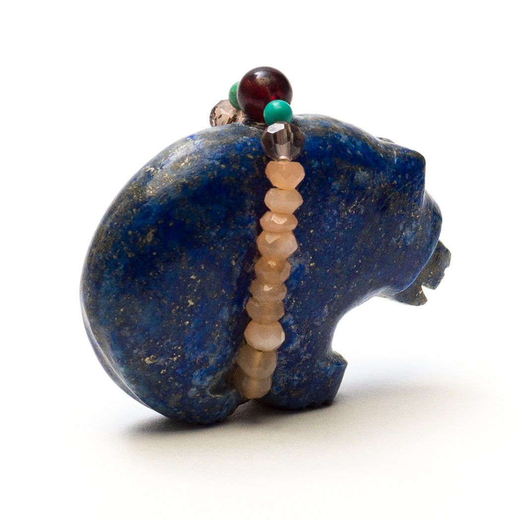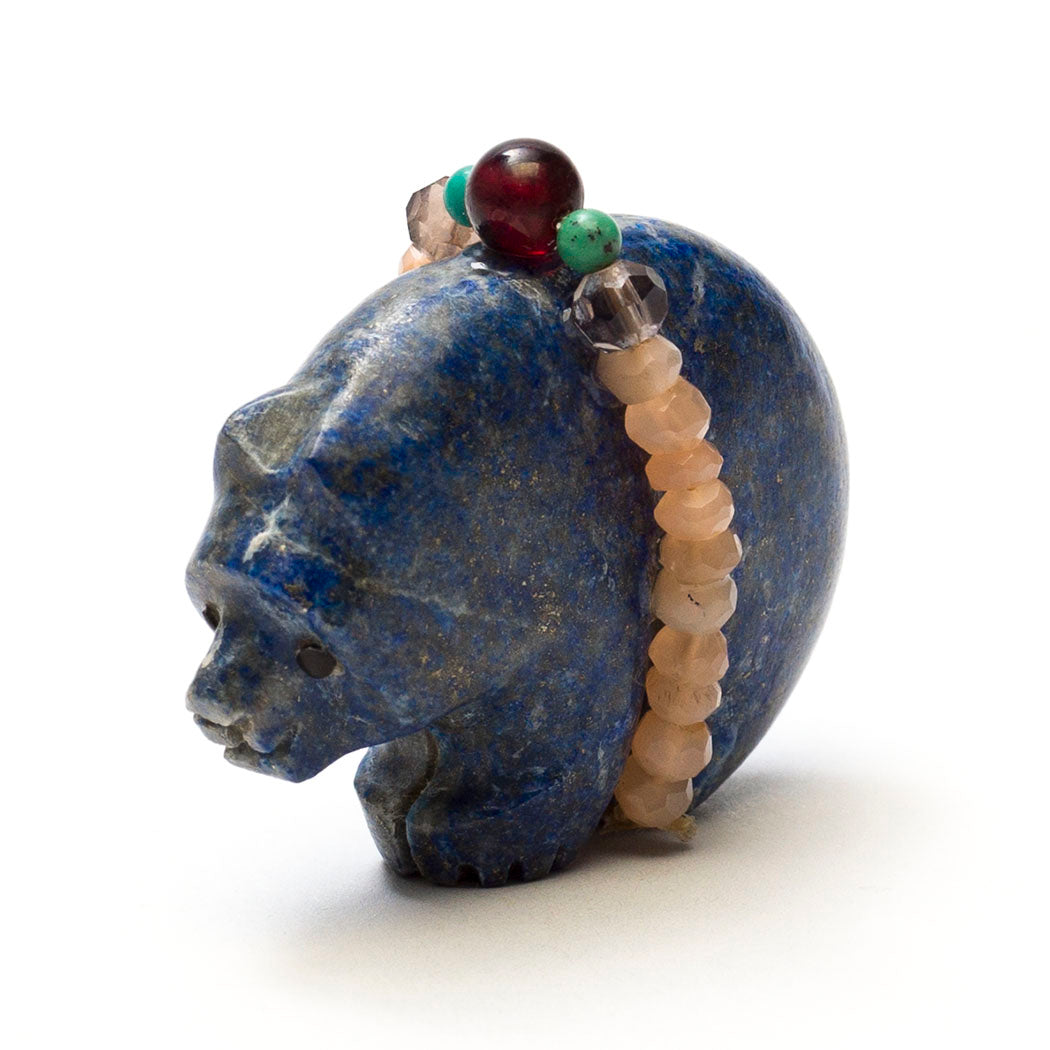 Kateri Quandelacy Sanchez's jet-eyed Bear is sculpted from alluring lapis lazuli rich in cerulean hues. Many cultures associate the color blue with heavenly realms and even immortality. Bits of sparkling pyrite can be seen in the stone complimented by a faceted pink aventurine, garnet, perhaps spectrolite or smoky quartz, and turquoise bead offering bundle. About 1 5/8" long, 3/4" wide and 1 3/8" tall.