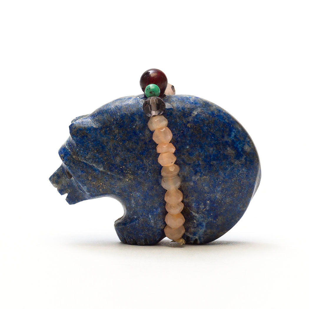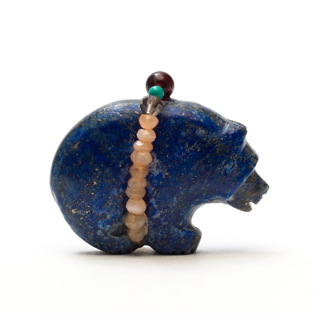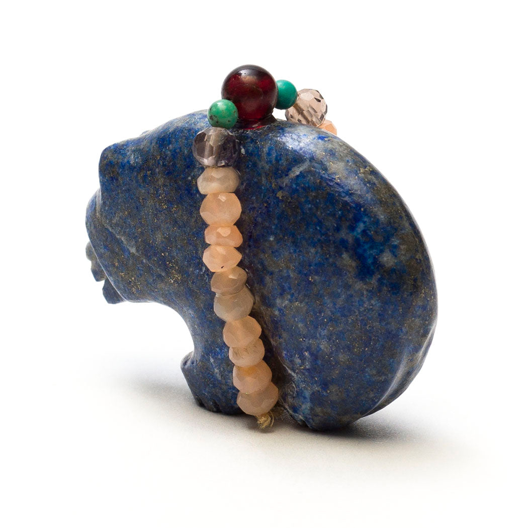 Kateri Quandelacy Sanchez's jet-eyed Bear is sculpted from alluring lapis lazuli rich in cerulean hues. Many cultures associate the color blue with heavenly realms and even immortality. Bits of sparkling pyrite can be seen in the stone complimented by a faceted pink aventurine, garnet, perhaps spectrolite or smoky quartz, and turquoise bead offering bundle. About 1 5/8" long, 3/4" wide and 1 3/8" tall.