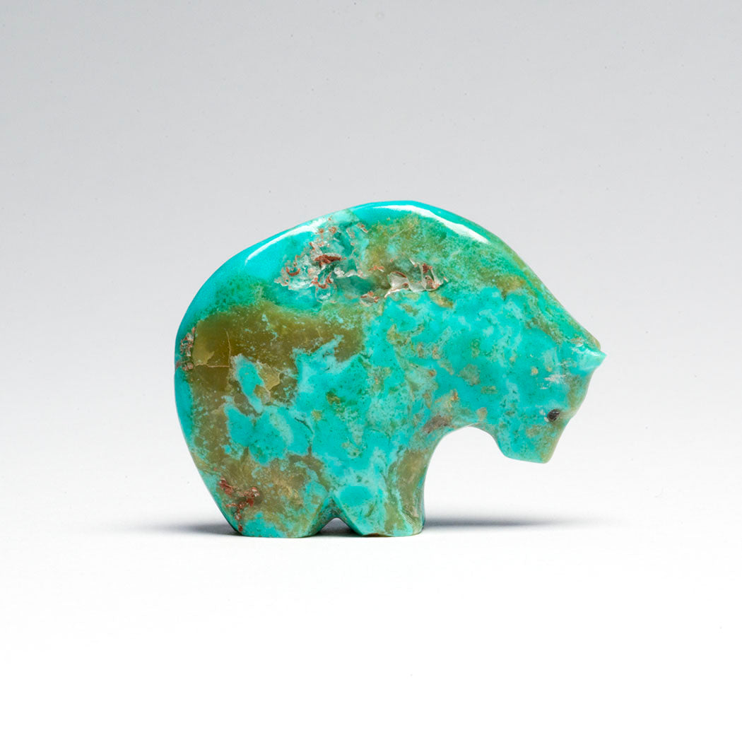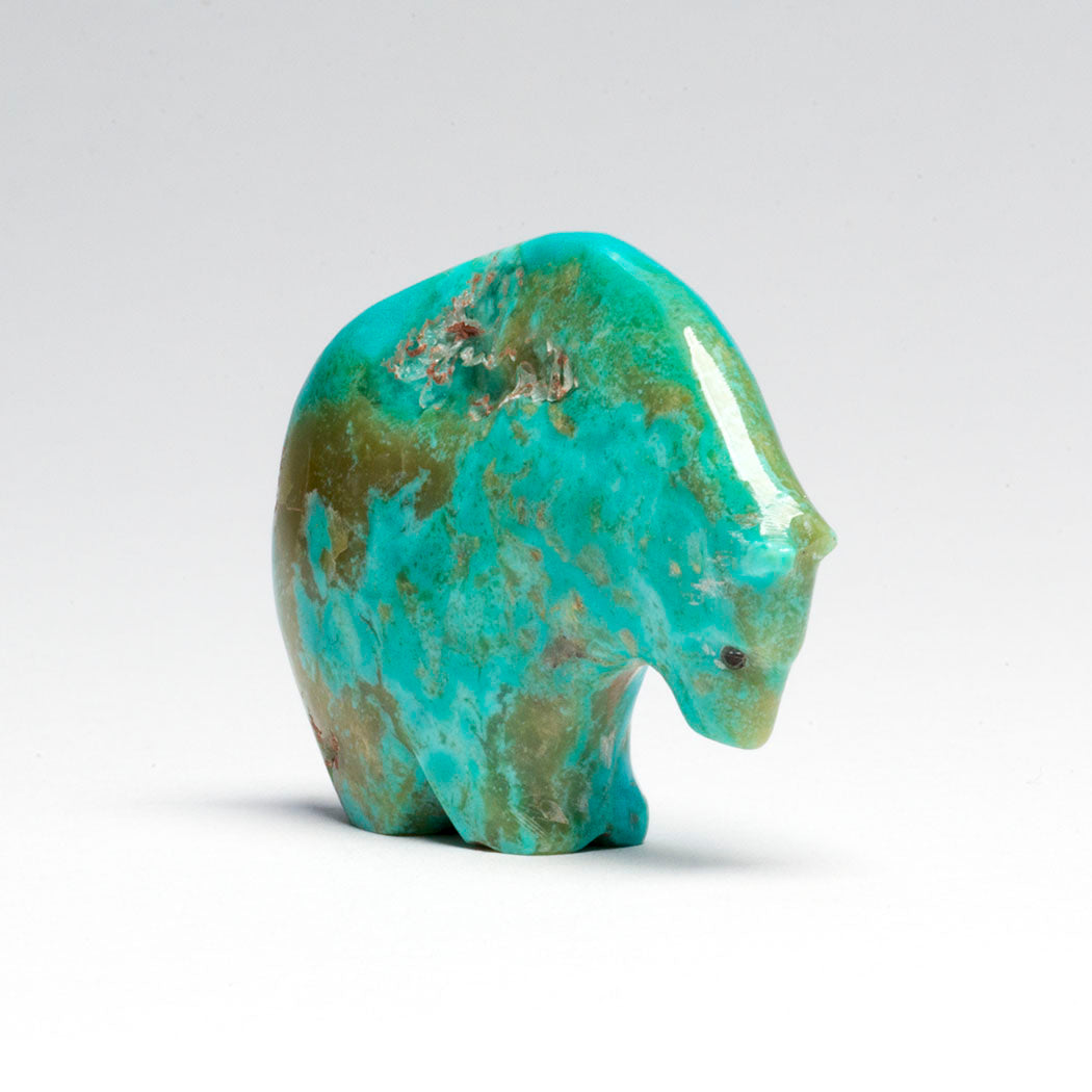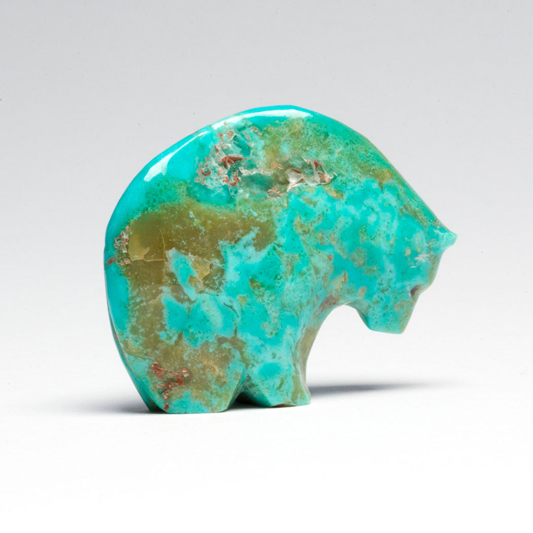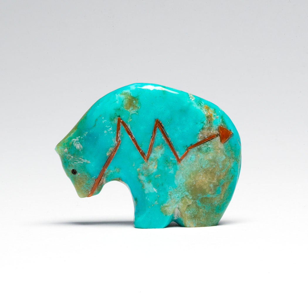 Medicine-bear brings calm and peace to your day. The passageway to a bear's den or cave is somewhat rounded like this bear's back. Inside the den, lean months are survived through torpor setting a good example for us to stop and take care of ourselves too. Carved from turquoise, measurements are about 1 7/8" long, 3/8" wide and 1 3/8" tall. Eyes are from jet inlays, while an alternating heartline or breath path is set with lovely red coral.