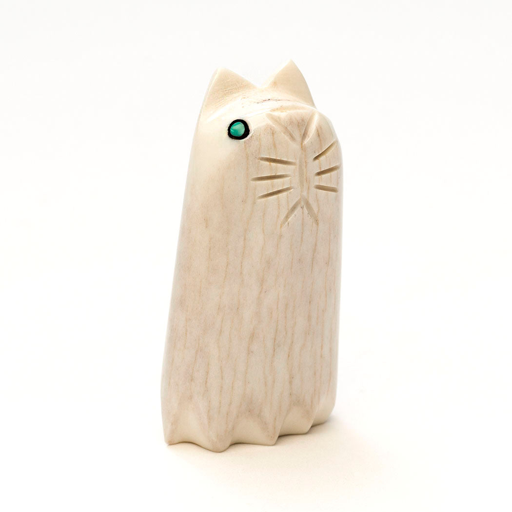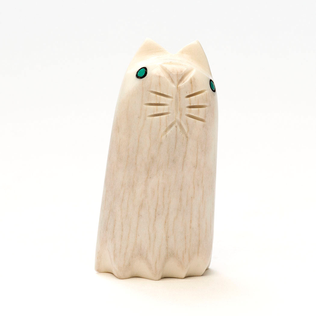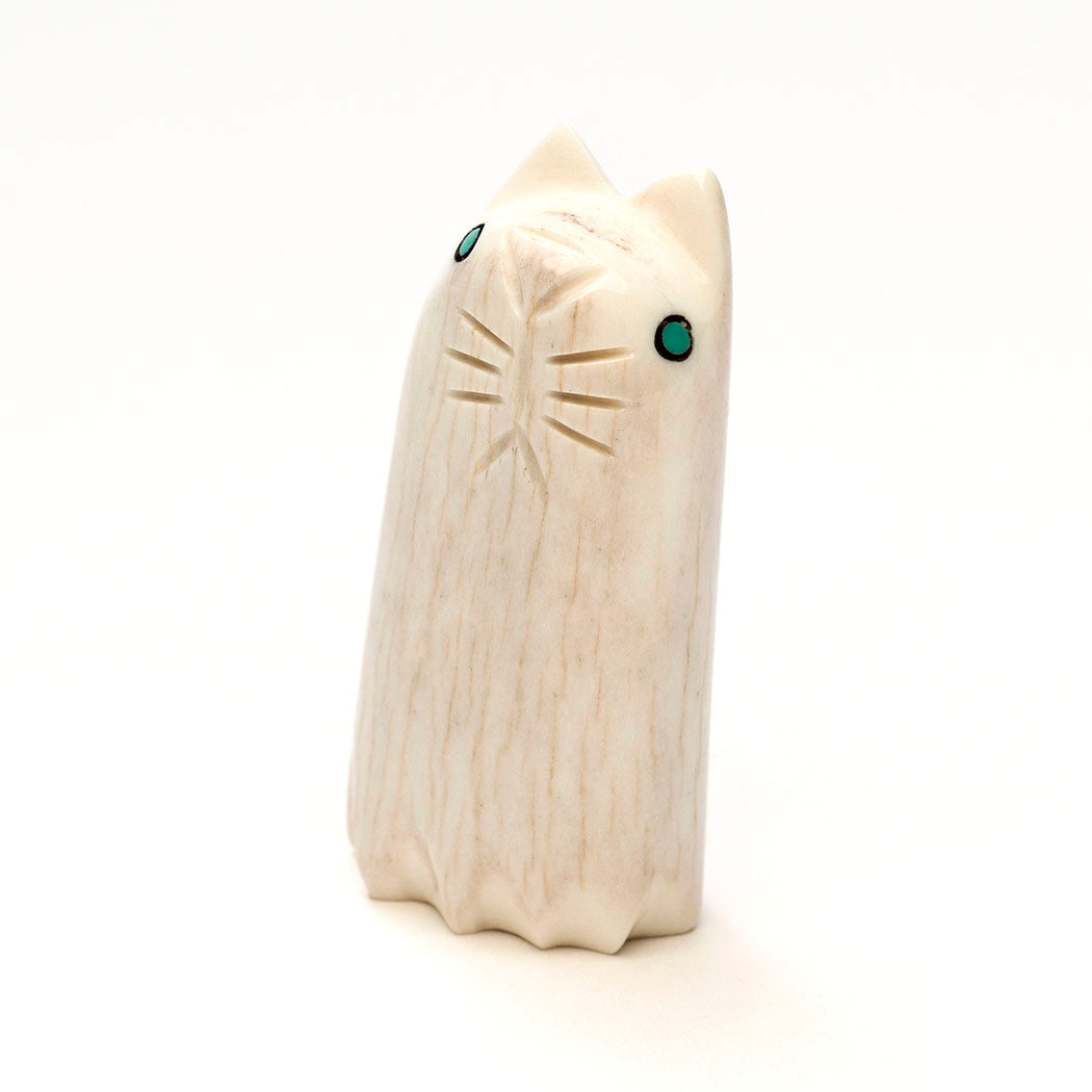A kitty cat masquerades as a sheet-covered ghost in Robert Michael Weahkee's fun antler carving. Eyes are from turquoise in jet paste, while whiskers are deeply etched. Robert is a fourth-generation carver from Zuni Pueblo whose late grandmother was renowned artist Edna Leki. Please click