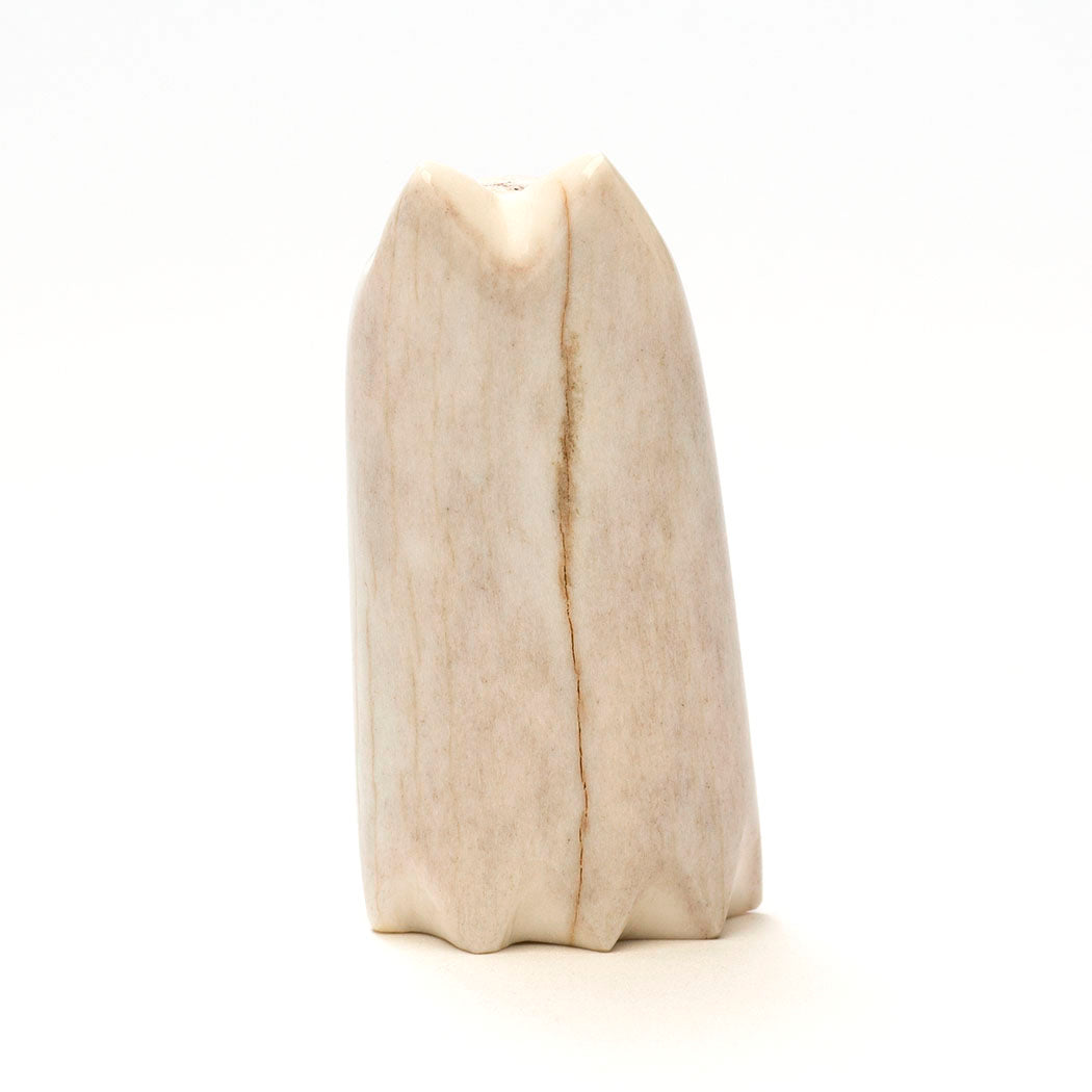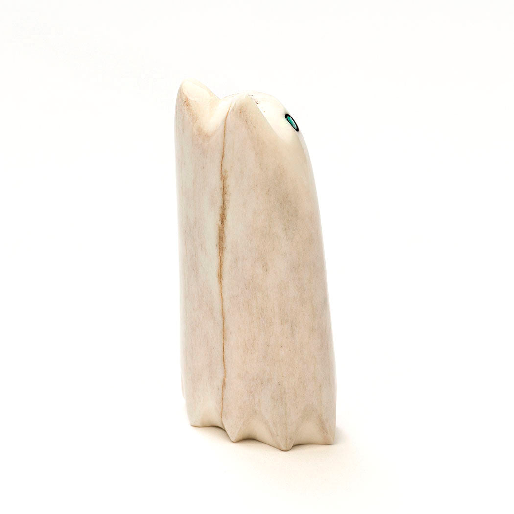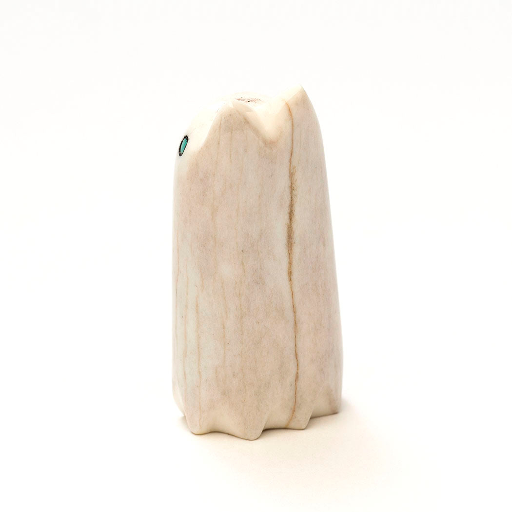 A kitty cat masquerades as a sheet-covered ghost in Robert Michael Weahkee's fun antler carving. Eyes are from turquoise in jet paste, while whiskers are deeply etched. Robert is a fourth-generation carver from Zuni Pueblo whose late grandmother was renowned artist Edna Leki. Please click