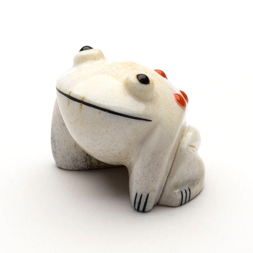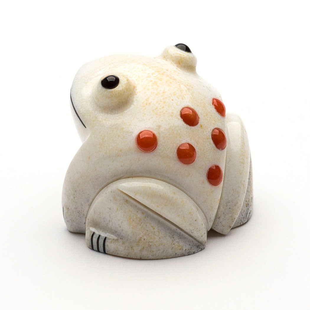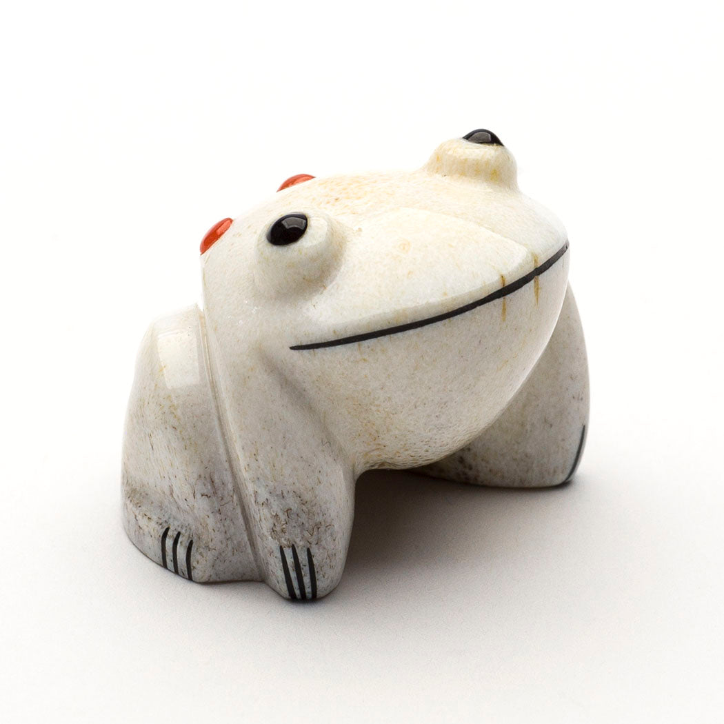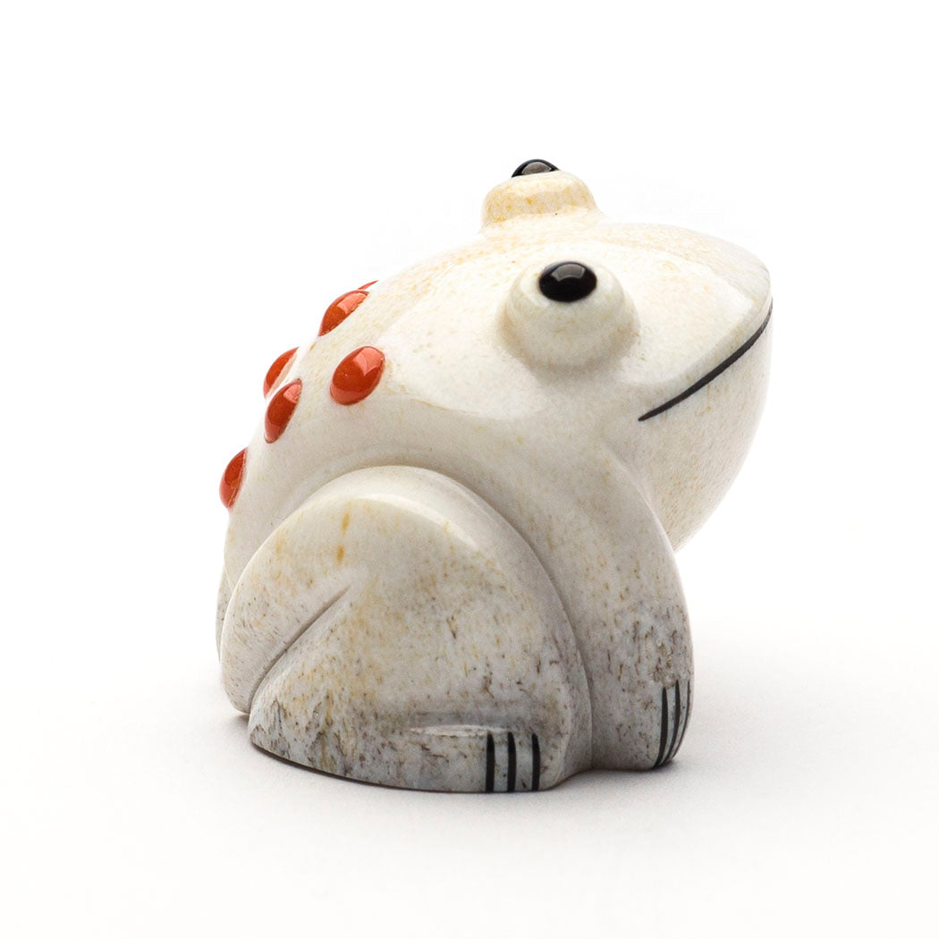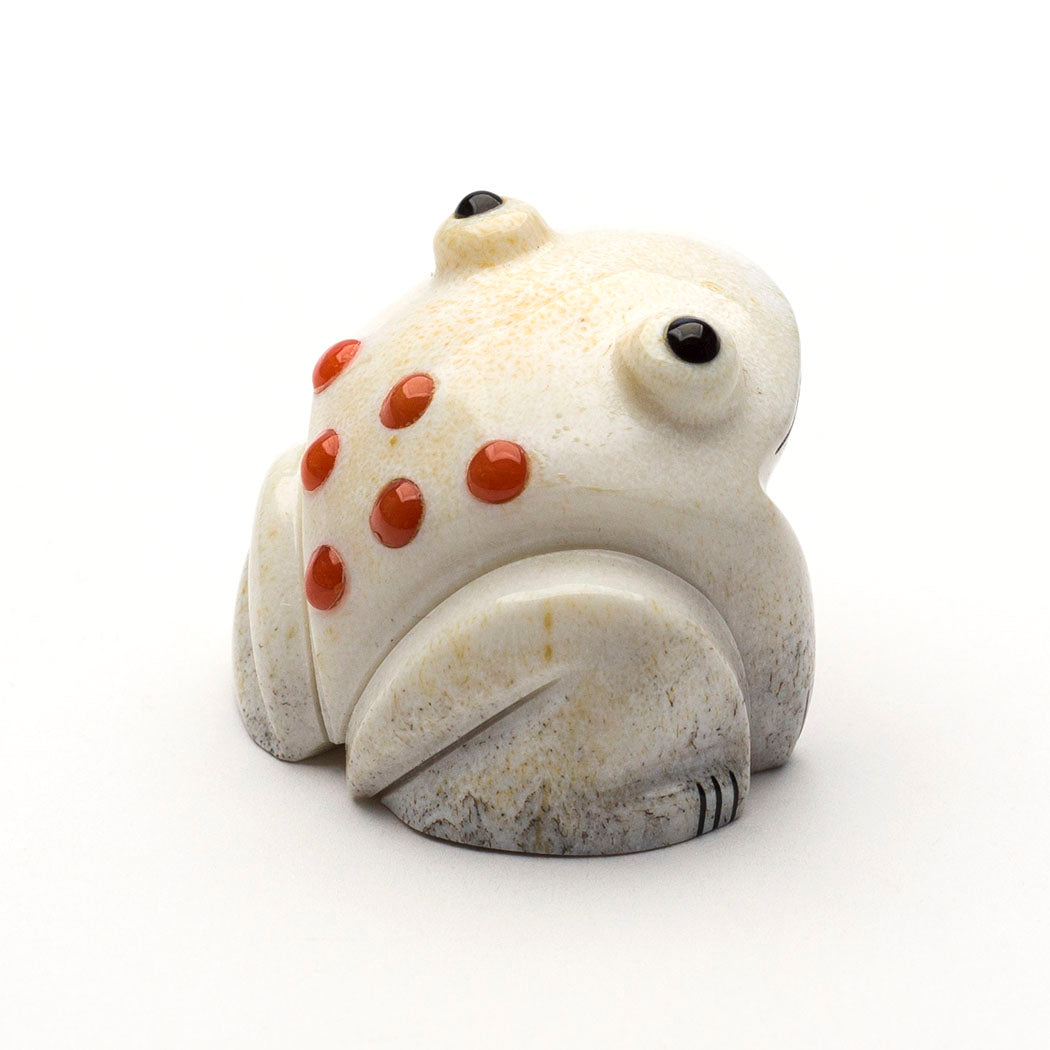 Gabriel Sice descends from the late George Cheechee Haloo family of noted Zuni artists. His brother is fellow carver Troy Sice. Gabriel's Frog friend carved from antler lightens the mood. Sincere eyes are from pen shell inlays. Red coral spots accent the back region and feel neat to glide your fingers over. Webbed feet and a great smile are etched and filled with jet paste. About 1" long, 1 1/8" wide and 1" tall.