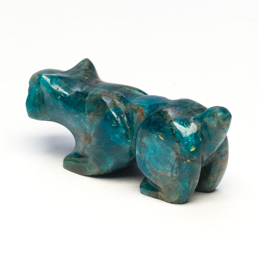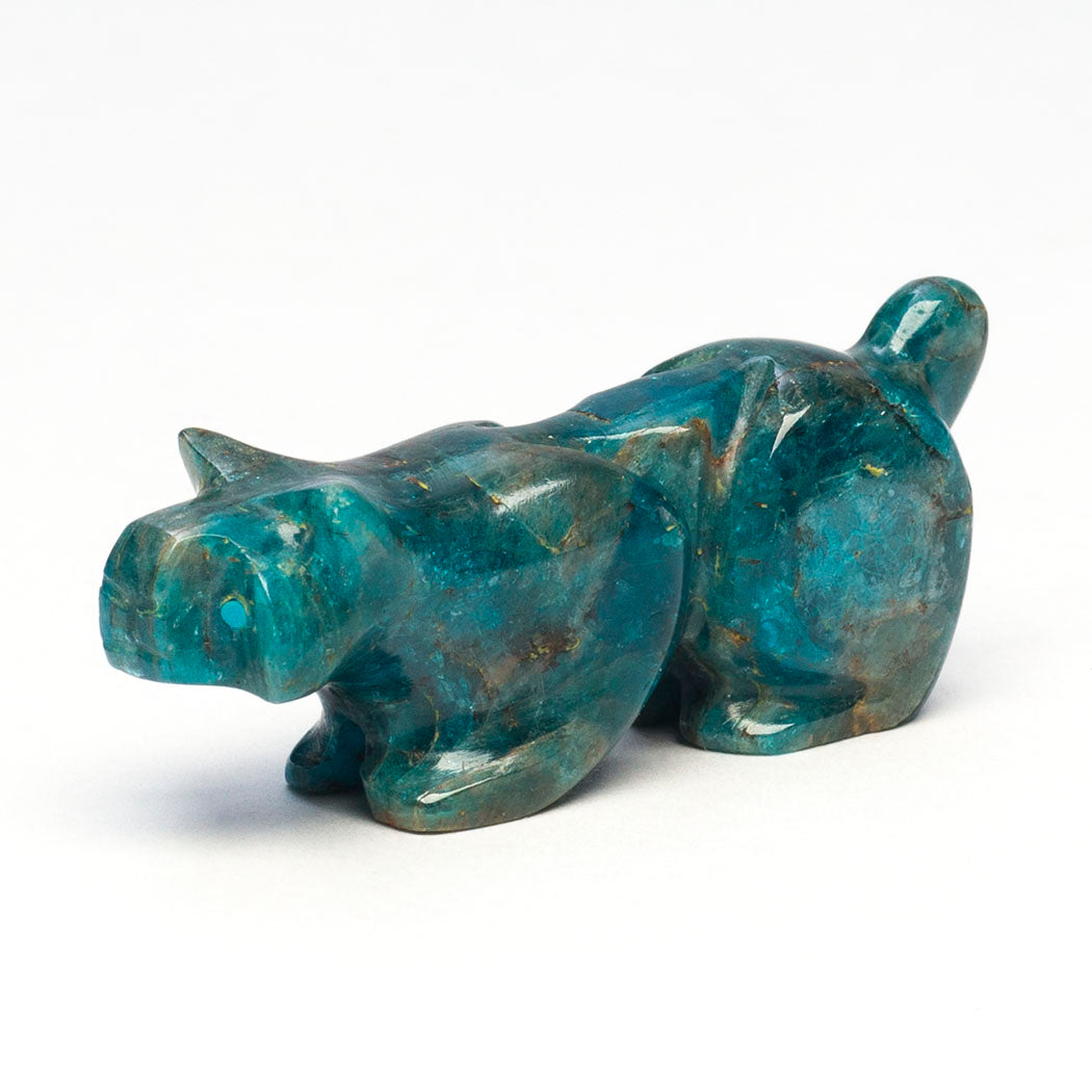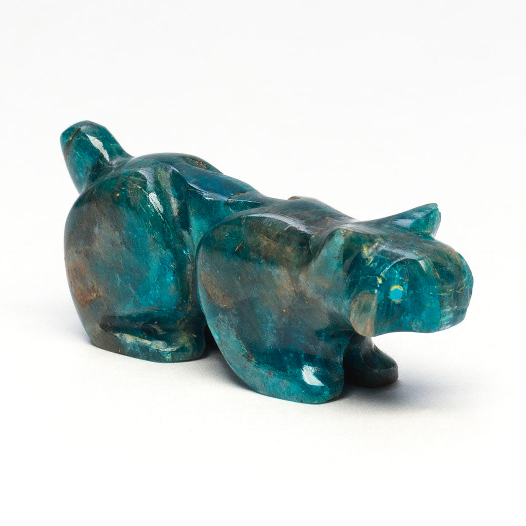Bobcat or wildcat enjoying the cool winter air taking in the spectacular wooded scenery through sweet eyes from turquoise inlays. Apatite is said to encourage truth and clear expression. About 1 7/8" long, 1/2" wide and 3/4" tall.