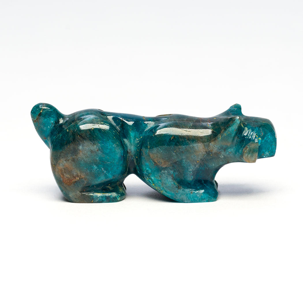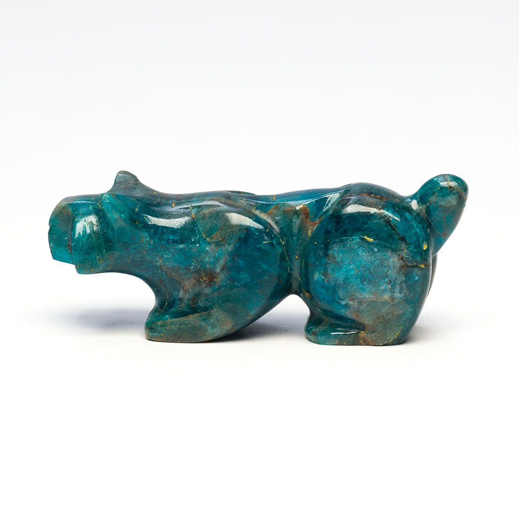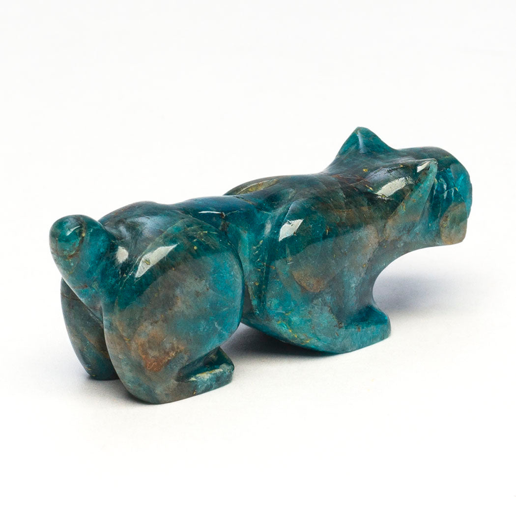 Bobcat or wildcat enjoying the cool winter air taking in the spectacular wooded scenery through sweet eyes from turquoise inlays. Apatite is said to encourage truth and clear expression. About 1 7/8" long, 1/2" wide and 3/4" tall.