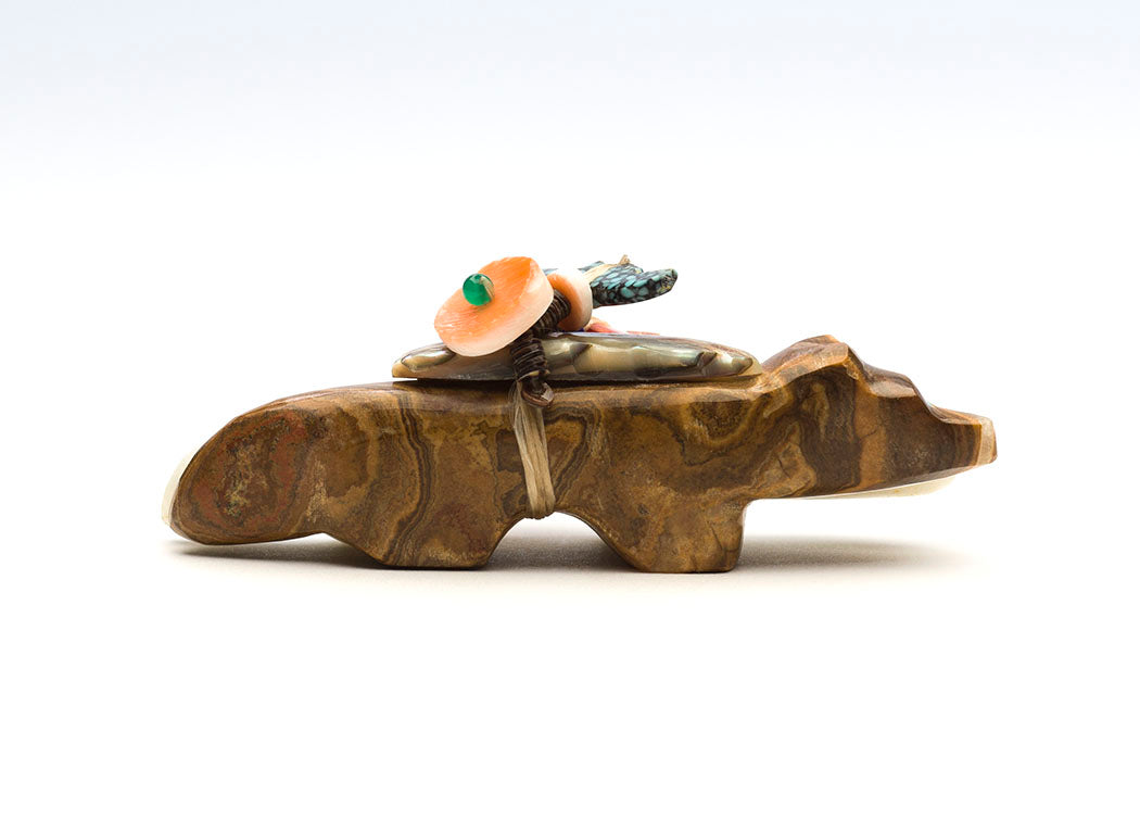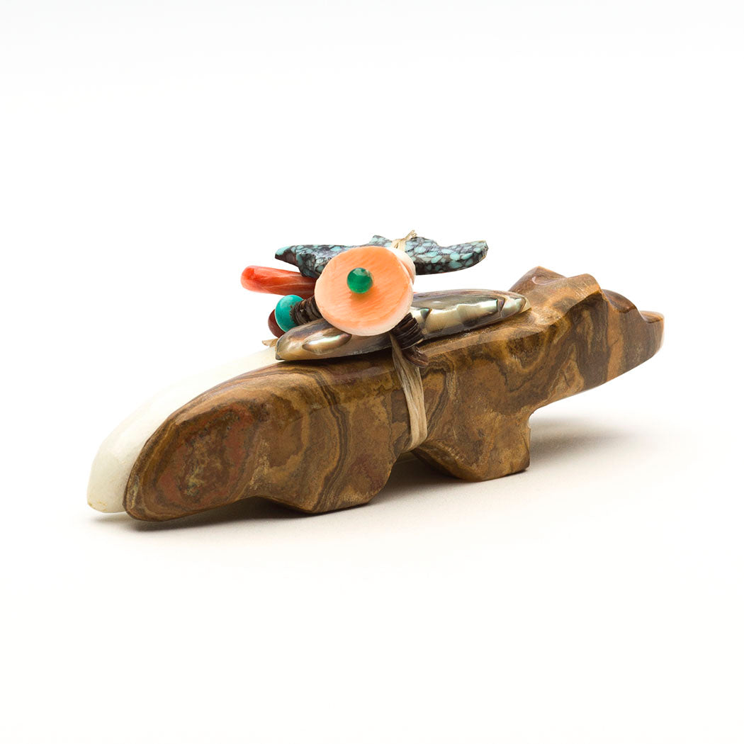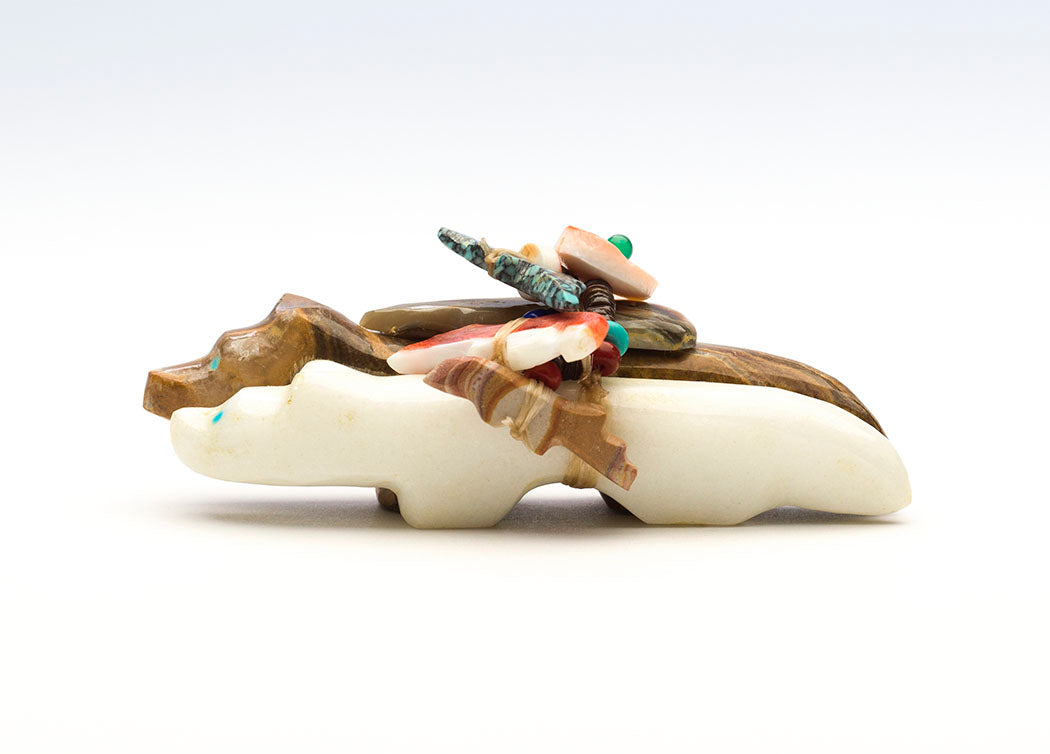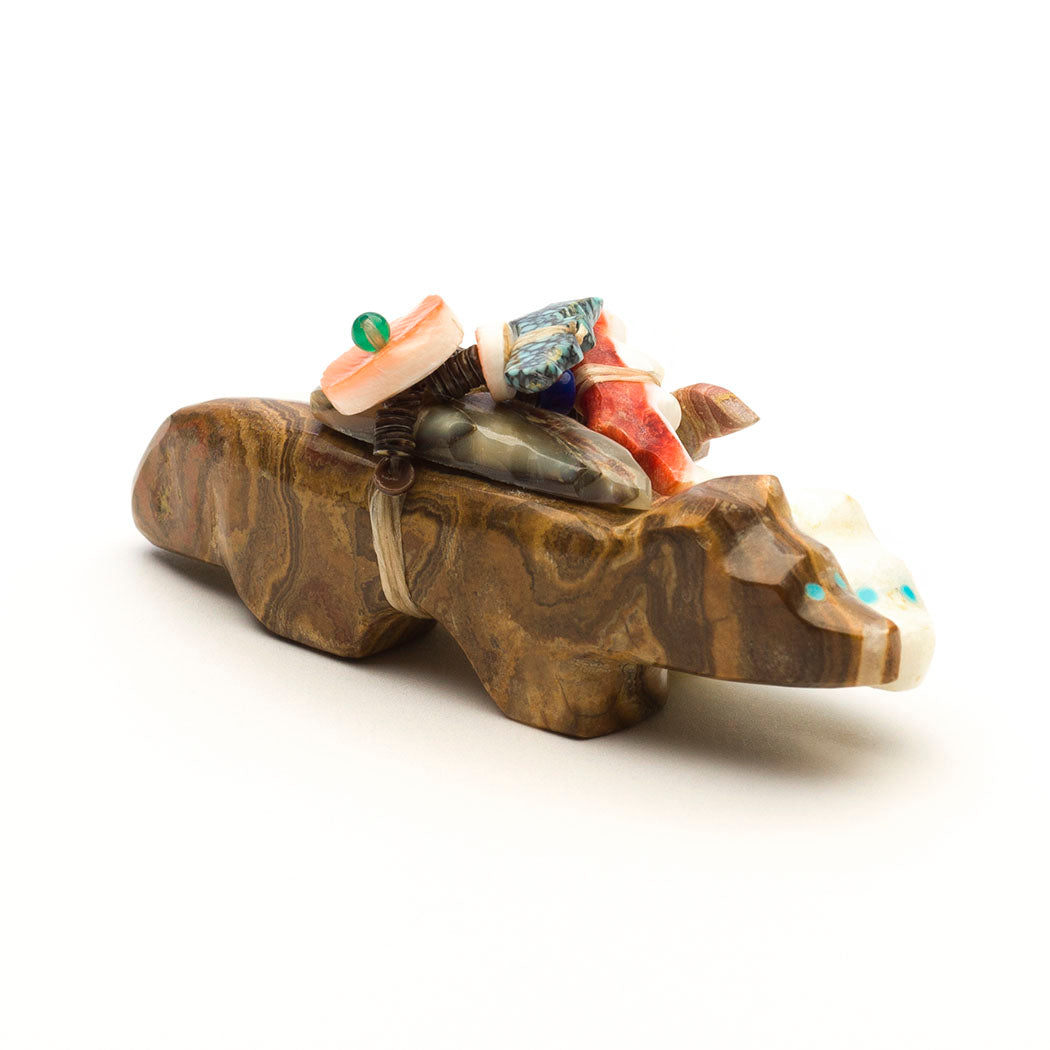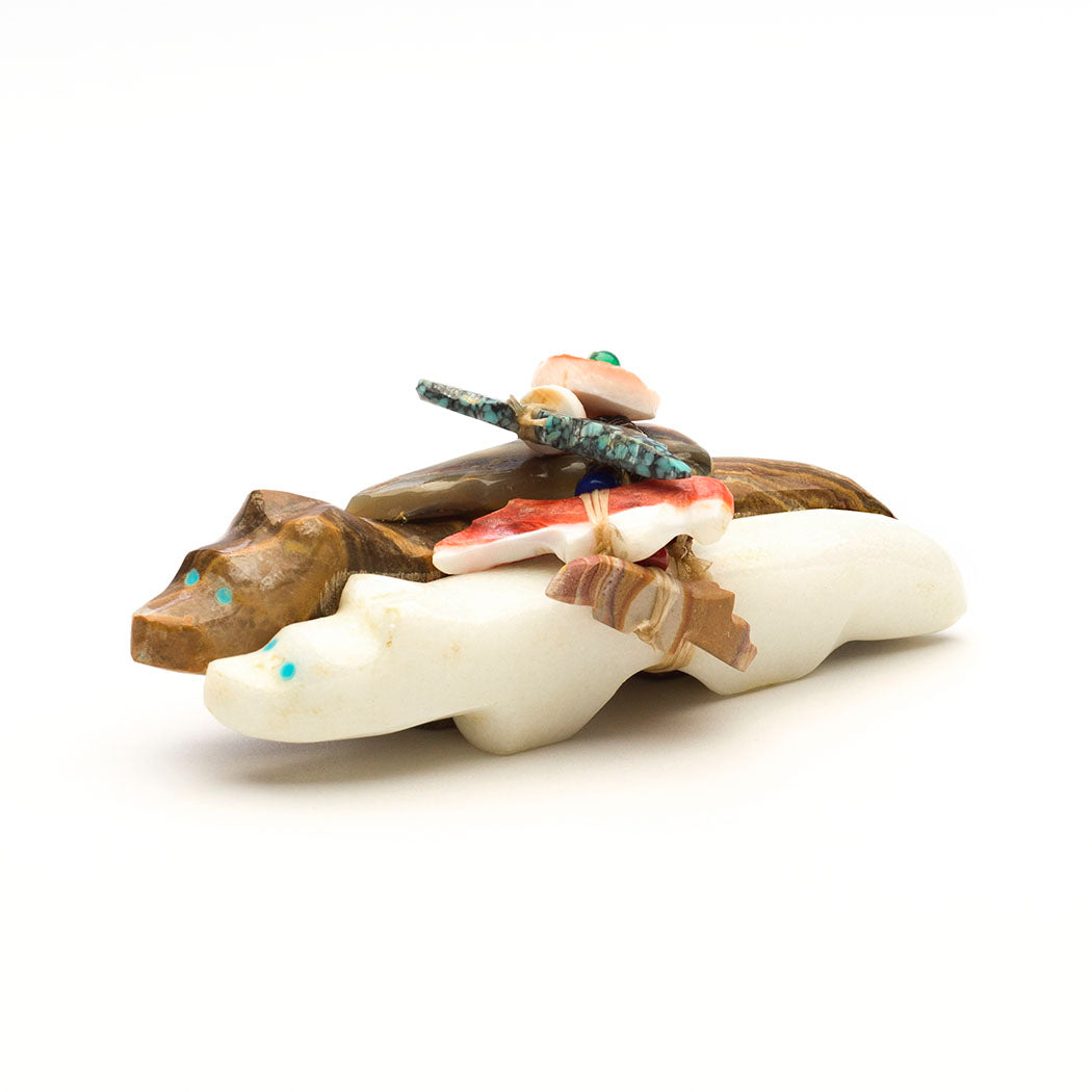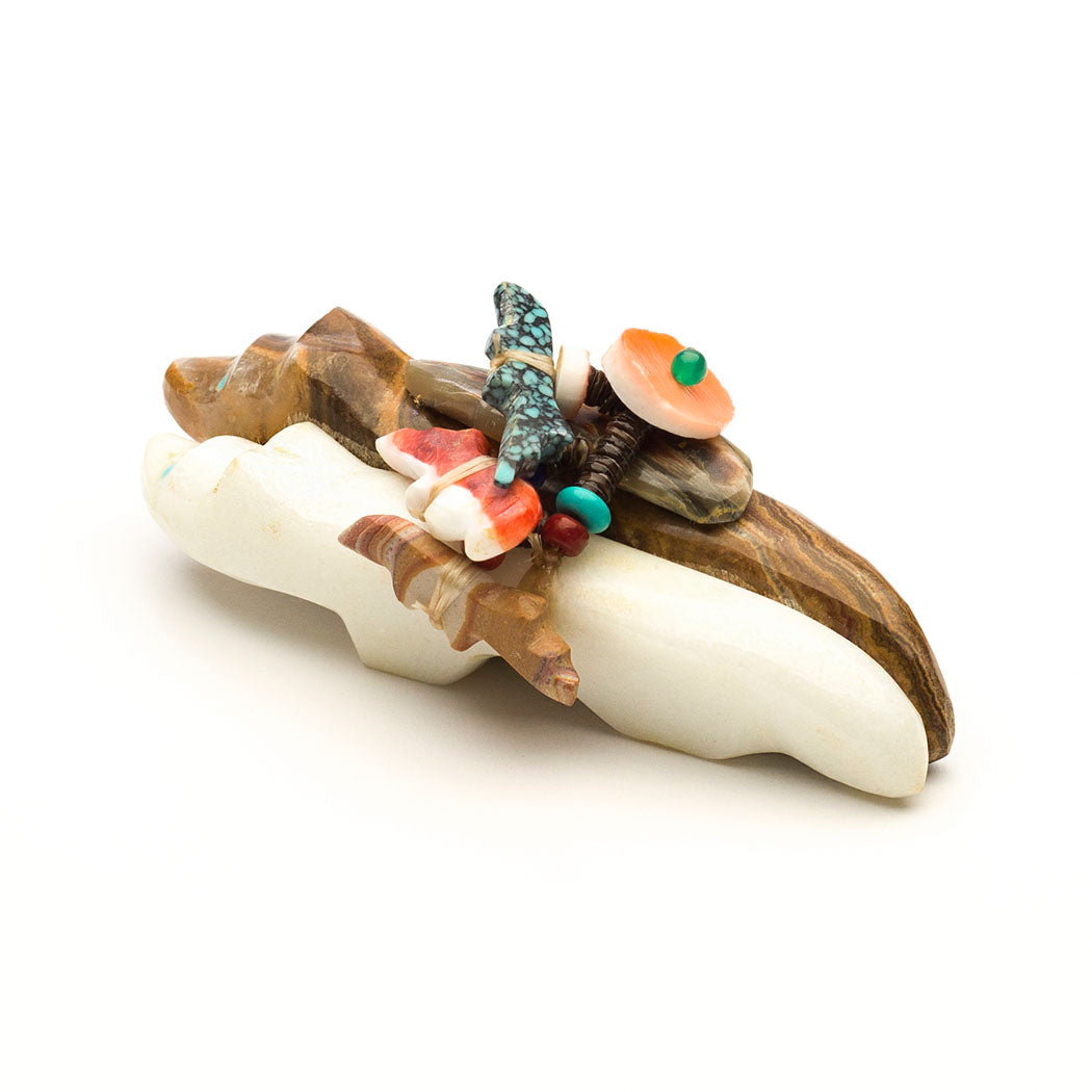 A wonderful Fox (Wolf or Coyote) family is carved by Jayne Quam. Turquoise eyes are inlaid to the onyx and marble parents, while the precious babies are sculpted from spiny oyster shell, rhyolite and matrix-rich turquoise. A lovely black lip shell or perhaps abalone point, melon shell and assorted colorful beads accompany them. We can advocate for policies that support legislation protecting wild canine habitats and assist in mitigating human-wildlife conflicts. About 3 3/8" long, 1 3/8" wide and 1 3/8" tall.